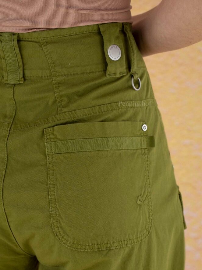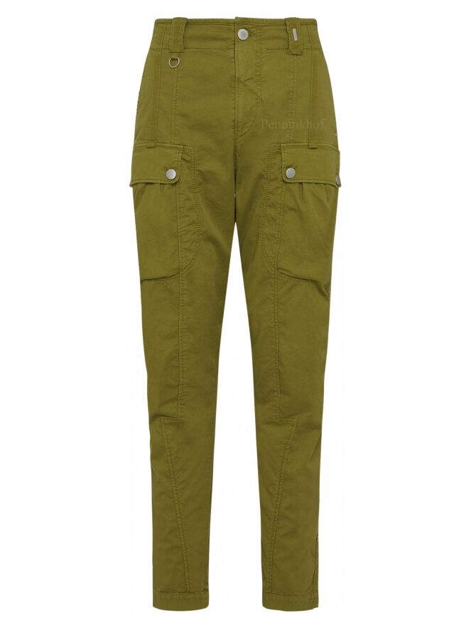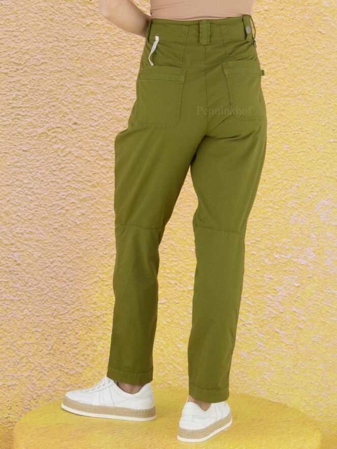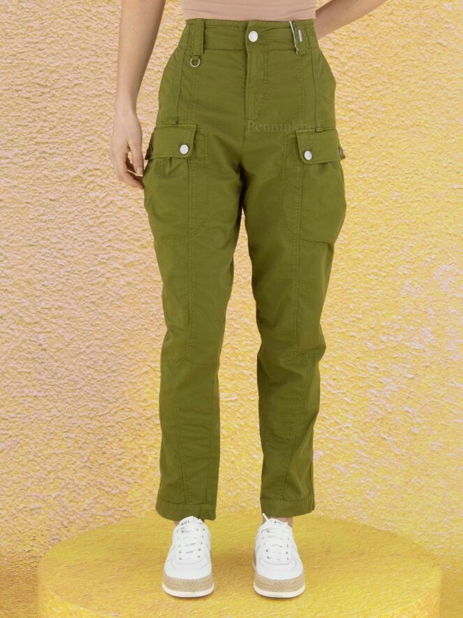 Pantalon à jambes élancées, de la marque High, de couleur vert pistache. Le pantalon est doté de poches fendues latérales, de grandes poches à rabat boutonné sur la cuisse et plaquées au dos. Le pantalon est orné de coutures avant et arrière. Lavage à la main.