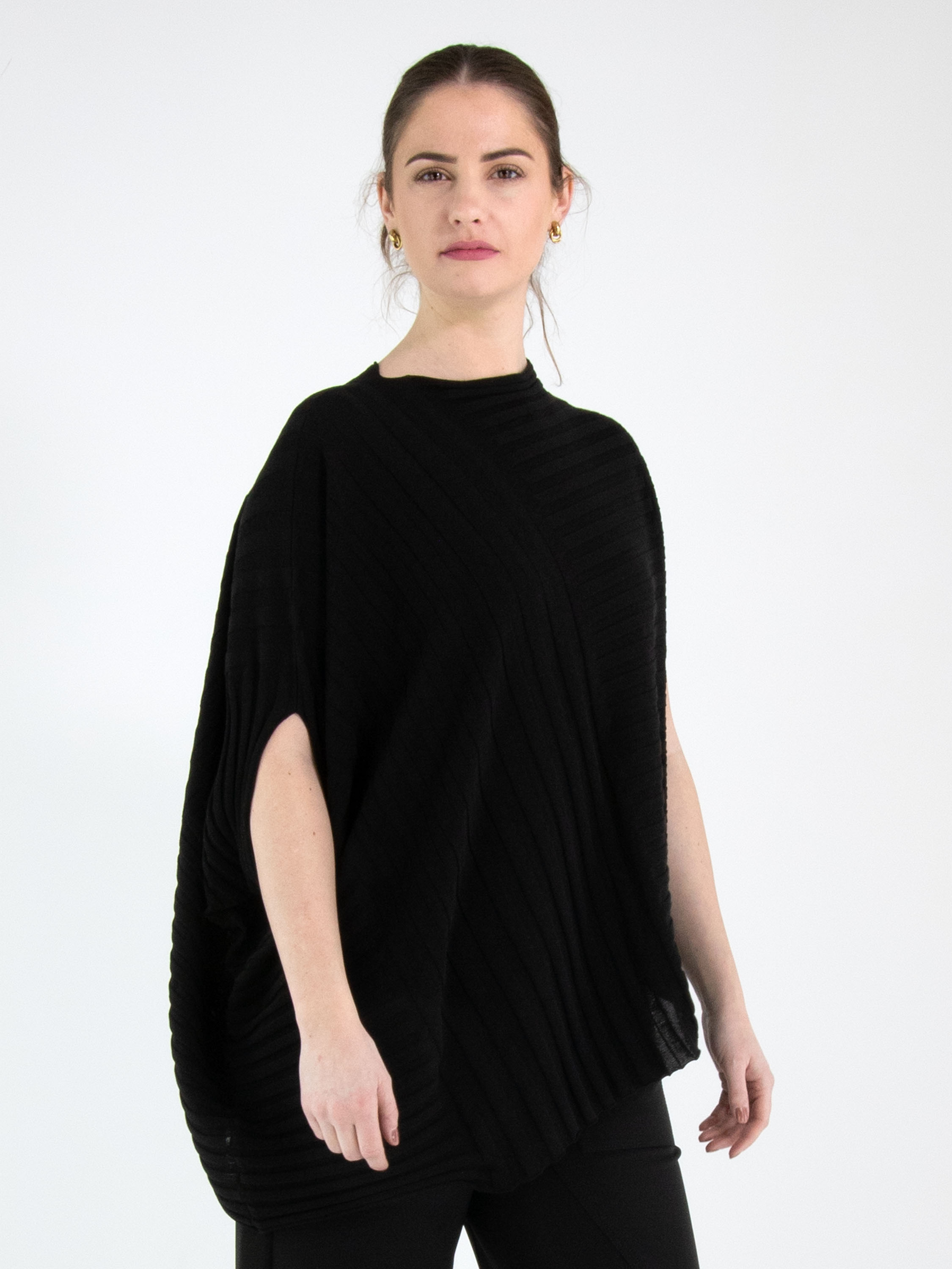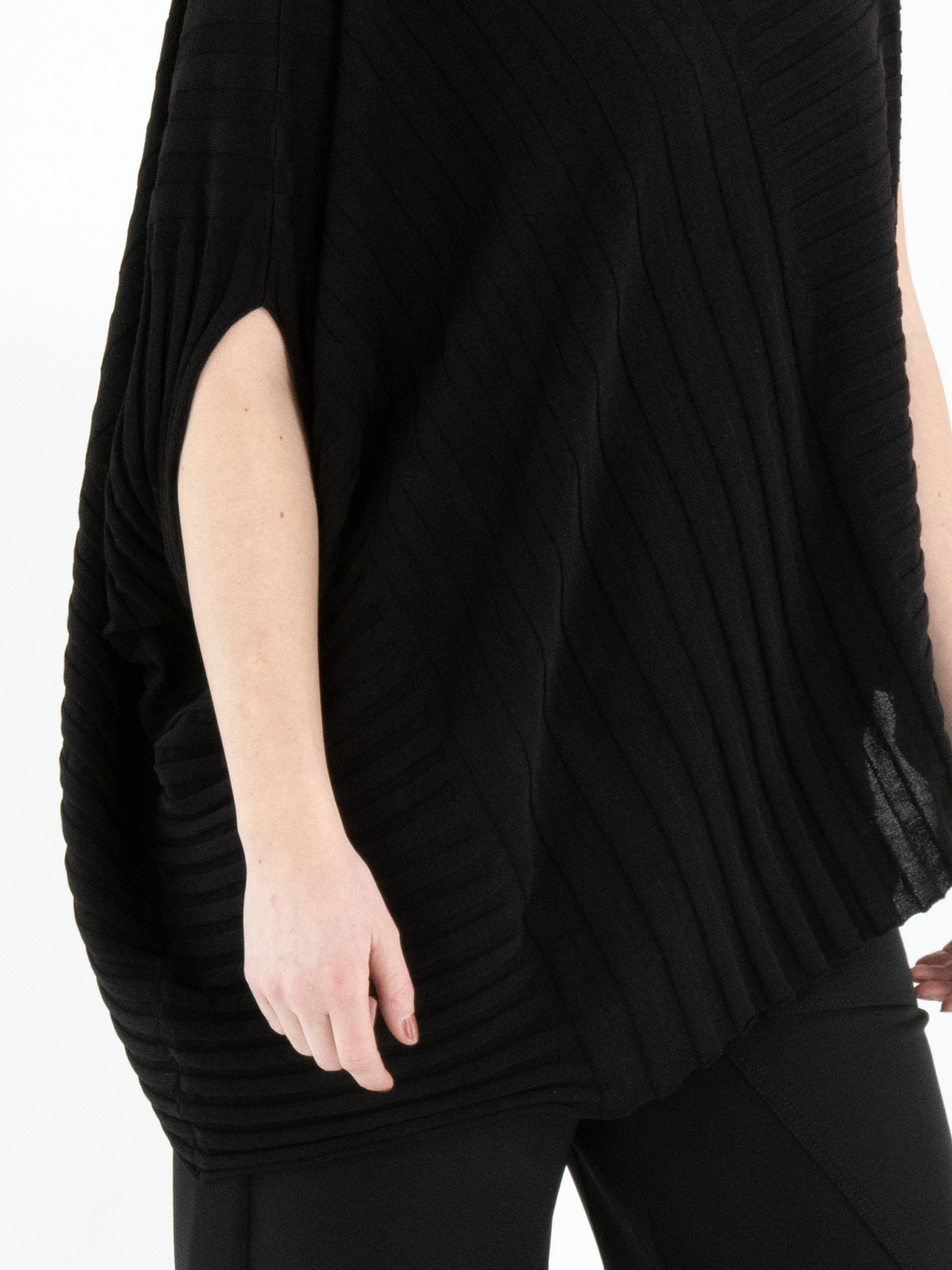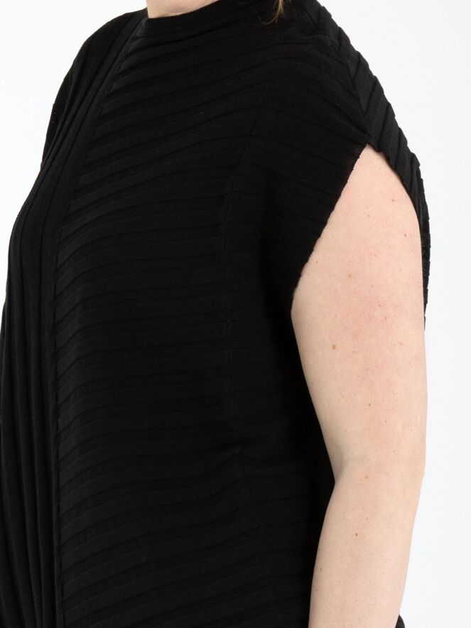 Un pull de High Tech avec un motif à rayures diagonales de couleur noire. Le bas du pull est également coupé en biais. Le pull possède une encolure ronde et peut être lavé à la main.