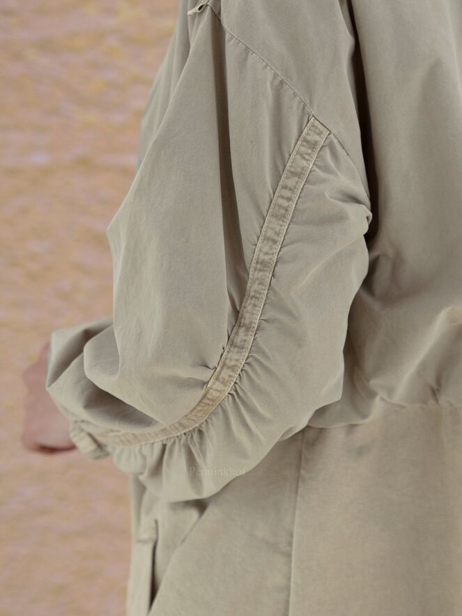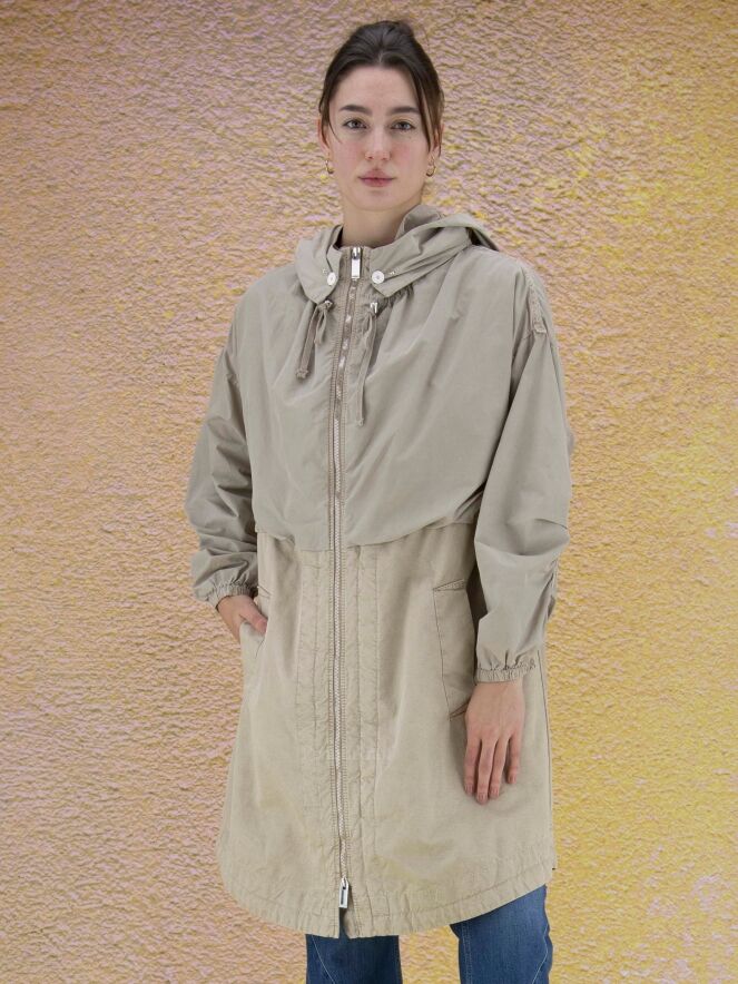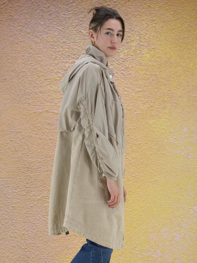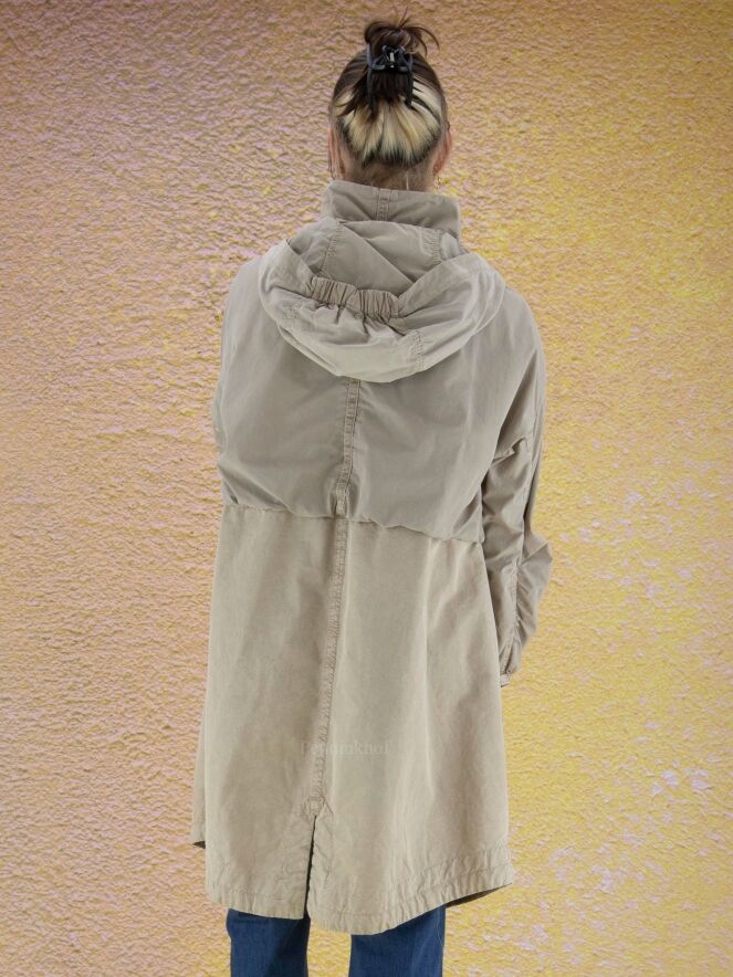 Parka mi longue à capuche déboutonnable de la marque High, à deux teintes de la couleur sable. Au-dessus de la taille, le tissu doux est de couleur sable clair. En dessous, la parka est couleur sable. L’ajustement à la taille est réglé par un cordon de serrage intégré. Les épaules et le haut des manches sont traversés par un passepoil délicatement plissé. L'extrémité des manches est bordée par un élastique. Le manteau possède une fermeture Eclair argentée et des poches latérales. Lavage déconseillé.