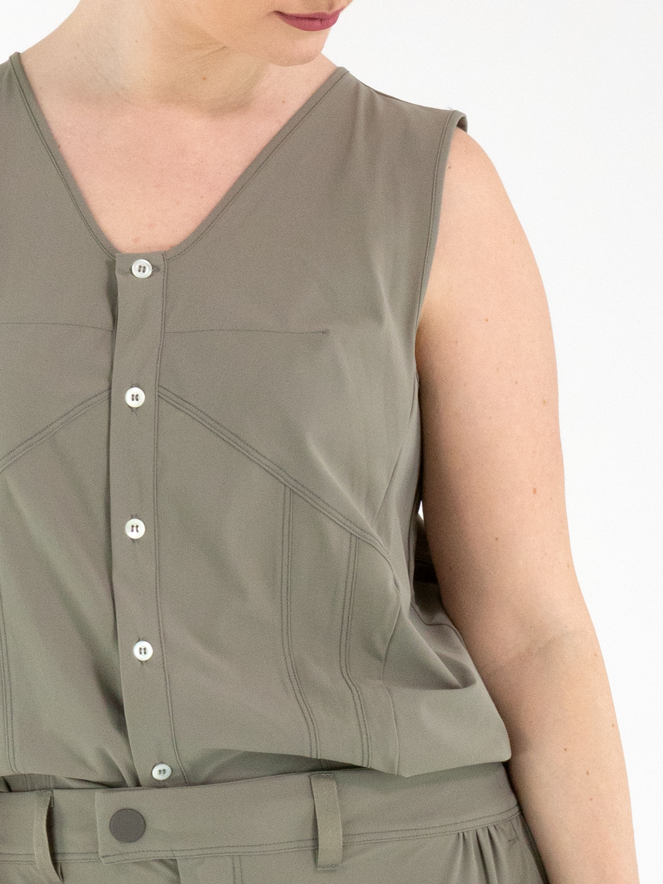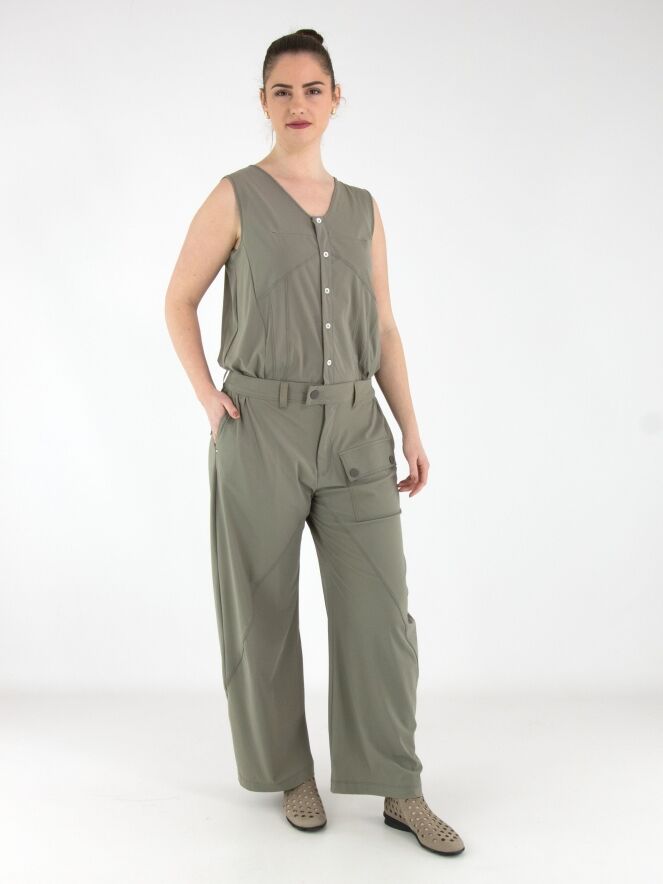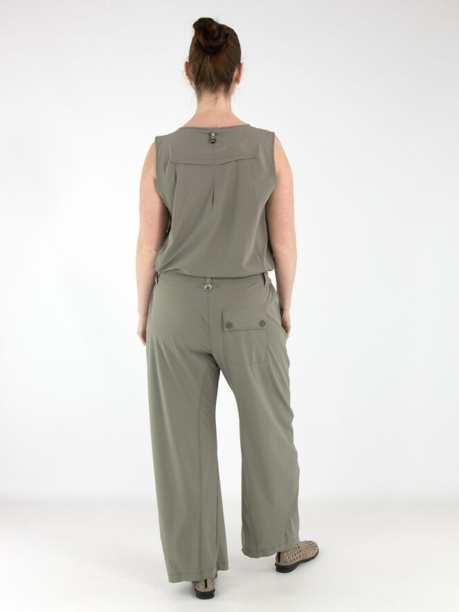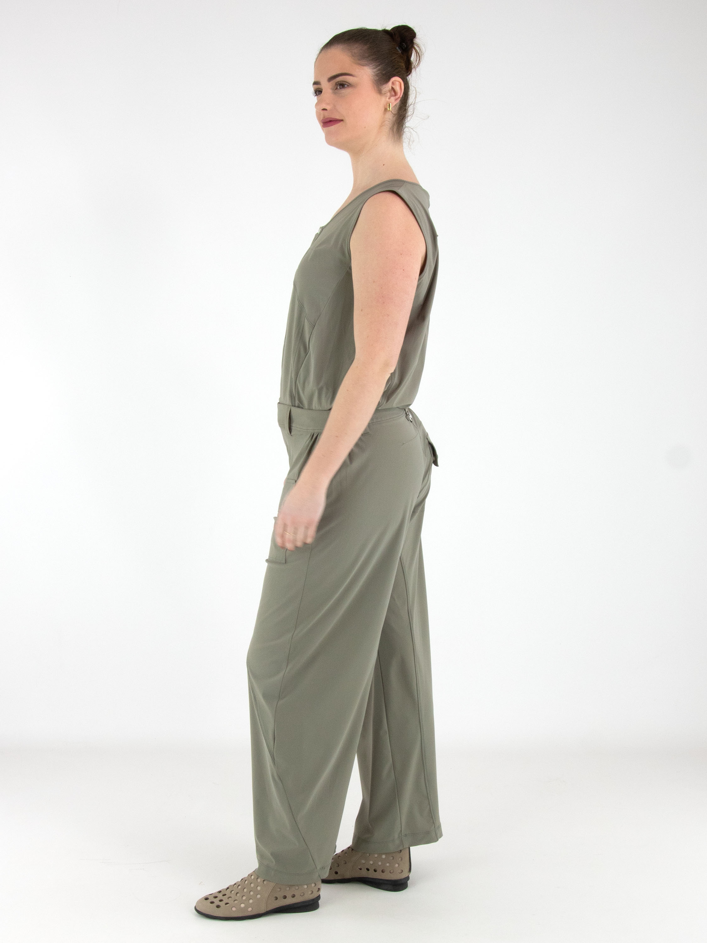 Une combinaison de High dans une teinte vert olive douce. Depuis le décolleté en V, une fermeture boutonnée descend jusqu’à la taille. À partir de la taille, une courte fermeture éclair est intégrée. La taille est soulignée par une ceinture montante avec des plis fins sur les côtés. Sous la taille, des poches latérales sont présentes. Les jambes sont droites. Cette combinaison peut être lavée à 30 degrés.