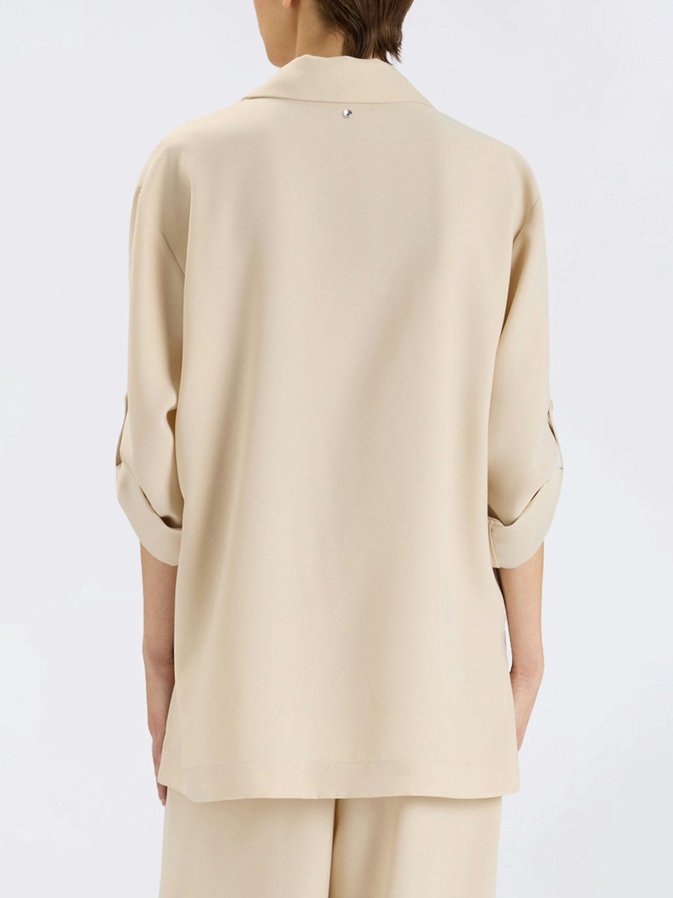 Le blazer se ferme par quatre boutons et présente une poche poitrine bordée d’un tissu satin mat, apportant un contraste raffiné. Les manches peuvent être retroussées et maintenues par une petite patte avec bouton. Cet ensemble doit être lavé à la main.