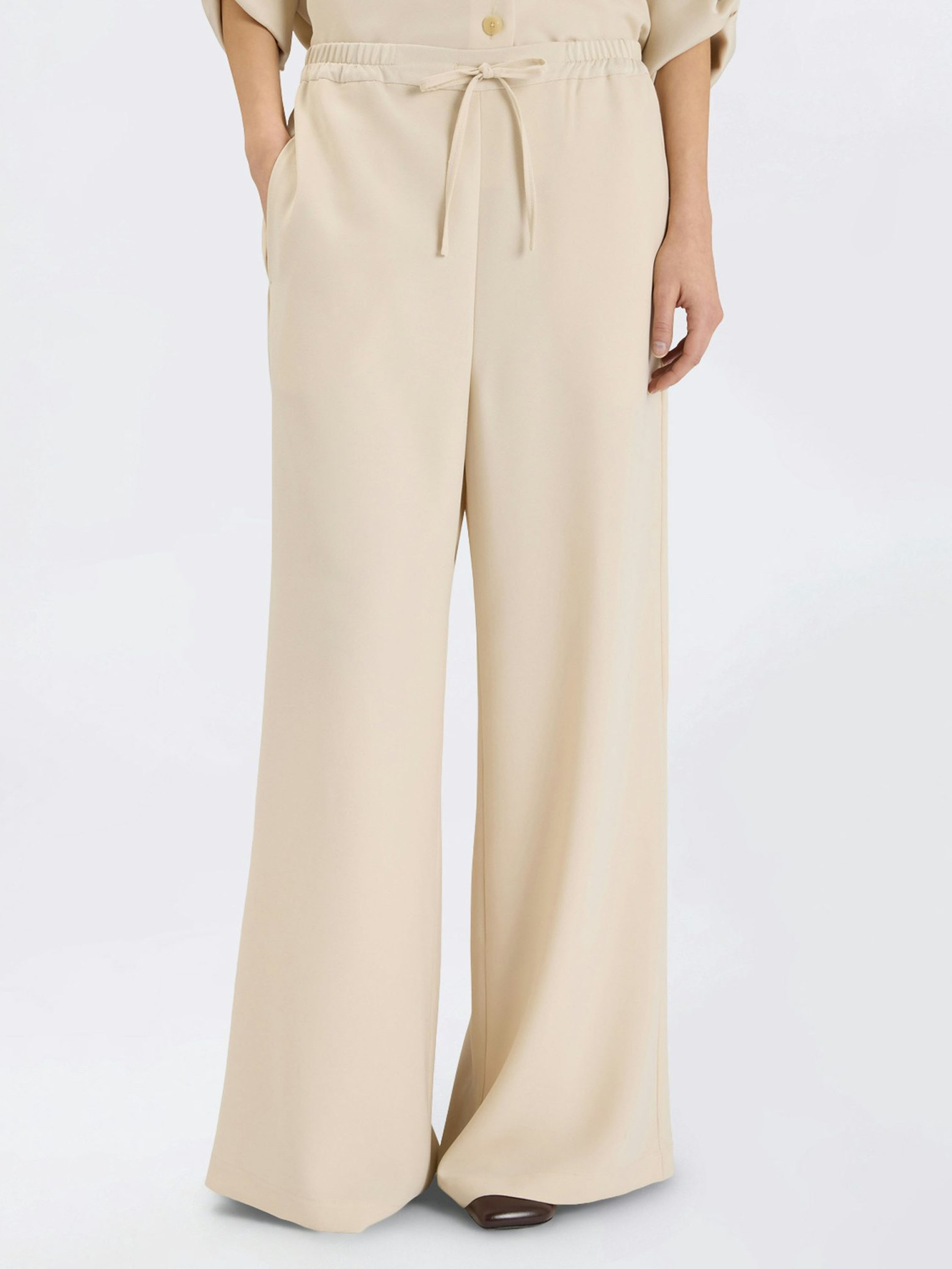 Ensemble pantalon de High dans une élégante teinte beige. Le pantalon possède une taille élastique avec un tissu finement plissé. Un cordon coulissant en tunnel permet d’ajuster la taille pour un porté confortable. Les jambes larges créent une silhouette fluide et contemporaine.