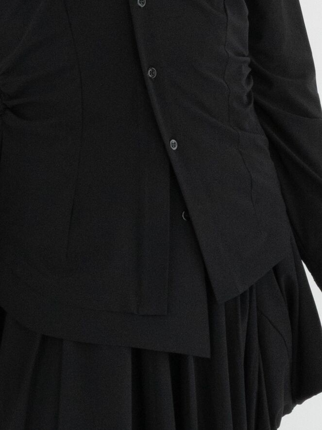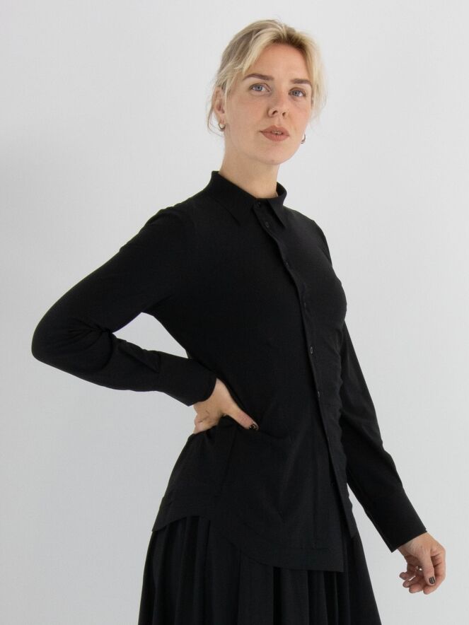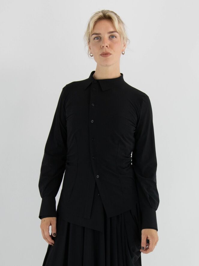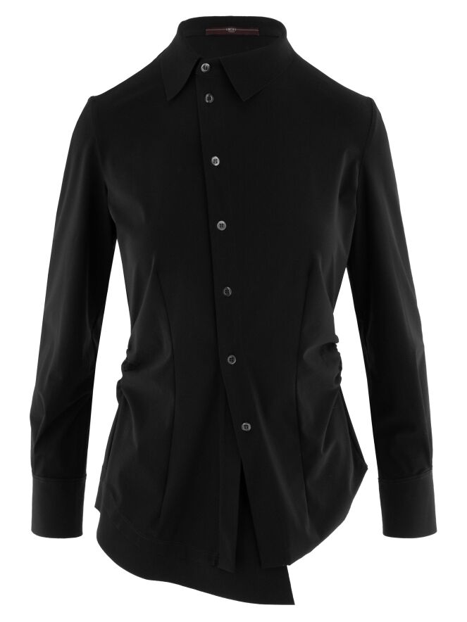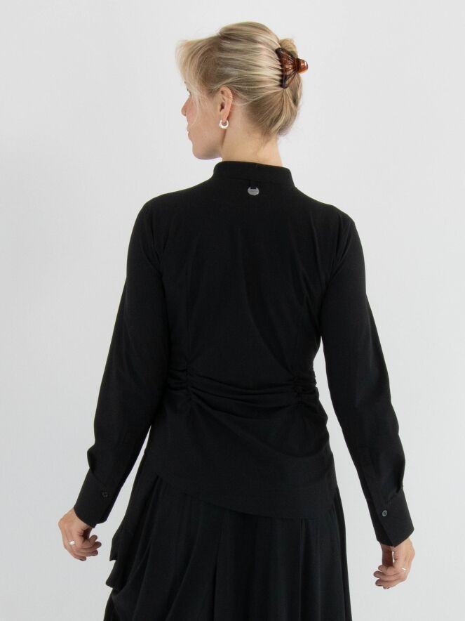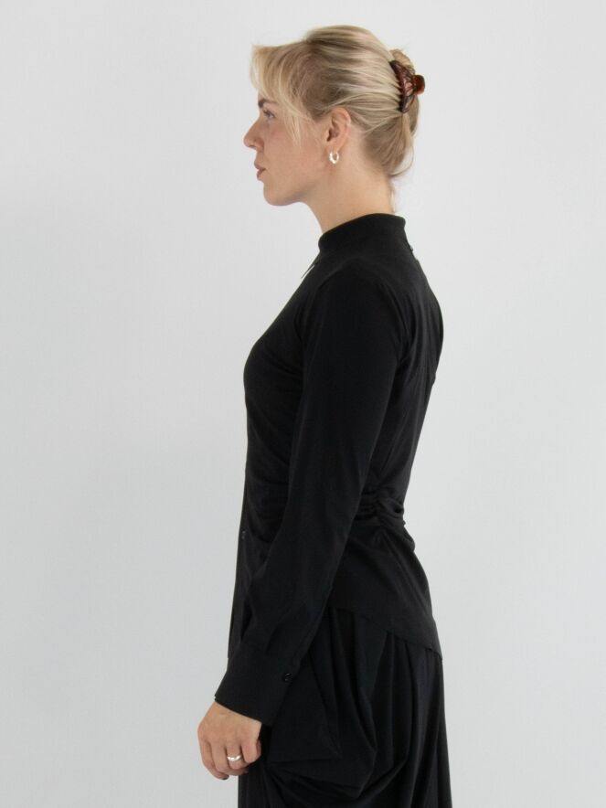 Blouse de la marque High en noir. Le tissu est finement plissé sur les côtés et au niveau des coutures de taille à l’arrière. Cette blouse a des manches longues et doit être lavée à la main.
