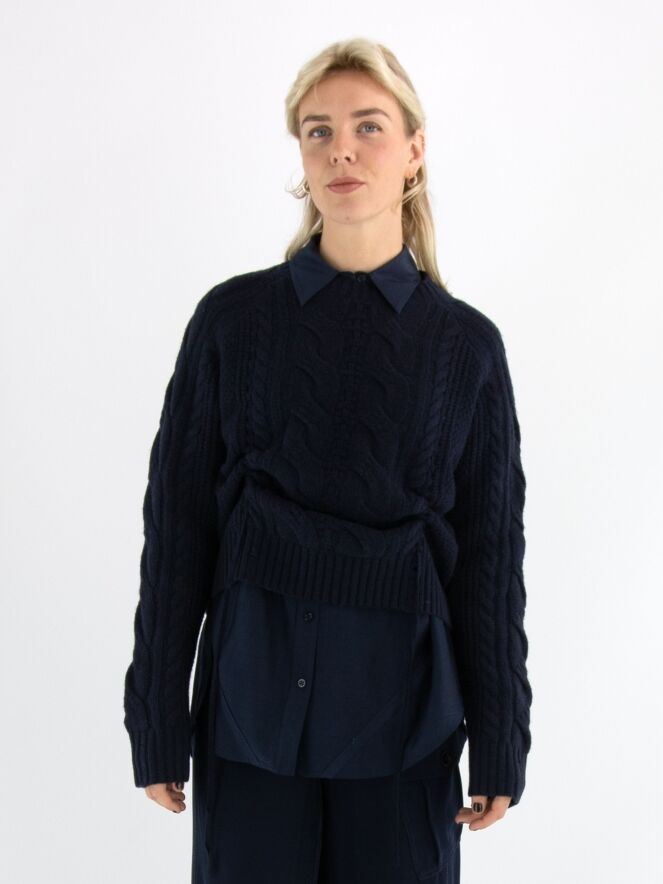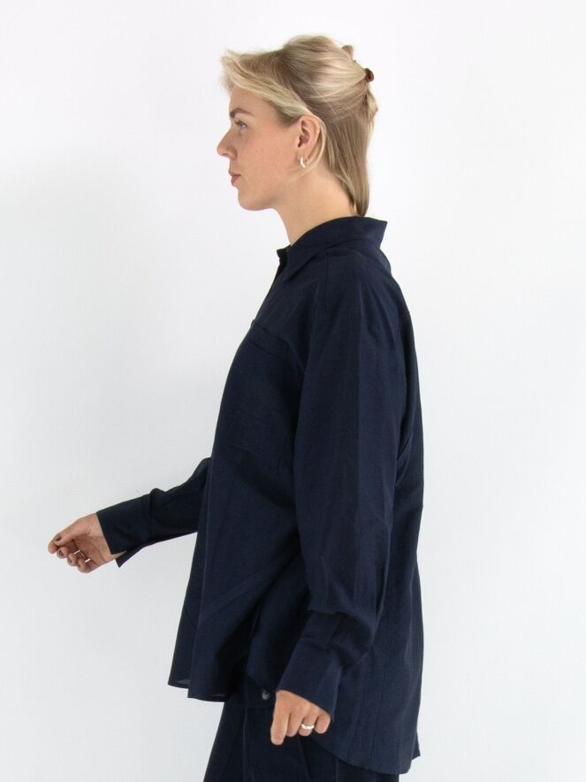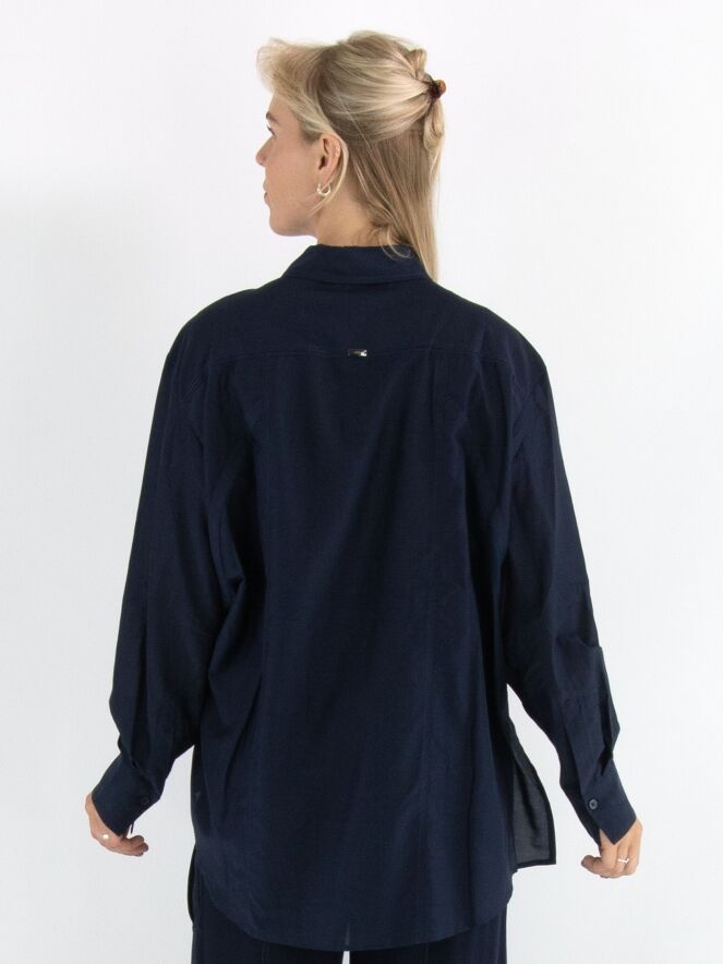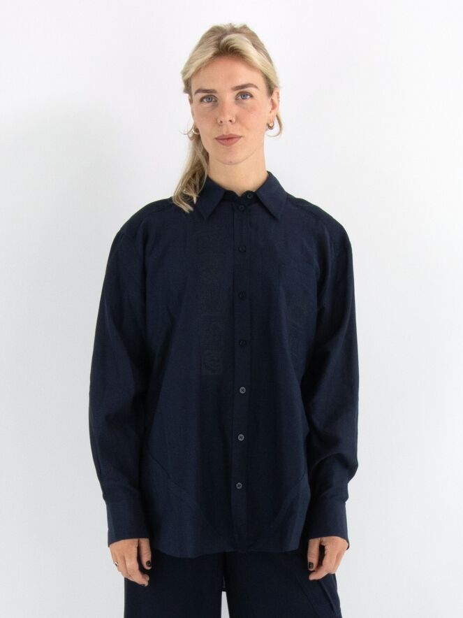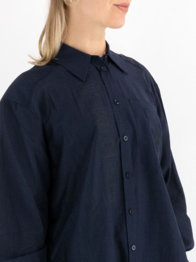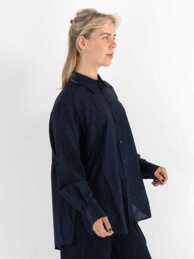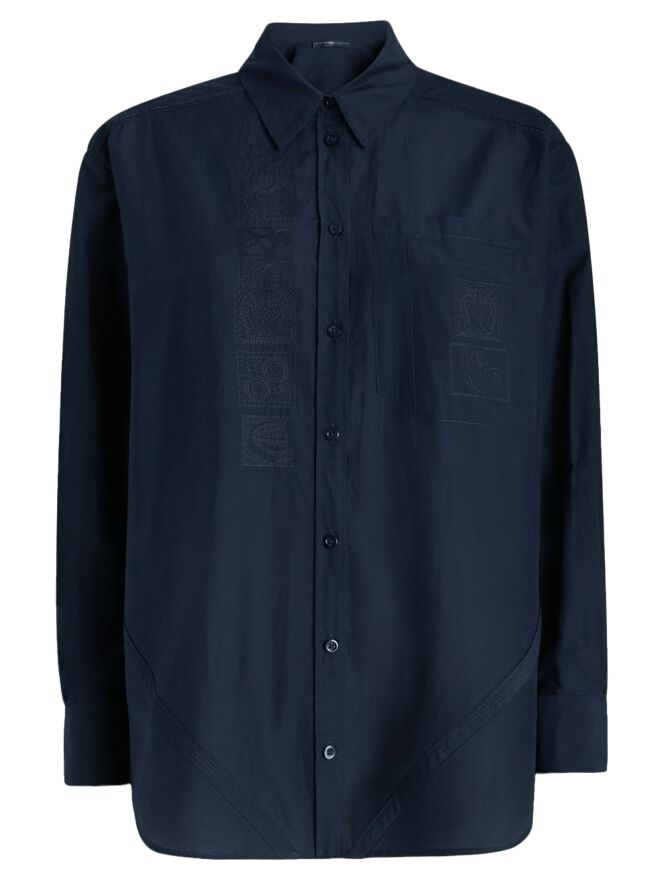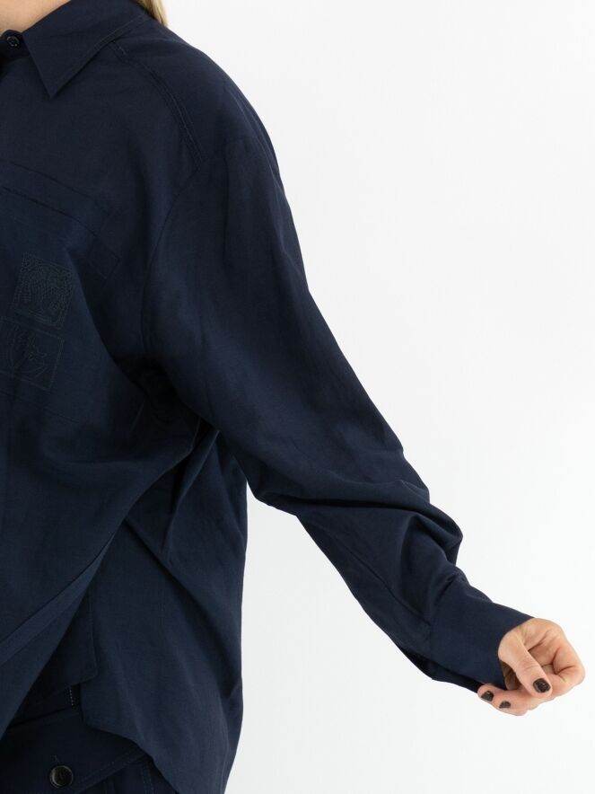 Blouse ample de la marque High en bleu marine. À l’avant, plusieurs petits carrés présentent des motifs floraux brodés. Une fente est présente de chaque côté en bas. Cette blouse doit être lavée à la main.