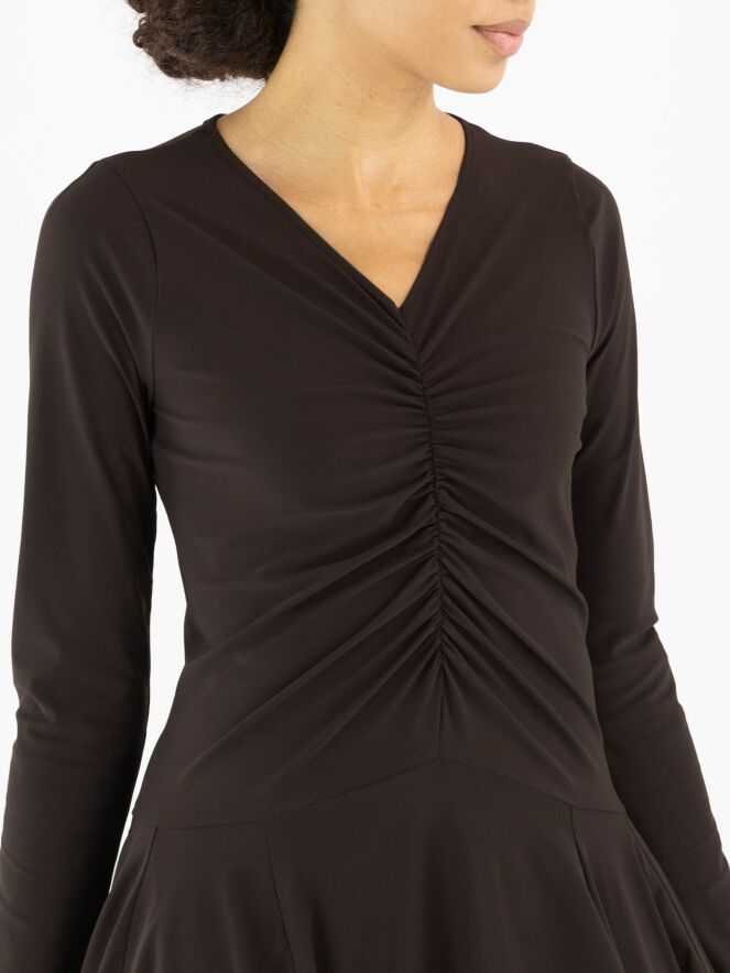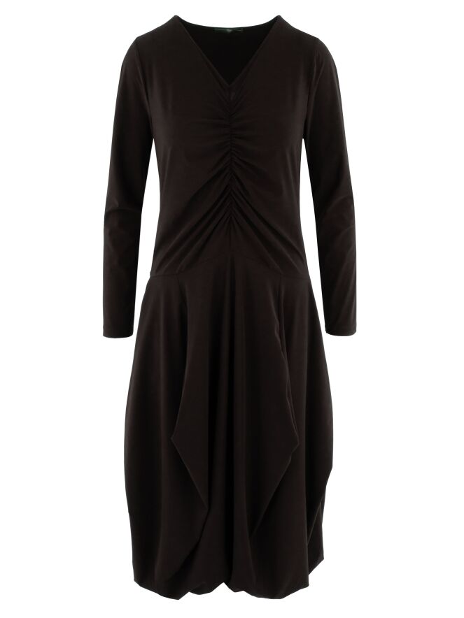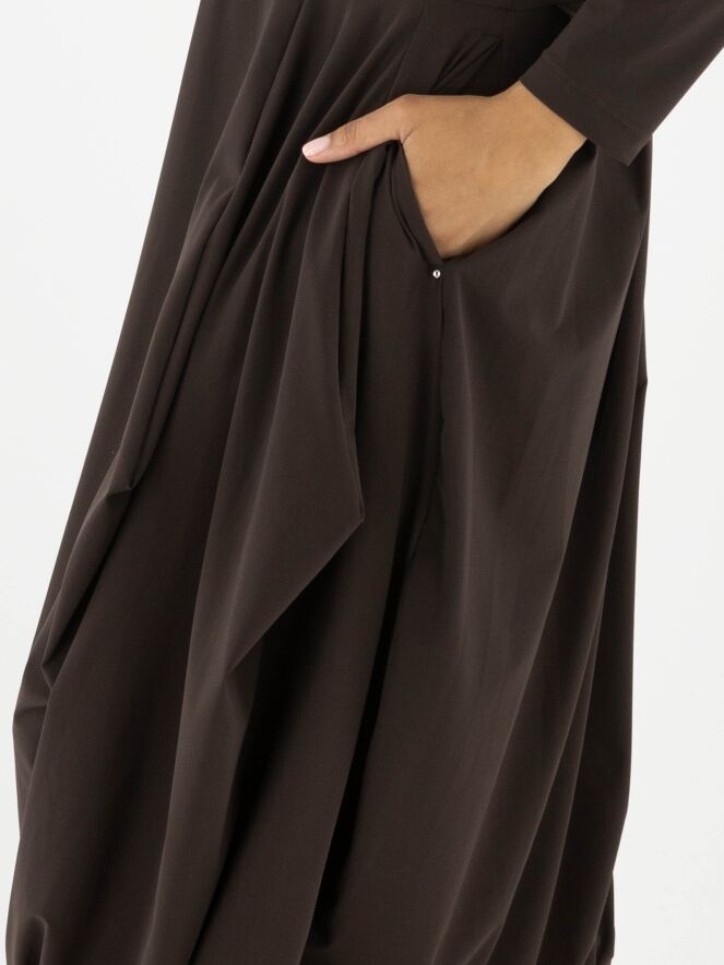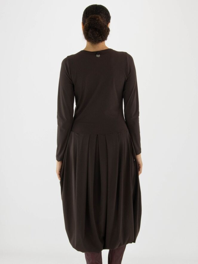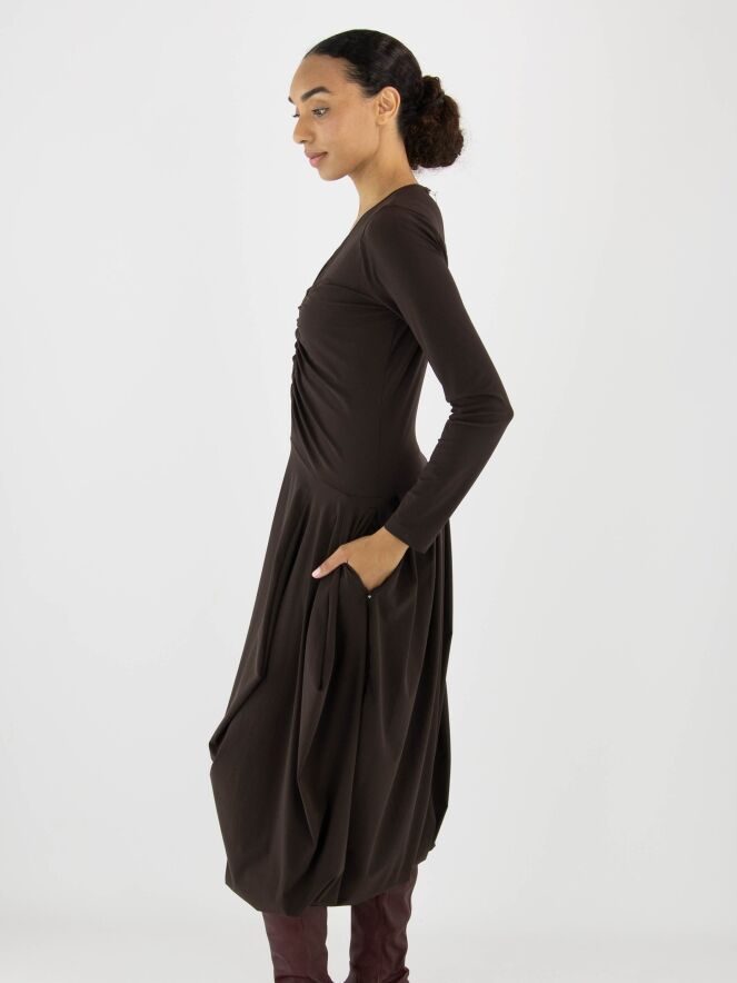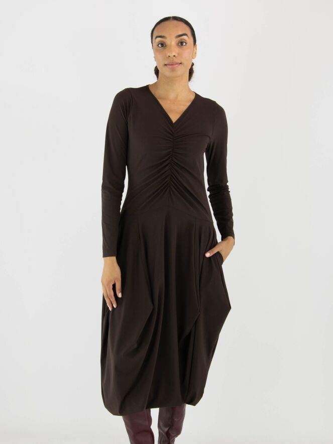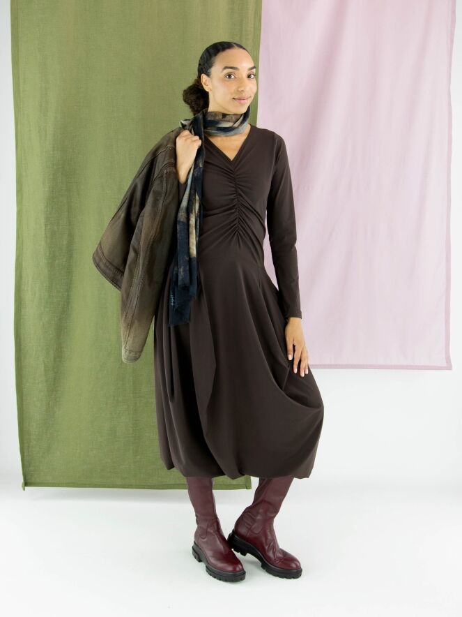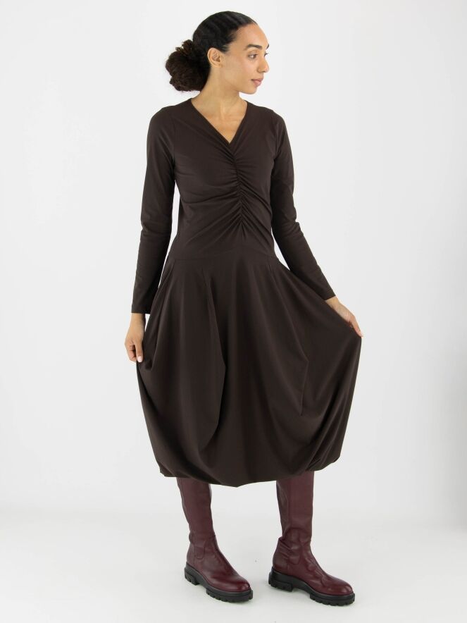 Robe de la marque High en couleur aubergine. Elle présente un décolleté en V et des manches longues. Une couture part du centre du col en V vers le bas, accompagnée de fronces délicates. L’ourlet est froncé avec un fil élastique, créant un effet ballon. Des poches sont intégrées à hauteur de taille. À l’arrière, une couture au niveau de la taille est soulignée de plis. Cette robe peut être lavée à 30 degrés.