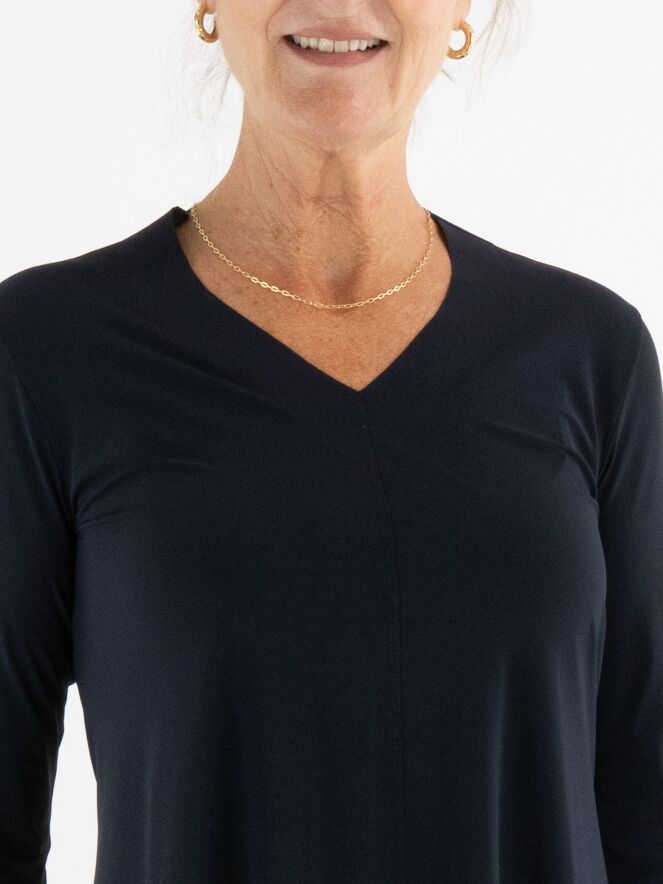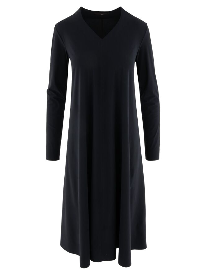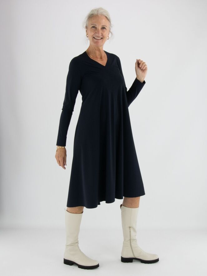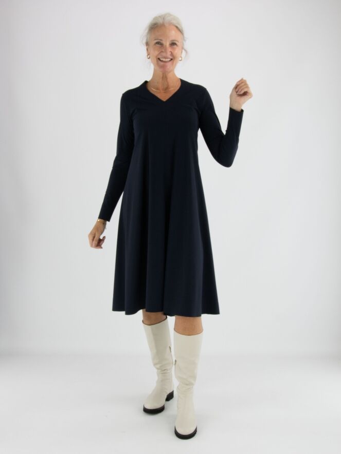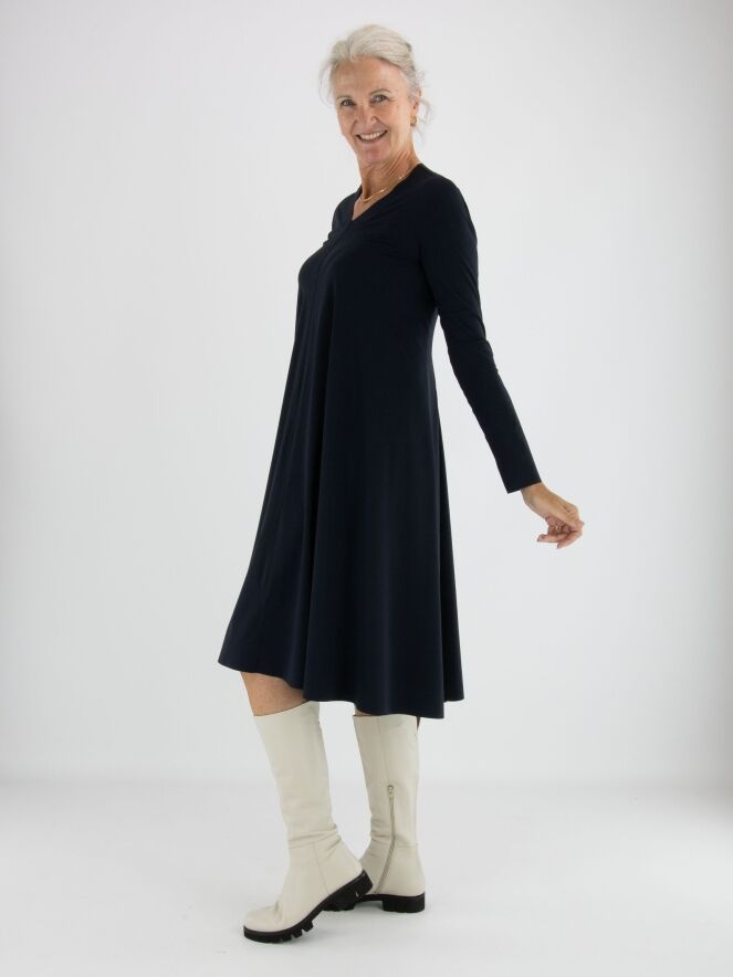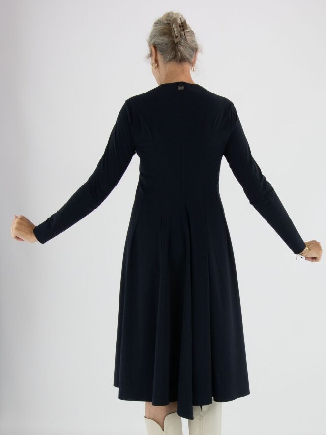 Robe de la marque High en bleu marine. Elle présente un col en V haut et des manches longues. À l’arrière, plusieurs plis partant de la taille créent un effet ondulé. La robe a une coupe évasée et doit être lavée à la main.