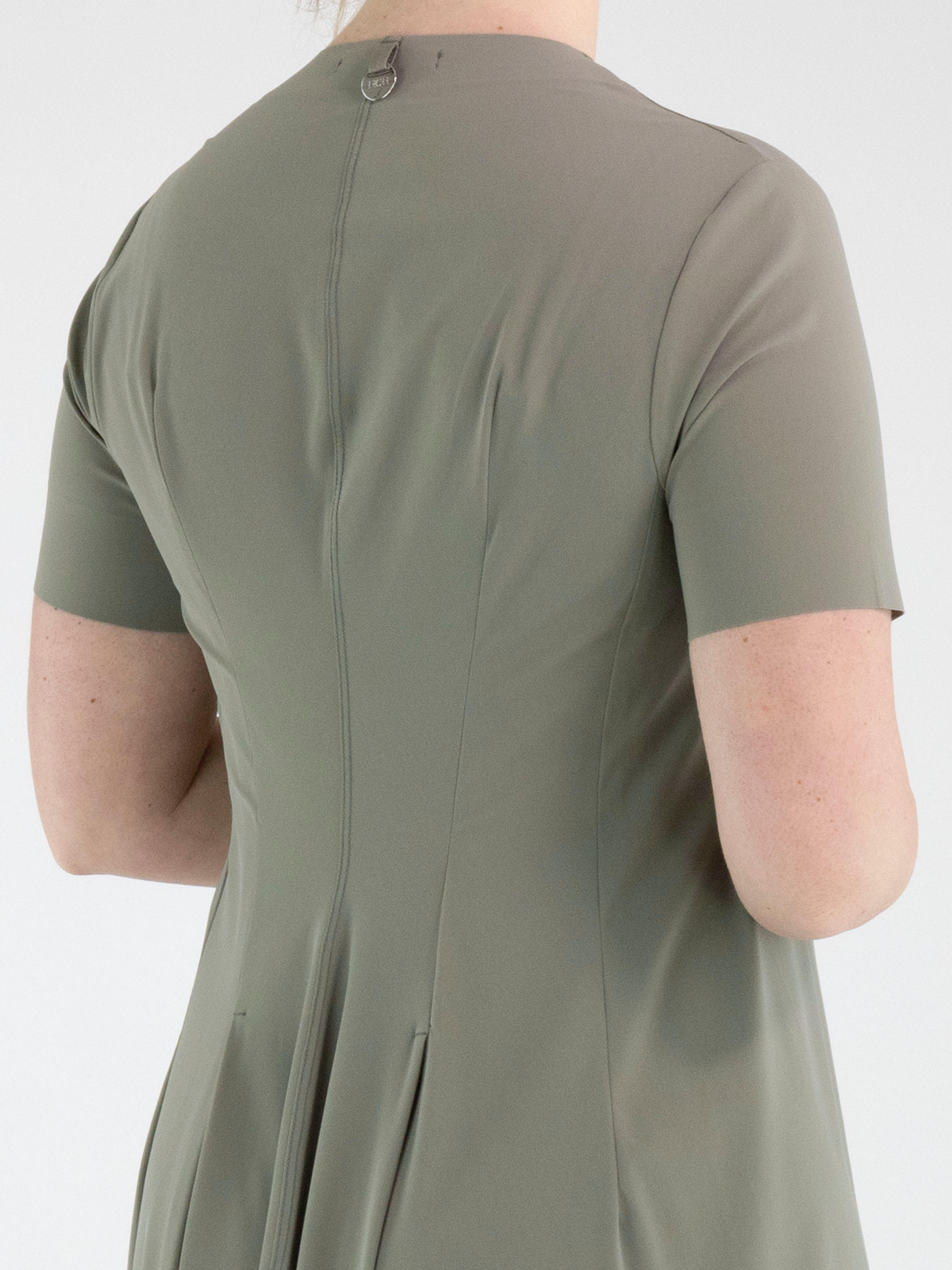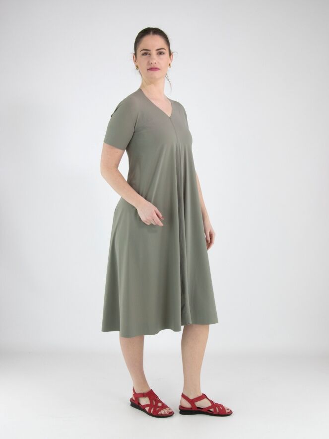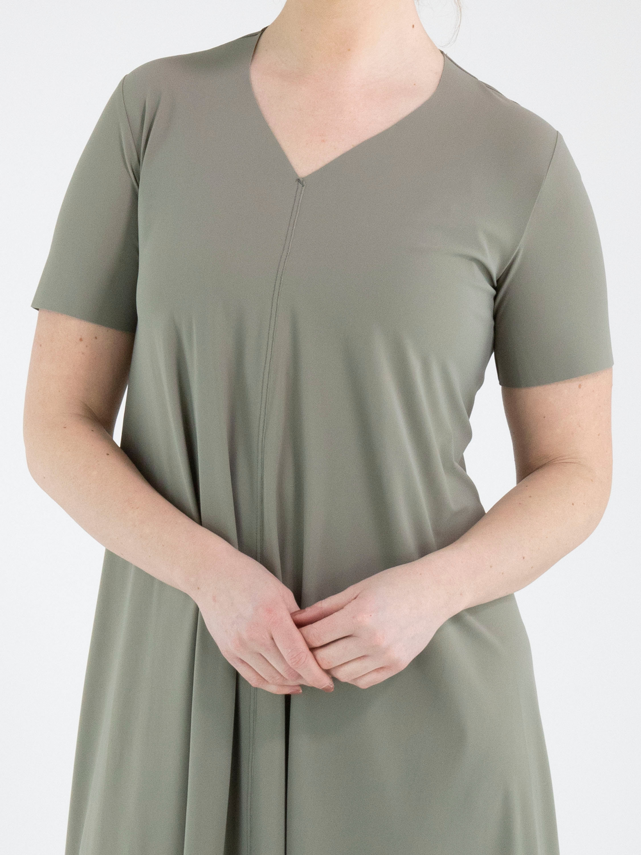 Une robe de High de couleur vert olive. La robe possède un col en V et des manches courtes. Elle présente une légère coupe en A et peut être lavée à la main.