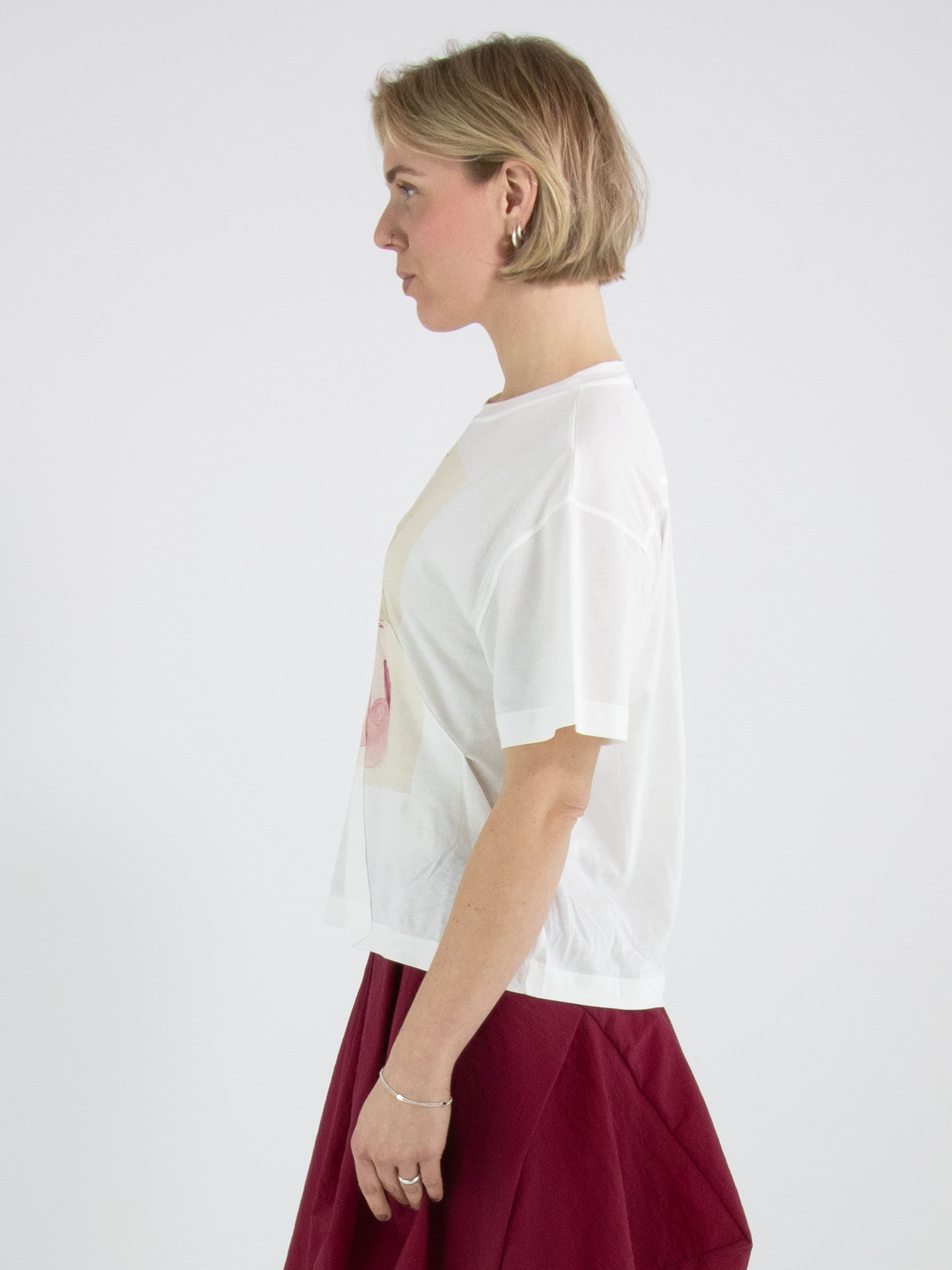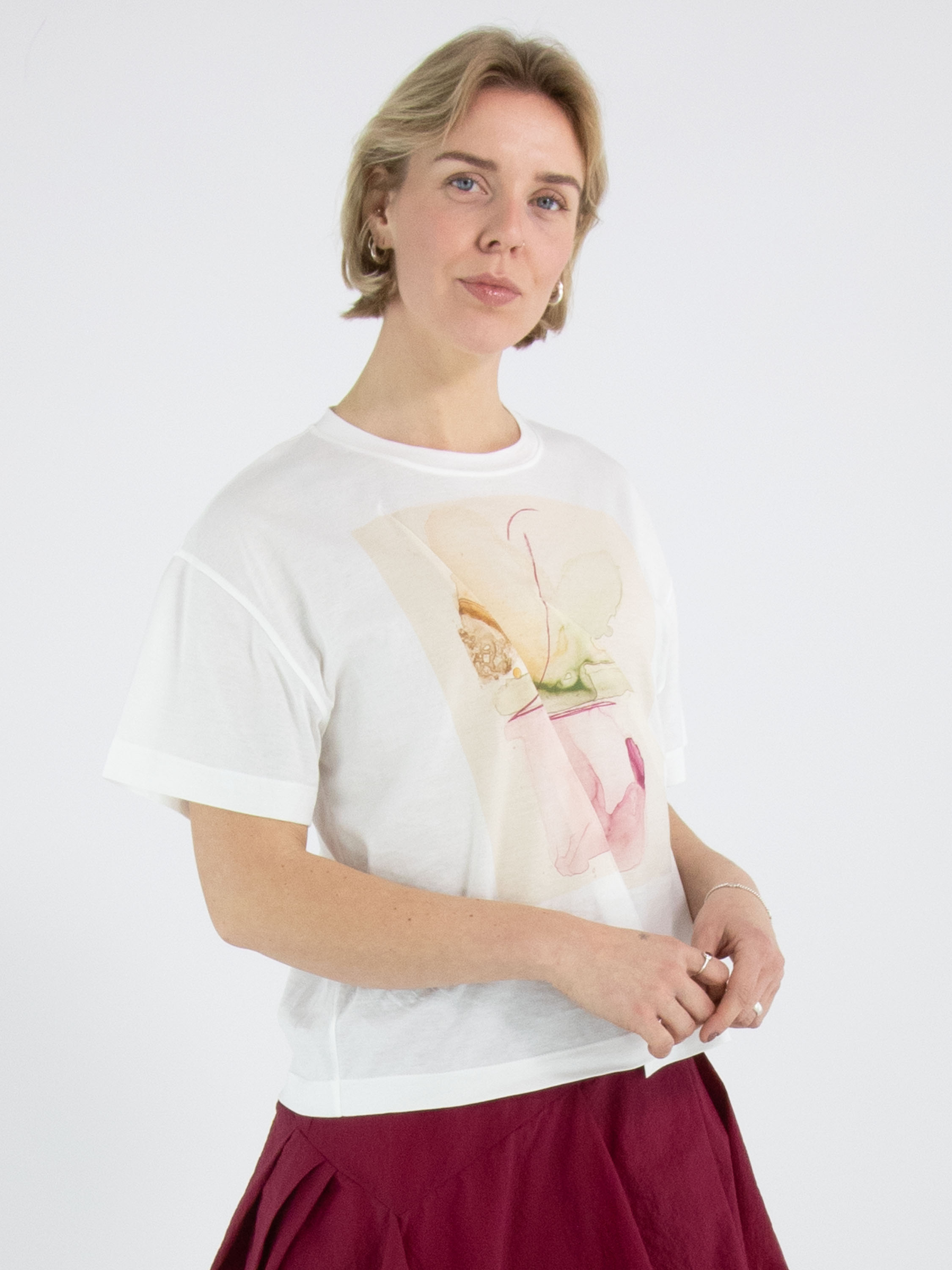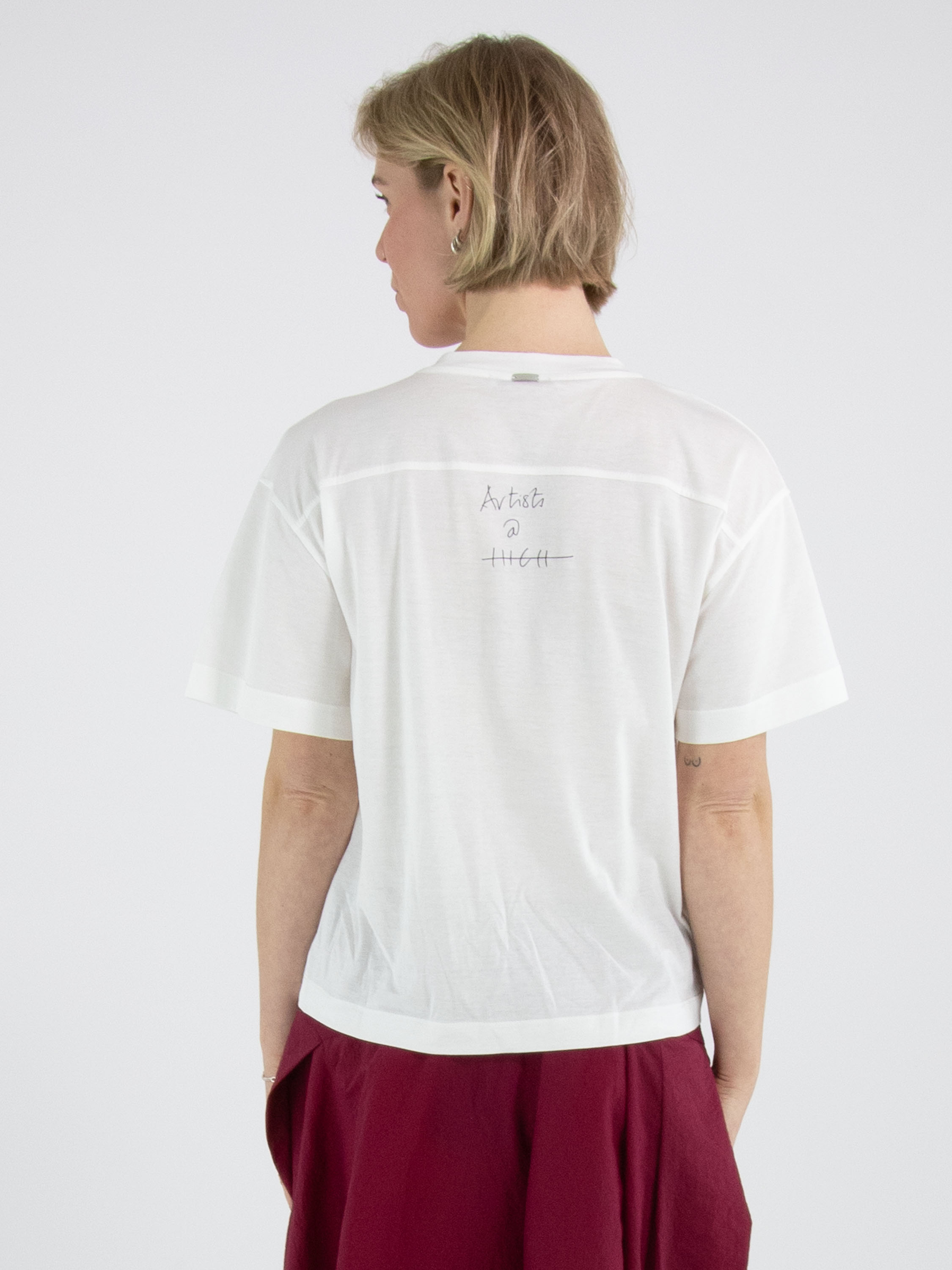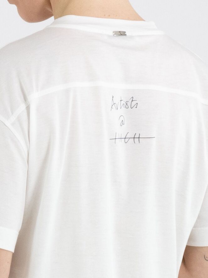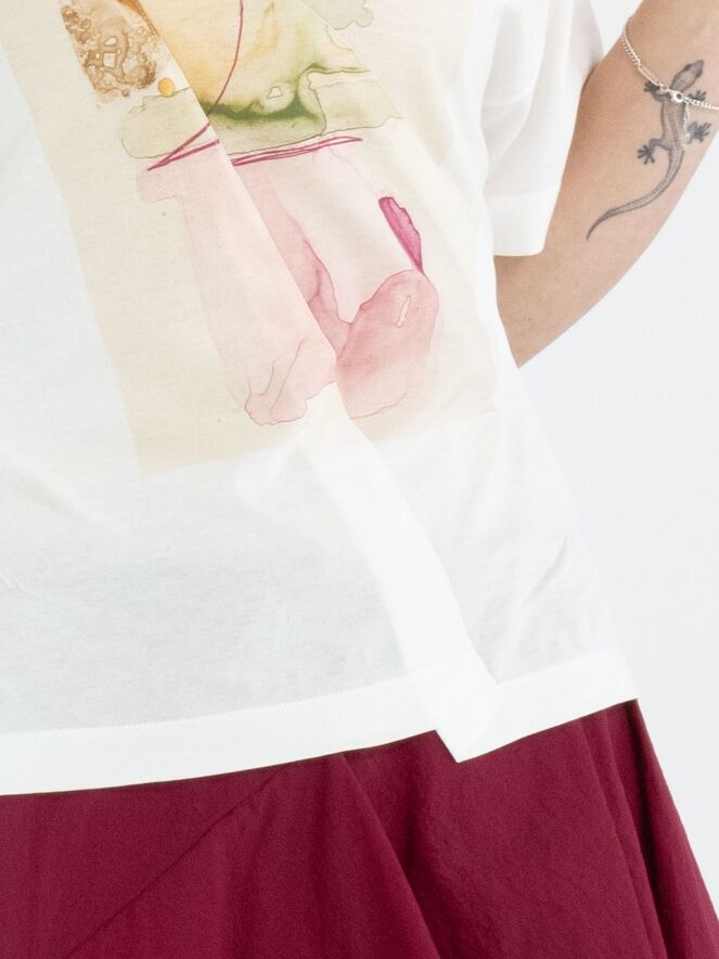 Un shirt de High en blanc. Sur le devant figure une photographie graphique de la photographe Manuela de la Vega Castro. Depuis l’épaule droite, deux coutures diagonales descendent vers le bas. Le shirt possède des manches courtes et une encolure ronde et peut être lavé à la main.
