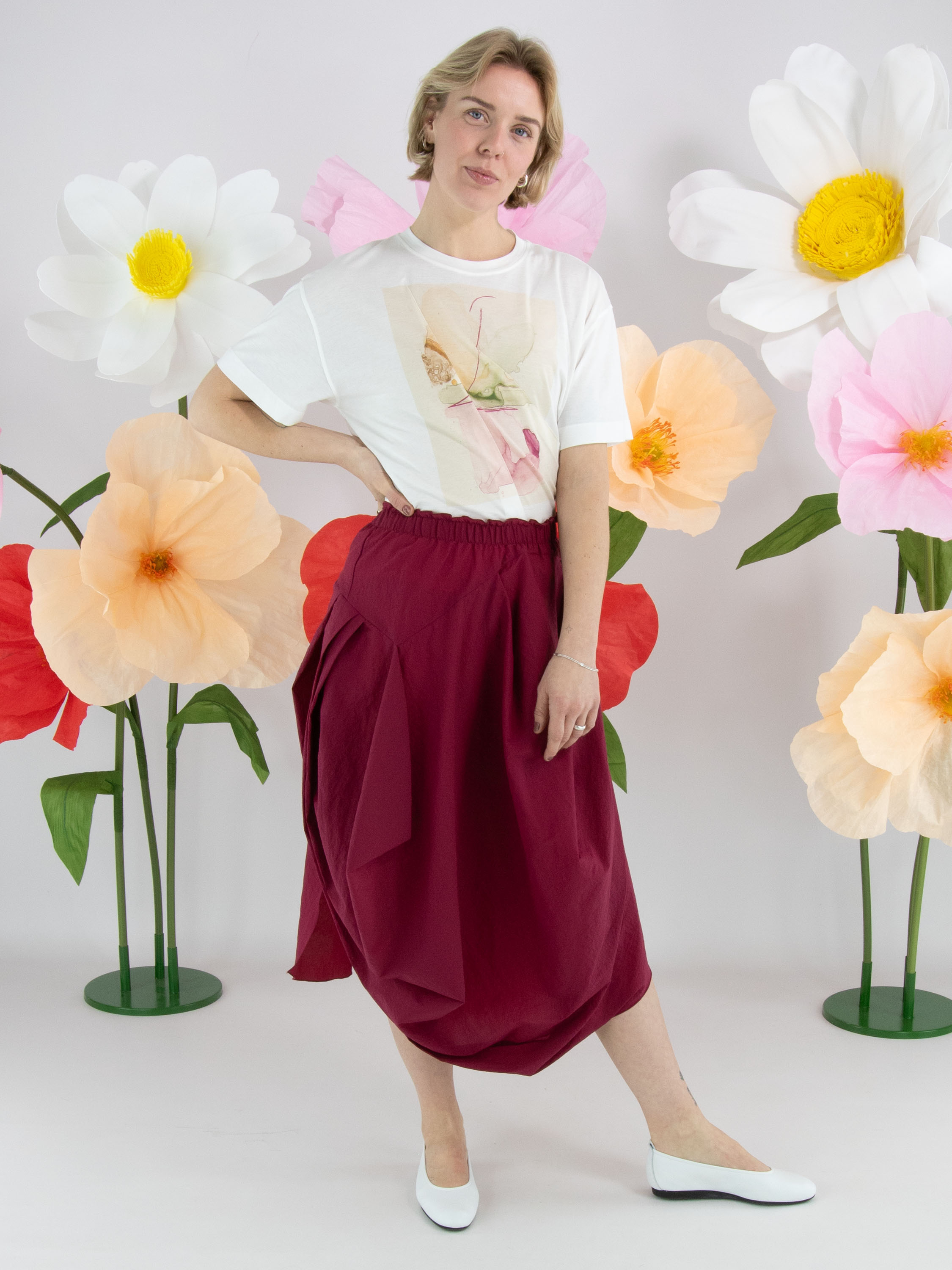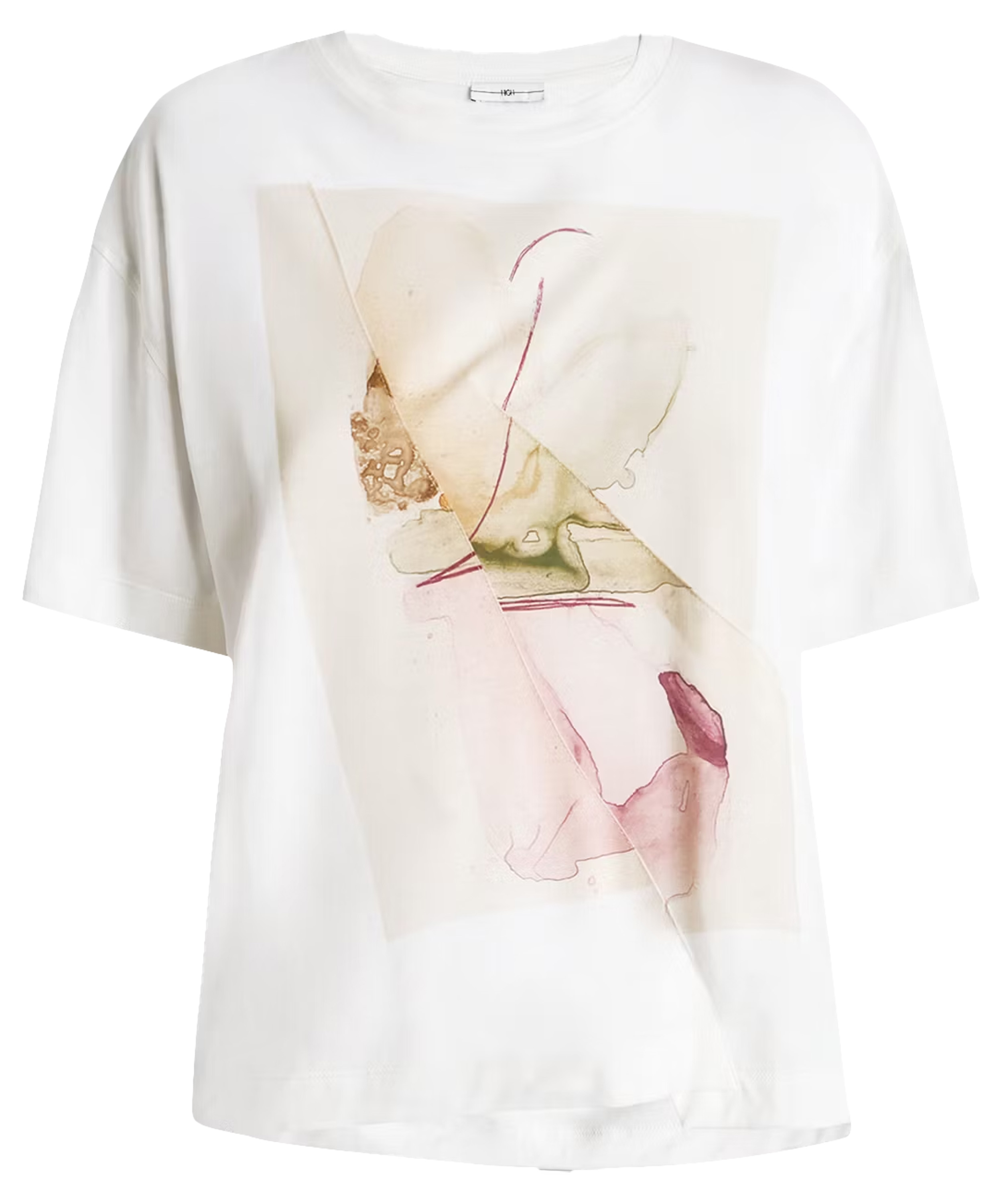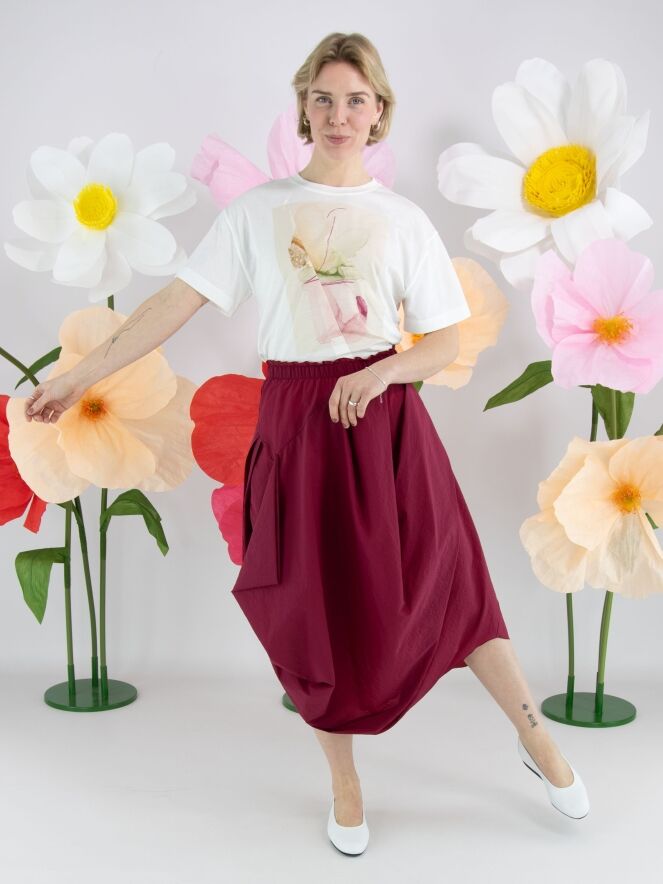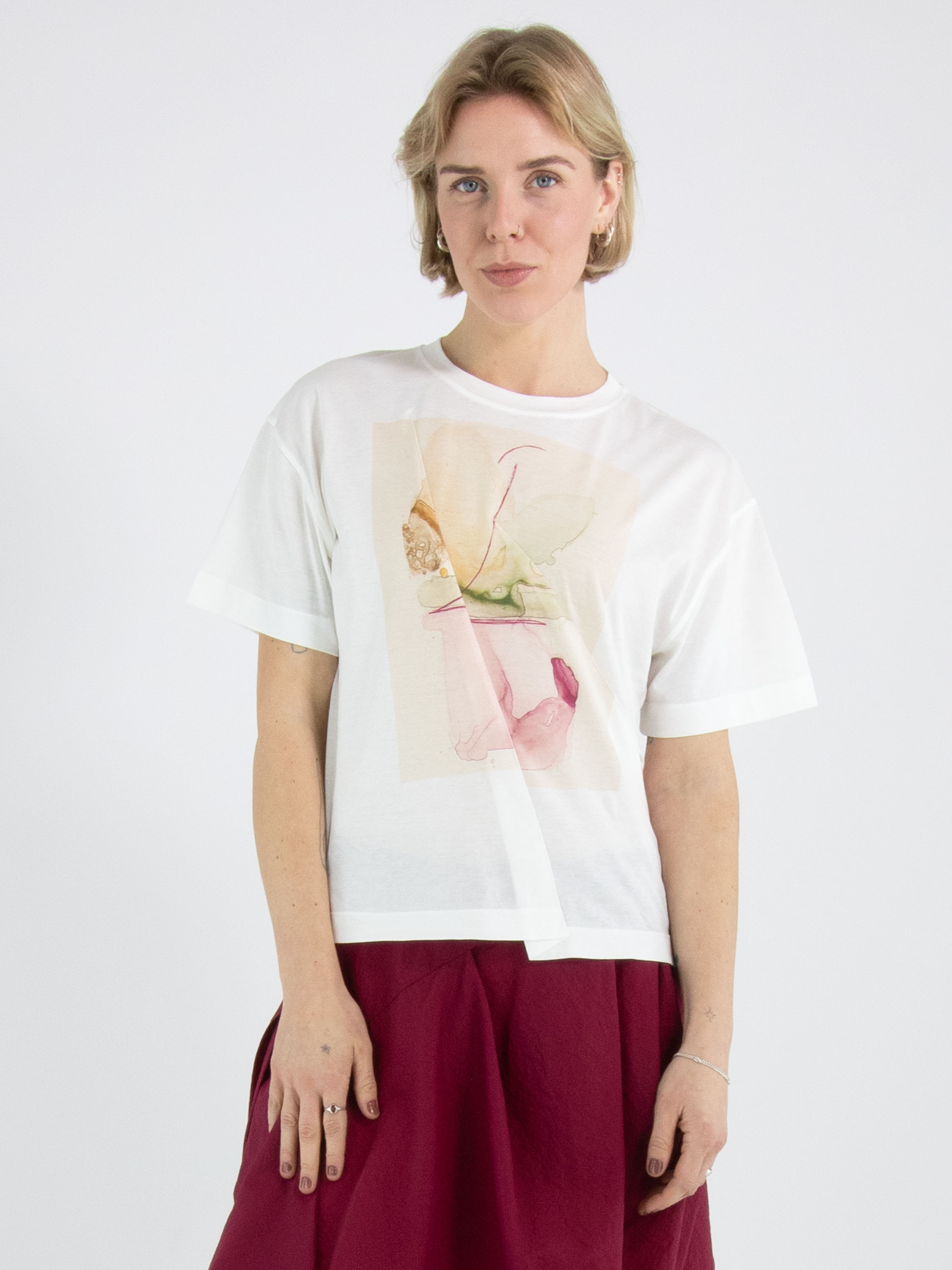 Un shirt de High en blanc. Sur le devant figure une photographie graphique de la photographe Manuela de la Vega Castro. Depuis l’épaule droite, deux coutures diagonales descendent vers le bas. Le shirt possède des manches courtes et une encolure ronde et peut être lavé à la main.