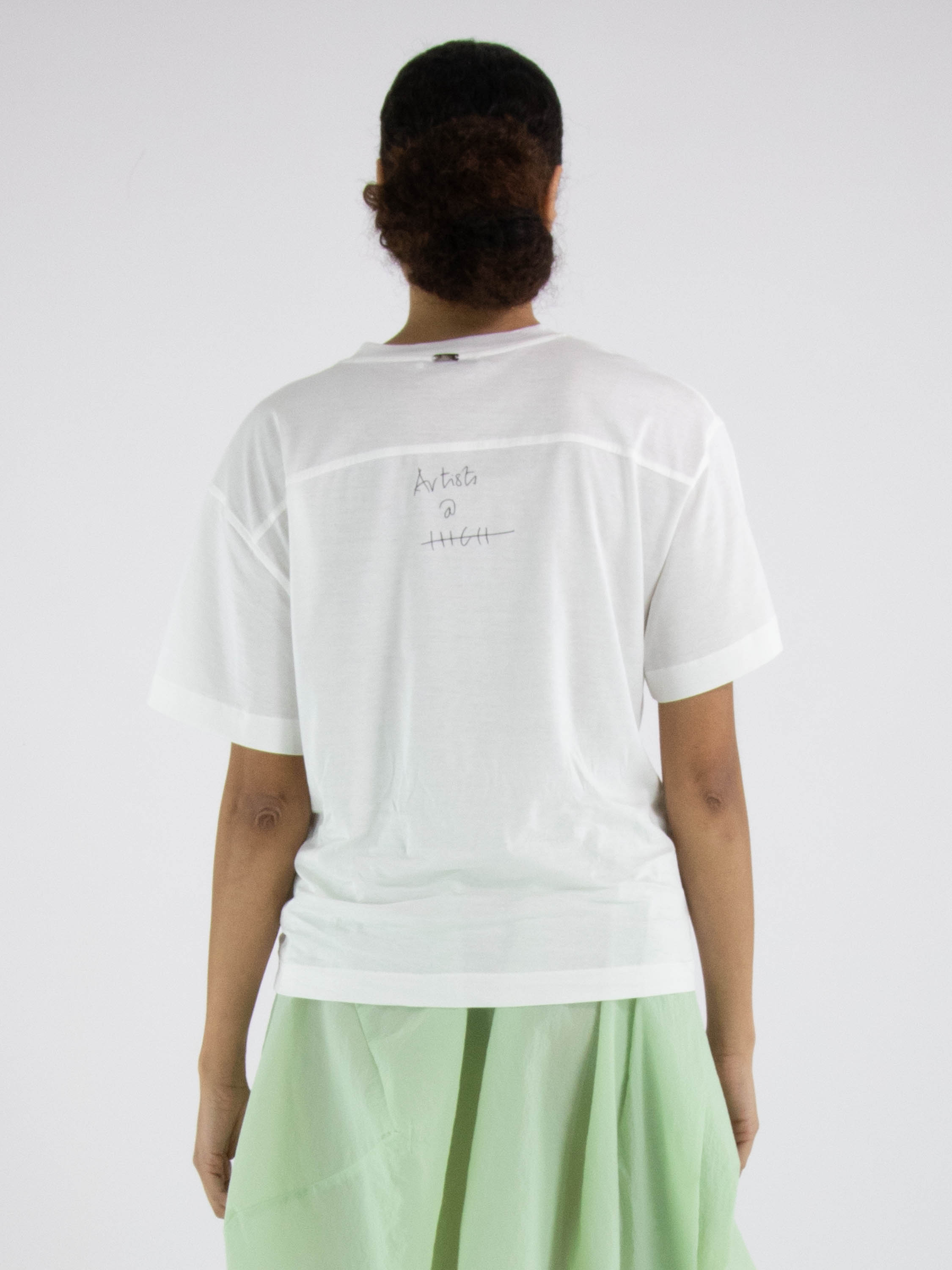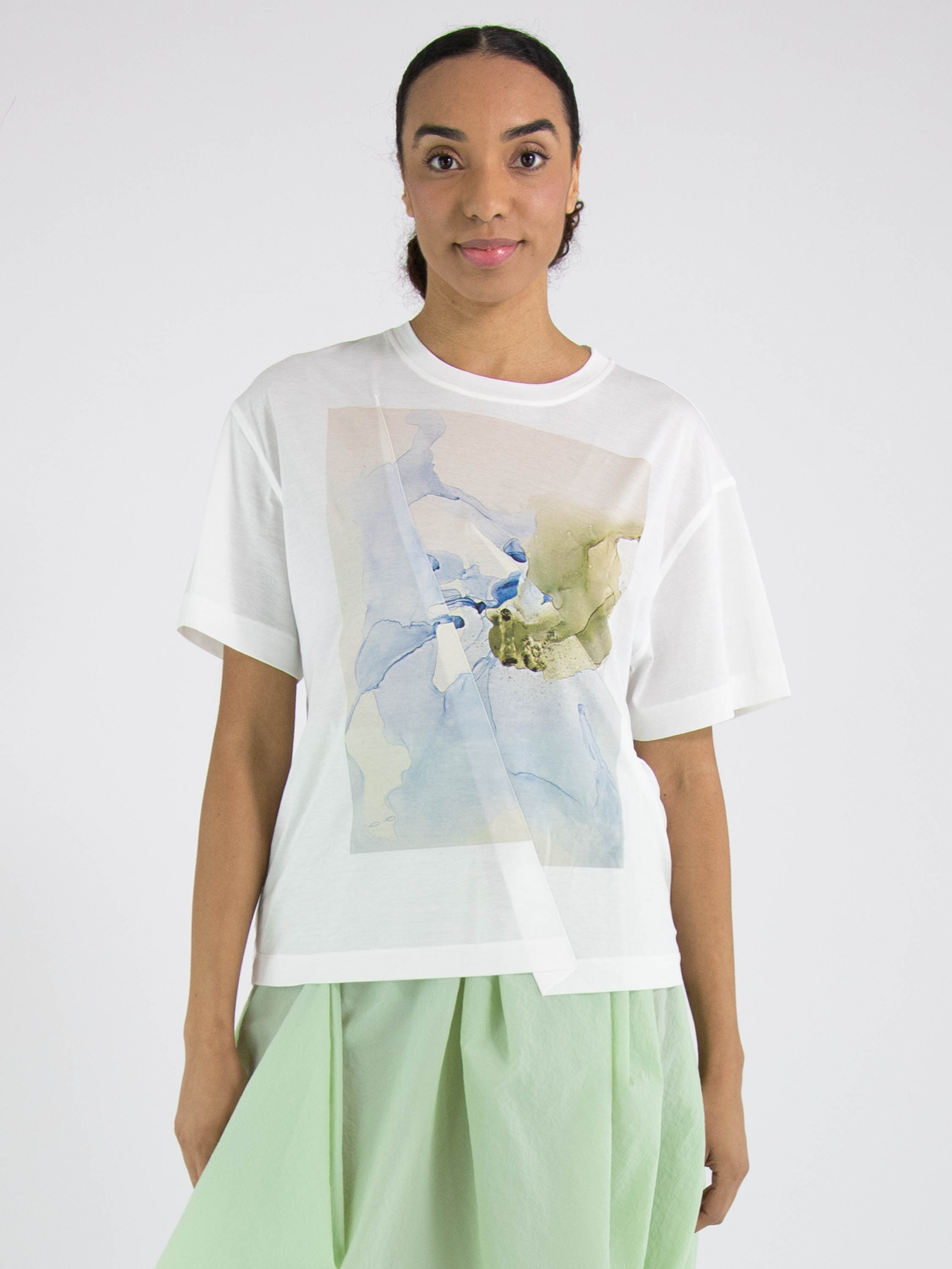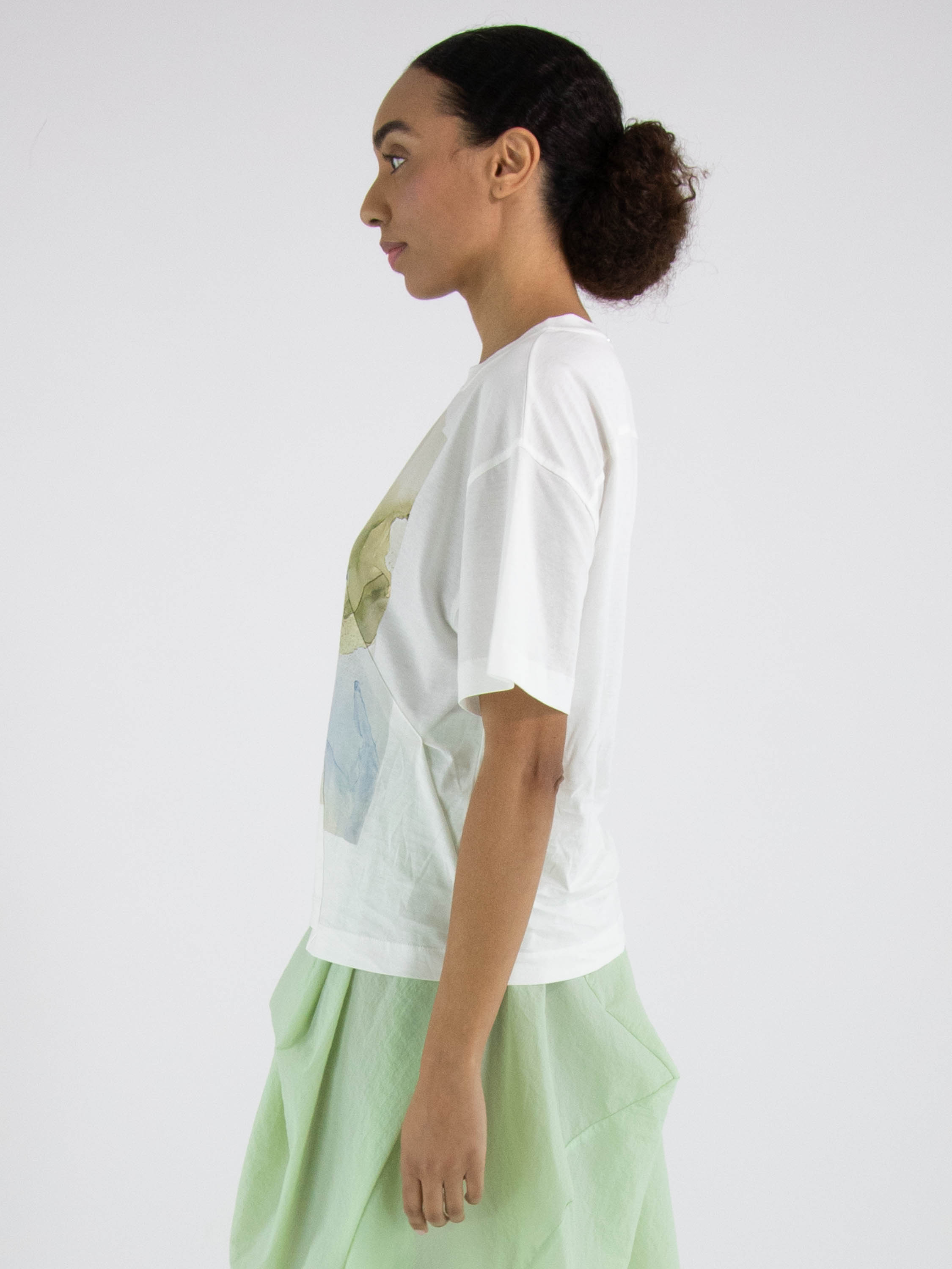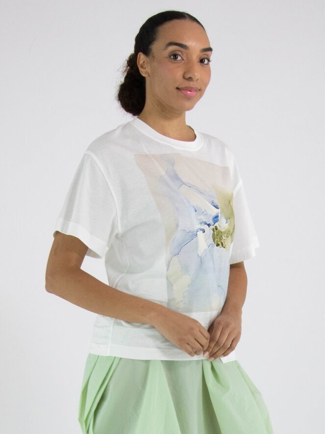 Un shirt de High en blanc. Sur le devant figure une photo graphique de la photographe Manuela de la Vega Castro dans des tons vert olive et bleu. Depuis l’épaule droite, deux coutures diagonales descendent vers le bas. Le shirt possède des manches courtes, une encolure ronde et peut être lavé à la main.