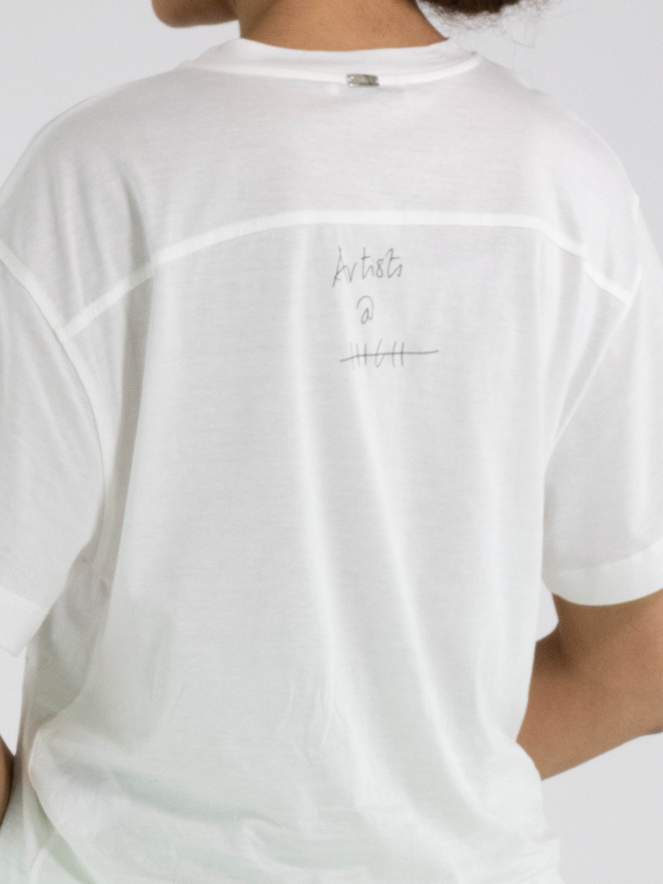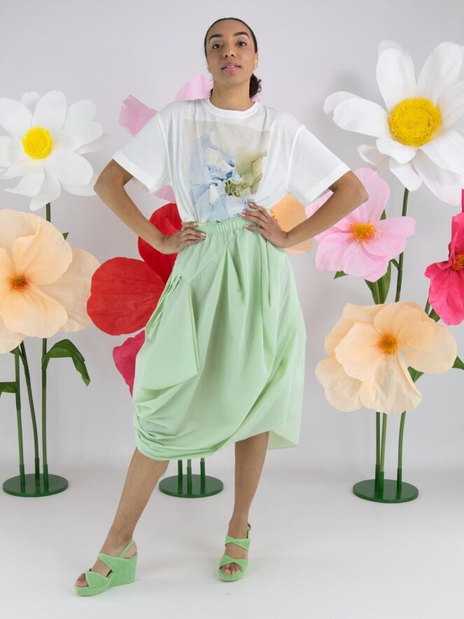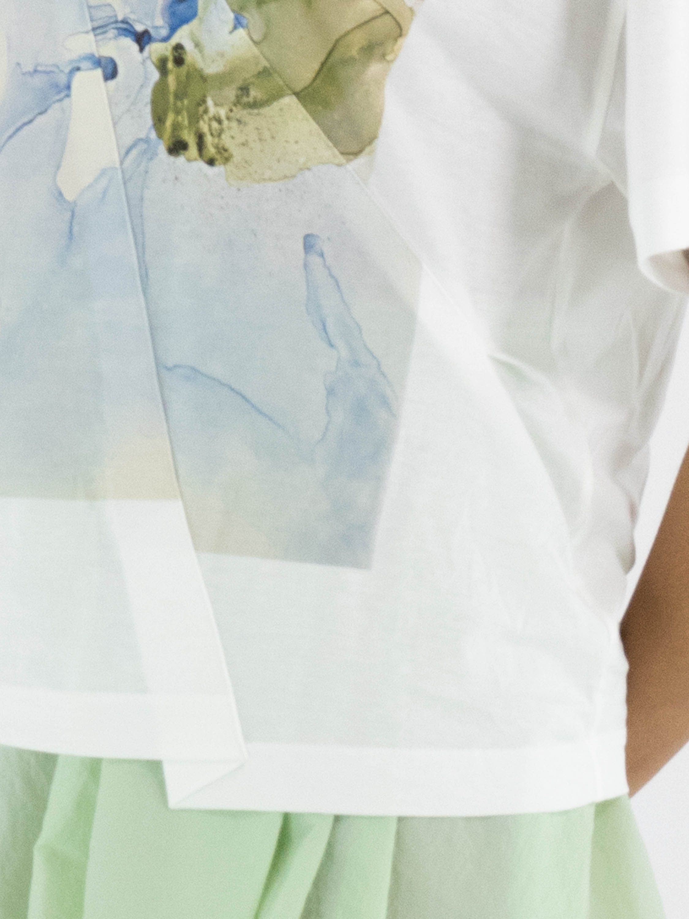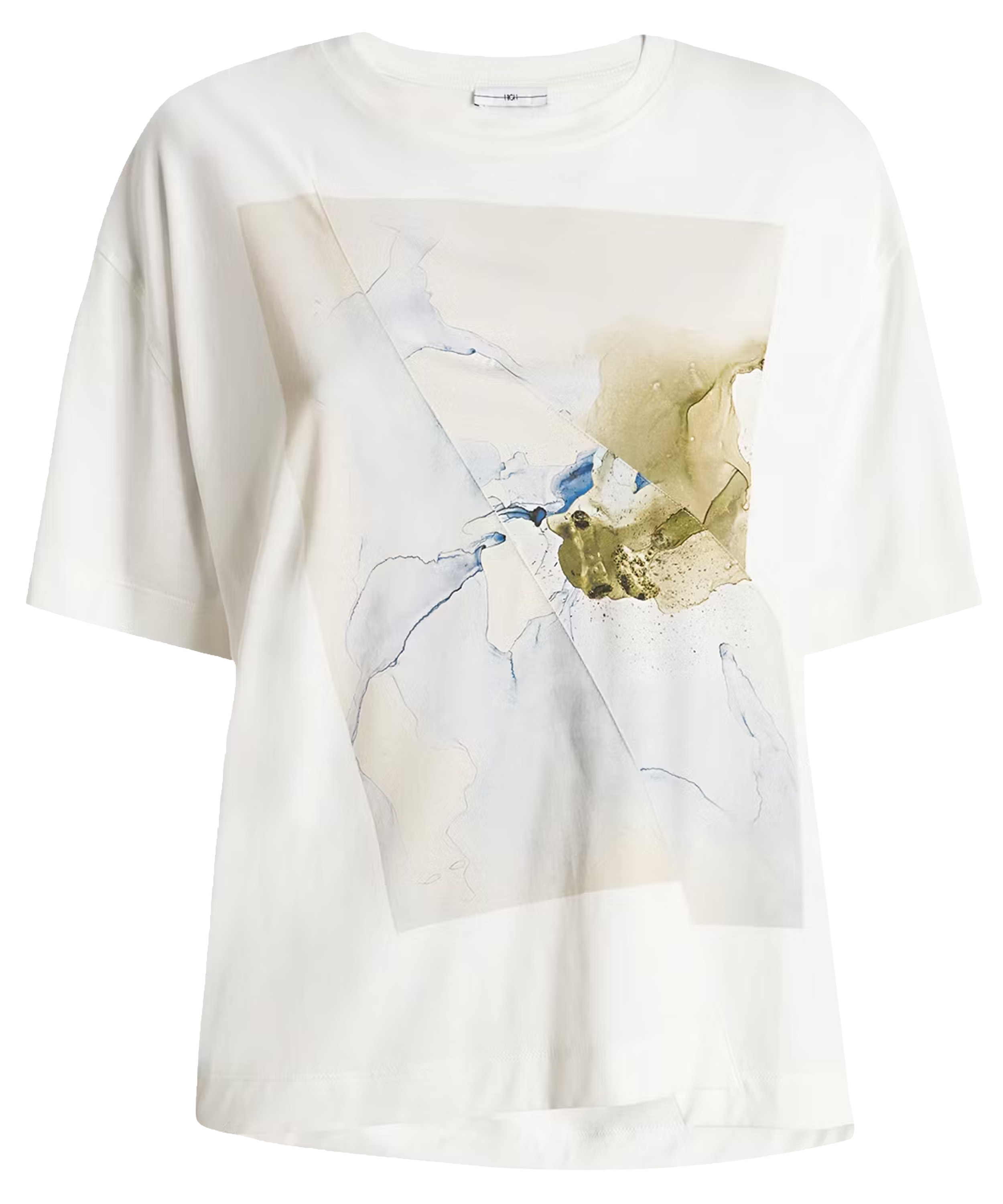 Un shirt de High en blanc. Sur le devant figure une photo graphique de la photographe Manuela de la Vega Castro dans des tons vert olive et bleu. Depuis l’épaule droite, deux coutures diagonales descendent vers le bas. Le shirt possède des manches courtes, une encolure ronde et peut être lavé à la main.