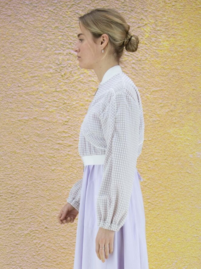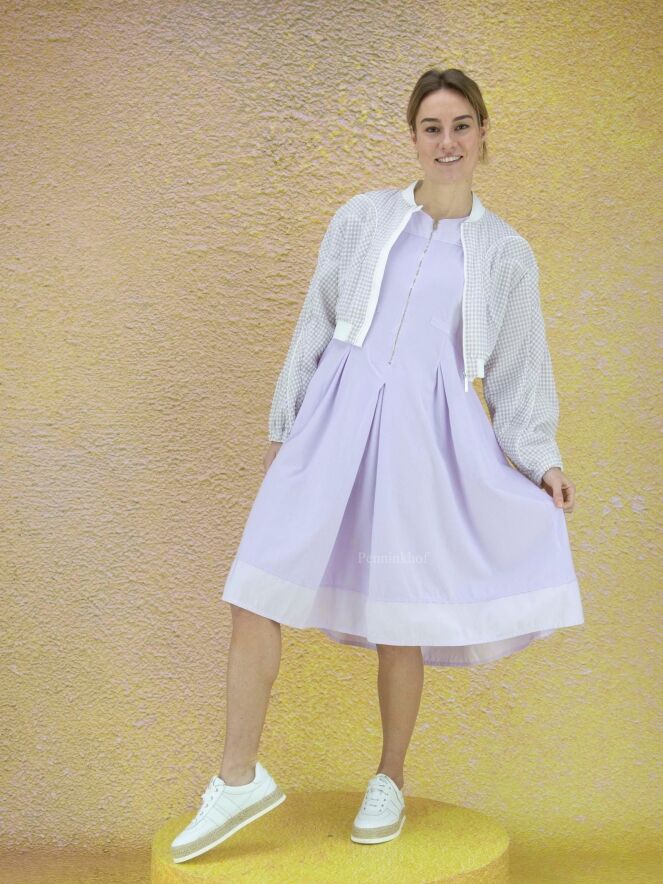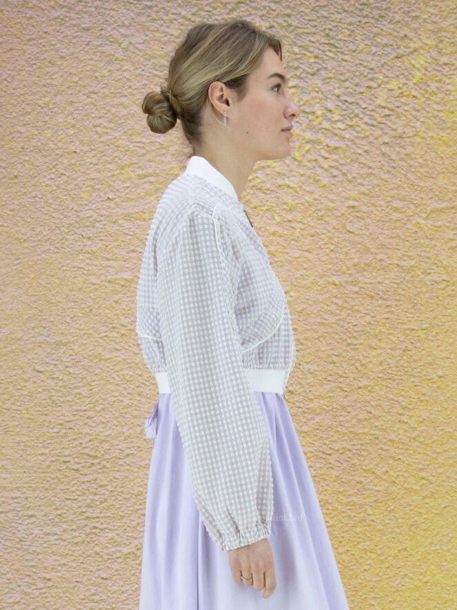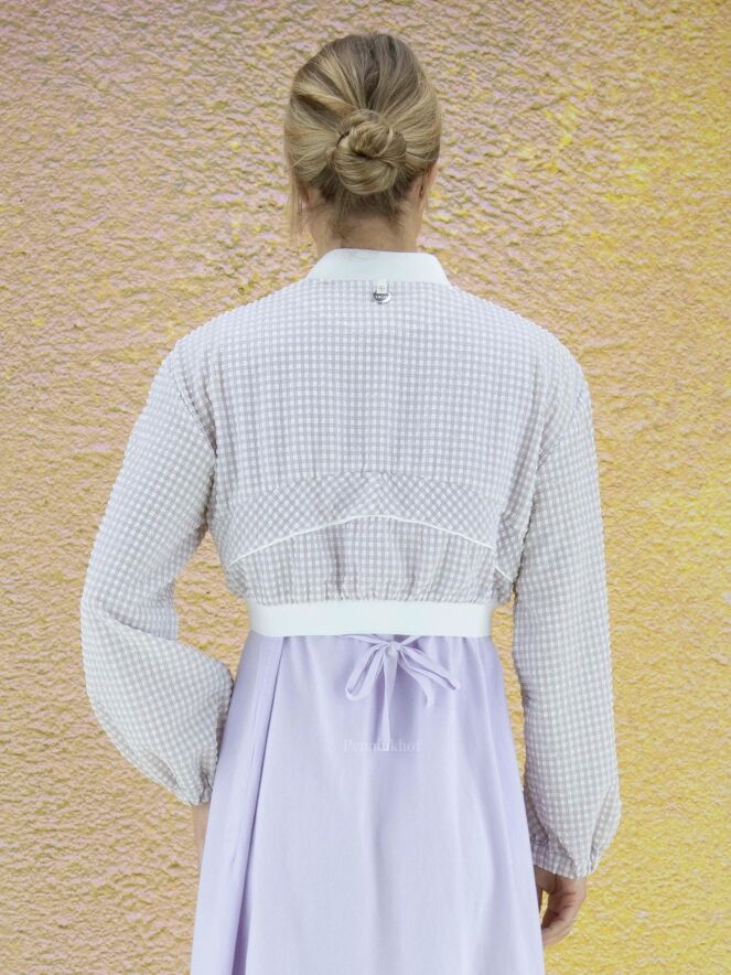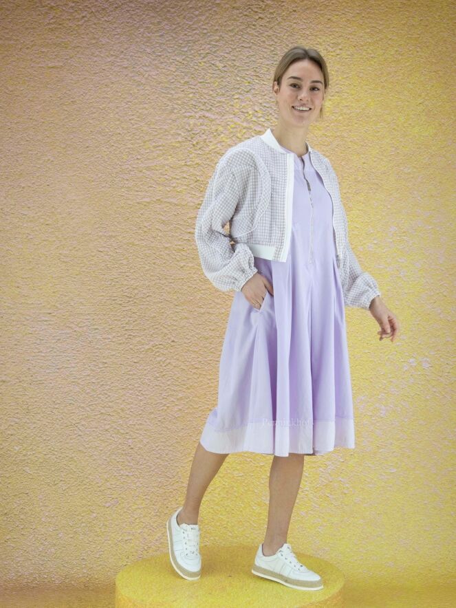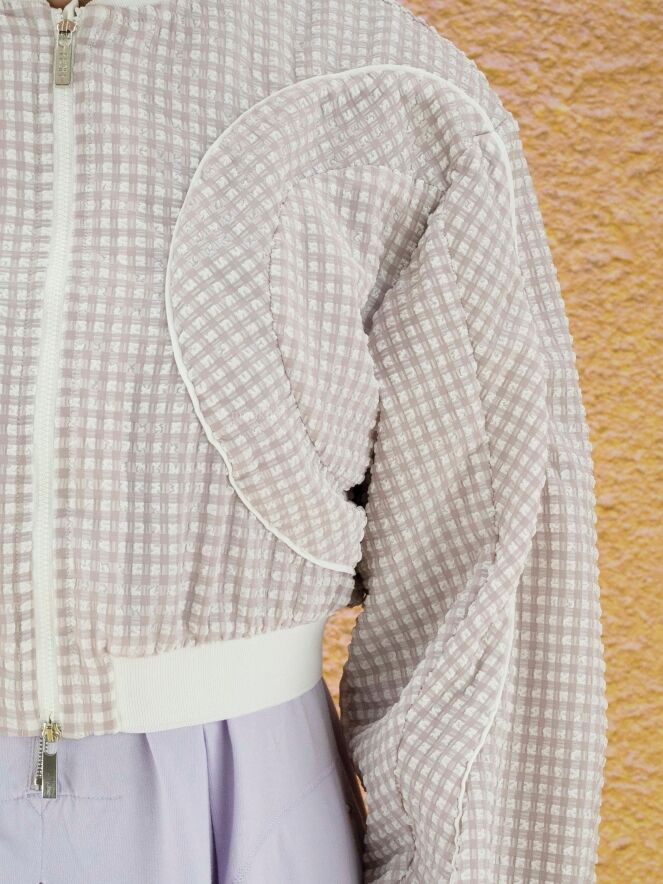 Blouson style aviateur de la marque High, en seersucker aux couleurs lilas et blanc. Le col et l'ourlet du bas sont finement côtelés. Une couture blanche circulaire entoure les côtés et descend en biais le long des manches. L'extrémité des poignets est à bordure élastique. Le blouson ferme à l'aide d'un zip à double curseur. Lavage à la main.