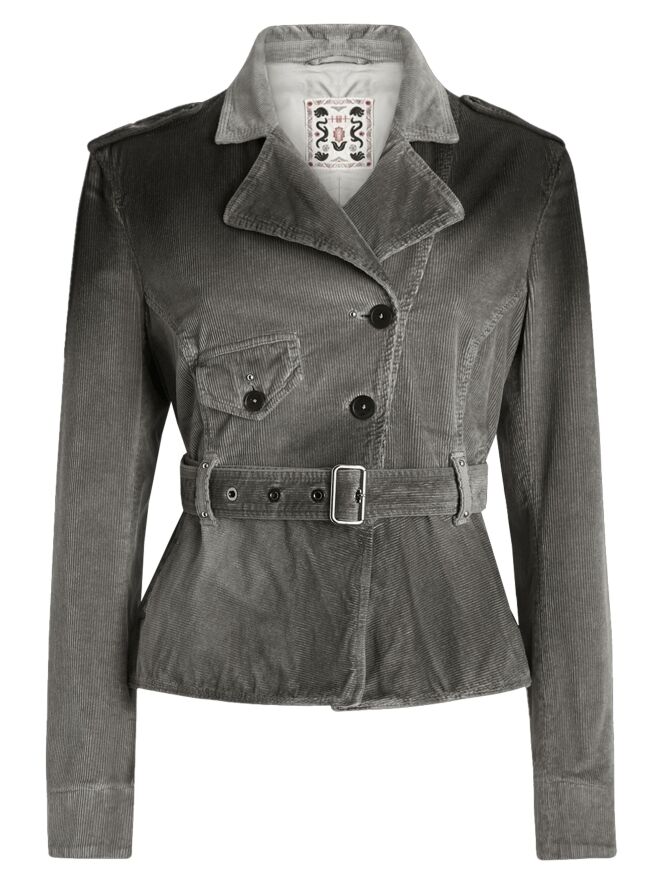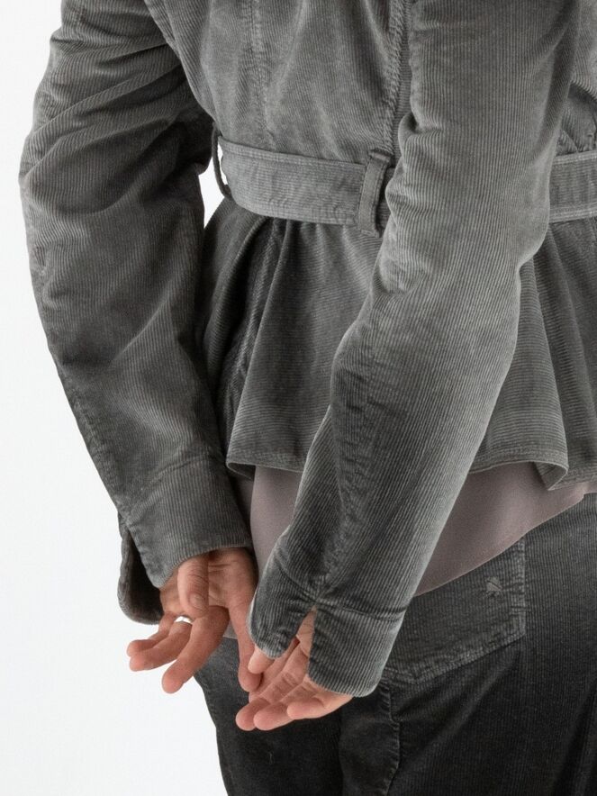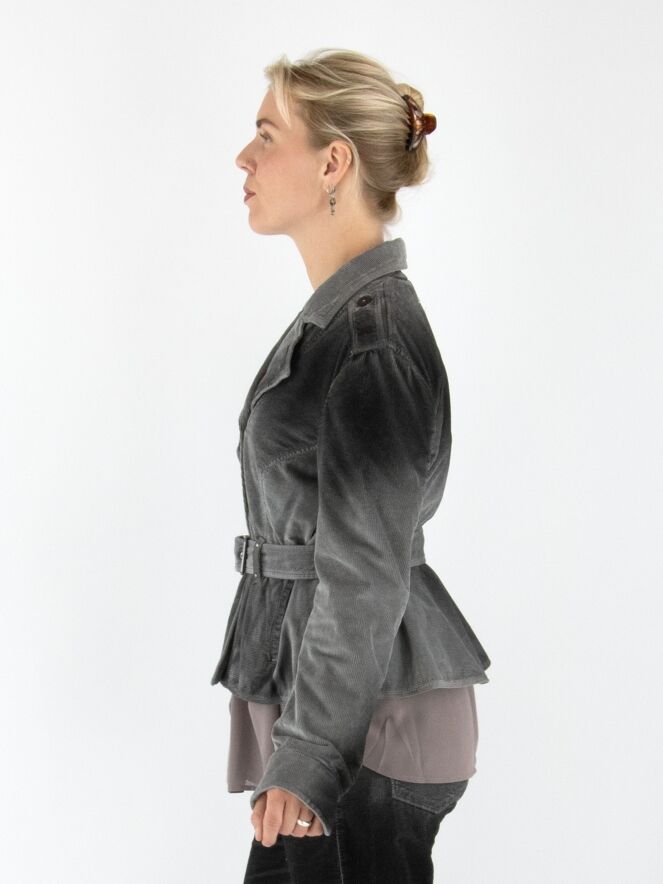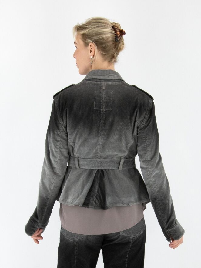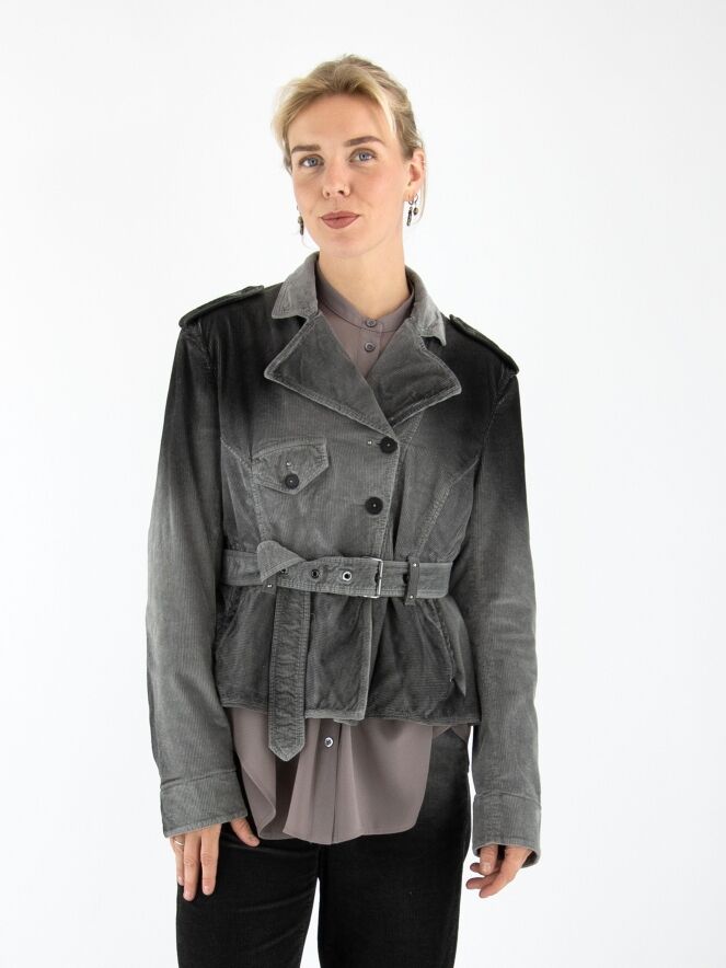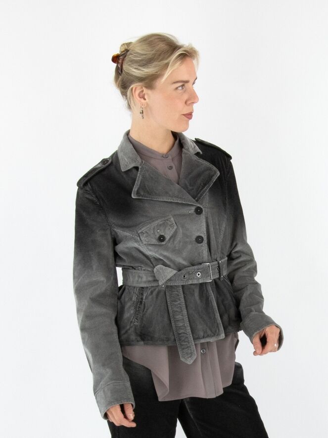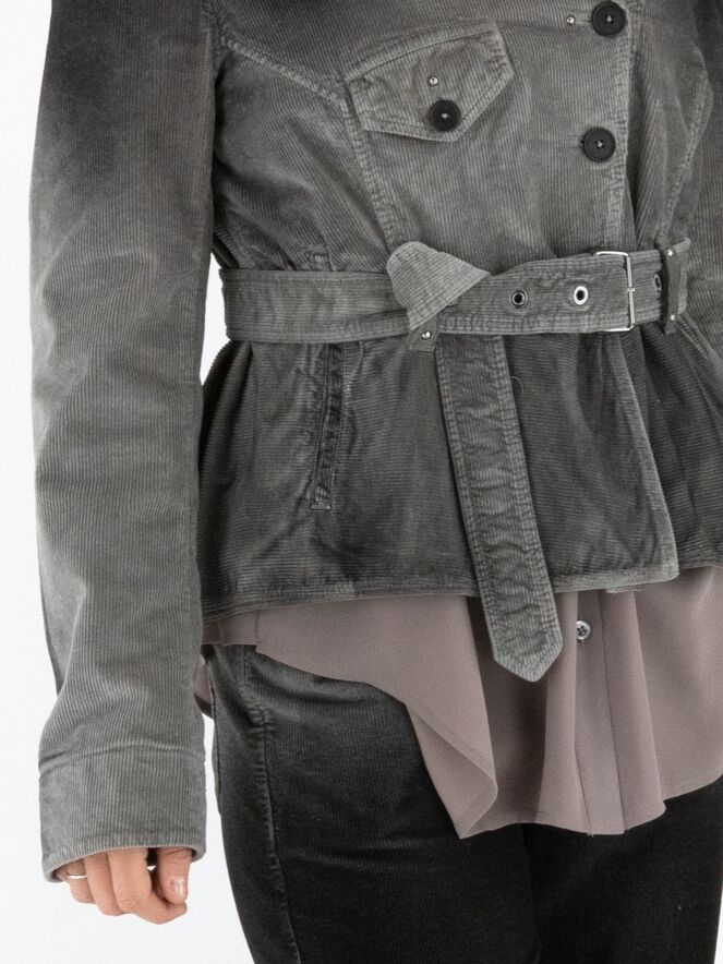 Blazer en velours côtelé de la marque High, dans un dégradé allant du gris foncé aux épaules et à la base vers un gris clair au centre. Il se ferme par une rangée de boutons asymétrique et est doté d’une ceinture en tissu assorti à la taille. Des poches fendues se trouvent sous la taille. Des paillettes ornent les épaules. Ce blazer doit être lavé à la main.