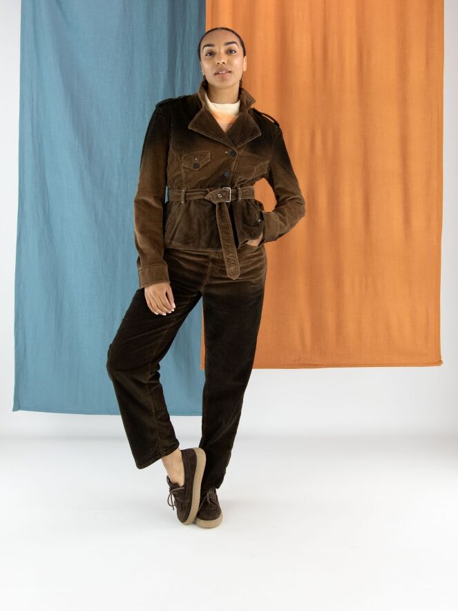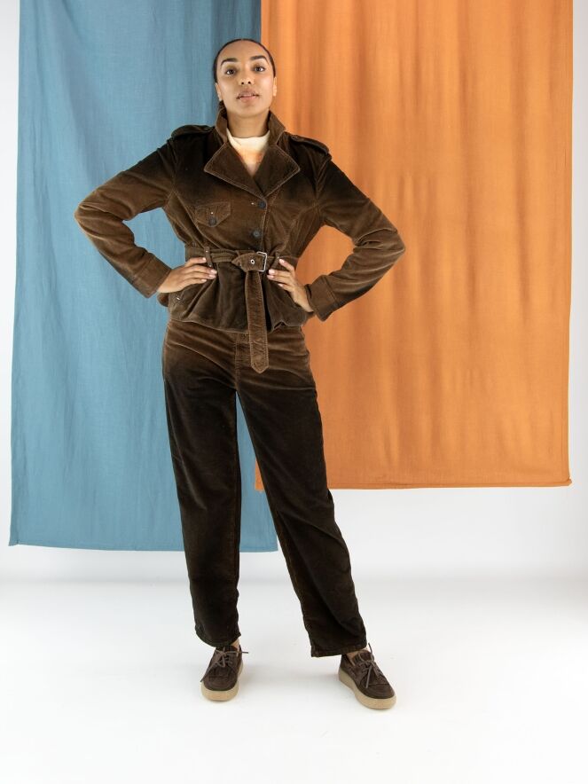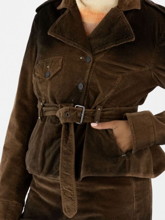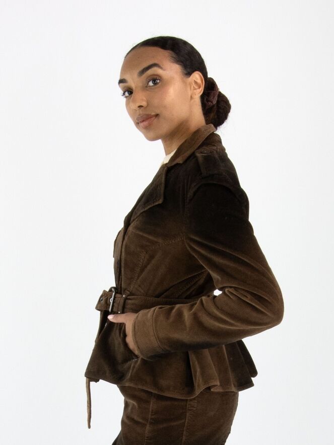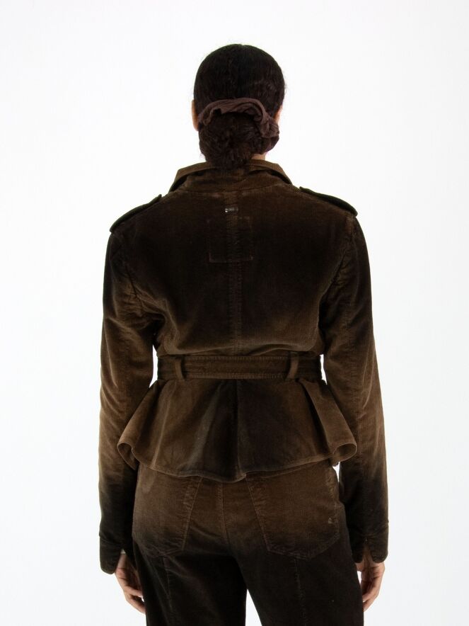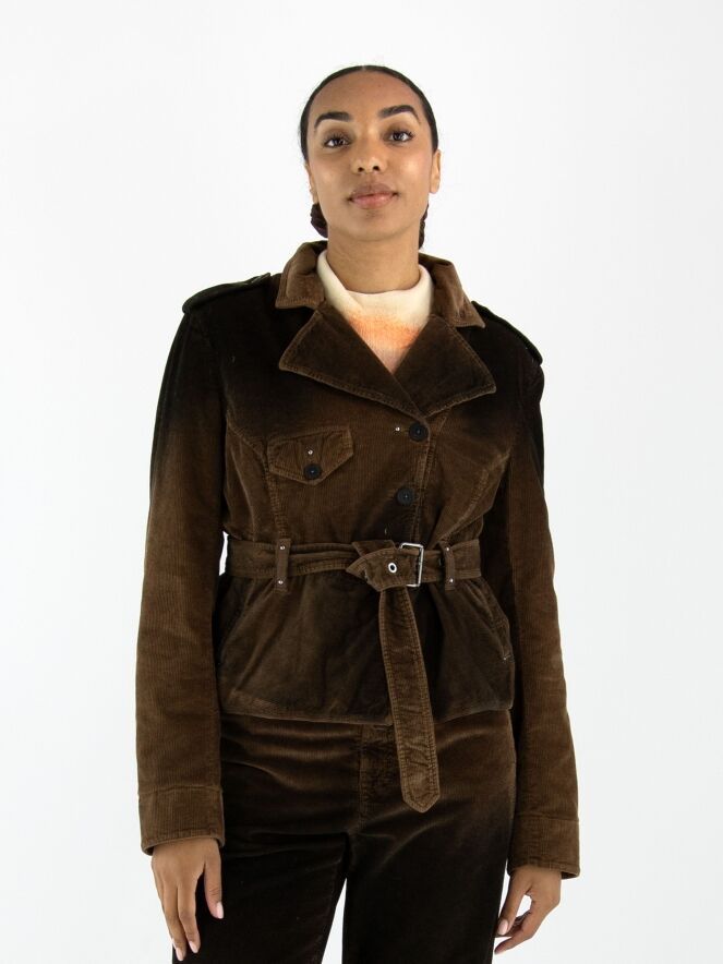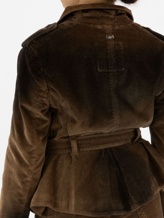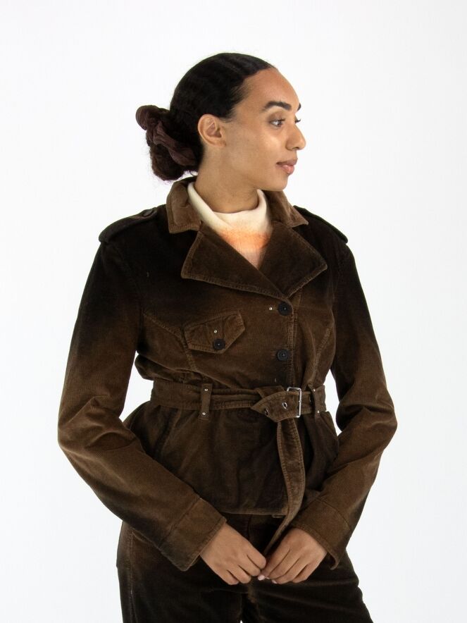 Blazer en velours côtelé de la marque High avec un dégradé de couleur : moka aux épaules et à la base, brun au centre. La fermeture est asymétrique avec des boutons, et la taille est soulignée par une ceinture dans le même tissu. Des poches passepoilées se trouvent sous la taille. Des sequins décorent les épaules. Ce blazer doit être lavé à la main.