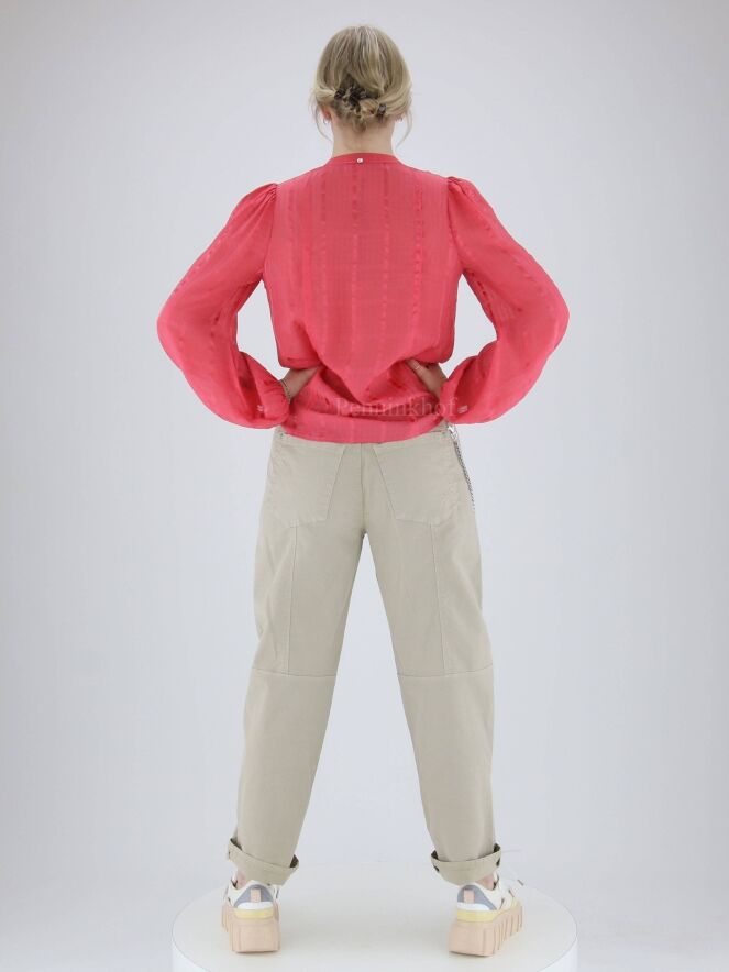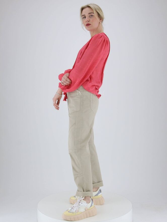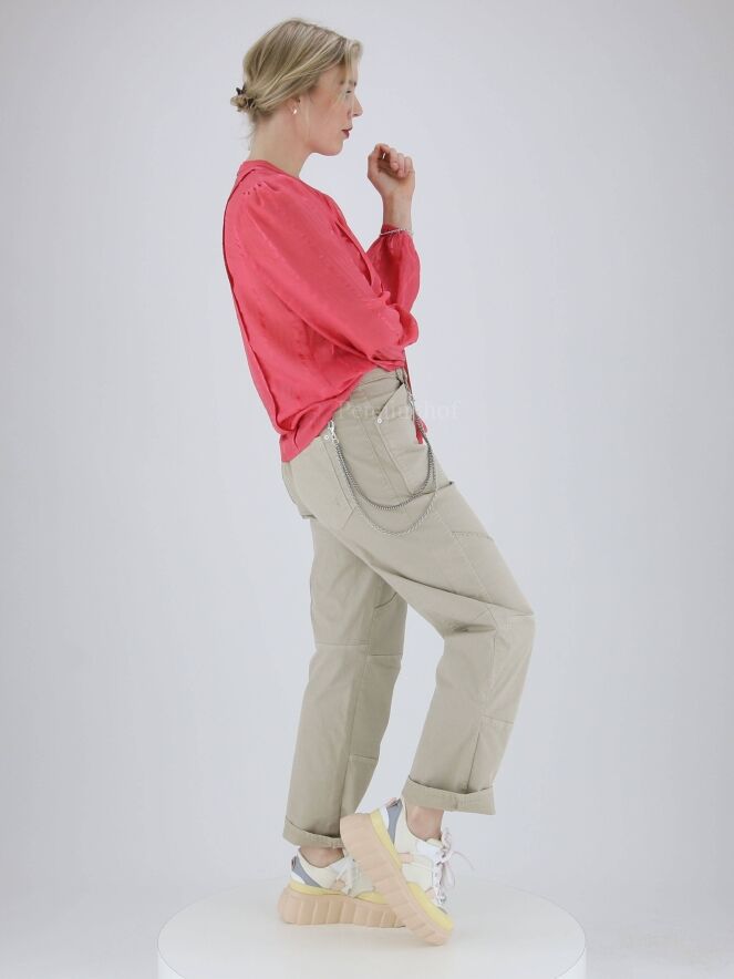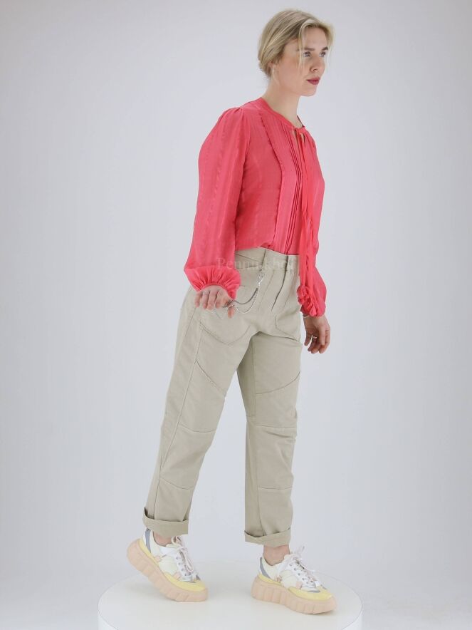 Jeans de la marque High, dans la couleur sable. Sur la partie avant, des poches obliques sont appliquées sur les côtés, une poche pour le téléphone est insérée dans la couture latérale. Des coutures en biais et droites s'échelonnent le long de la jambe. Une double chaîne de couleur argentée orne le côté droit. Lavage à 30 degrés.
