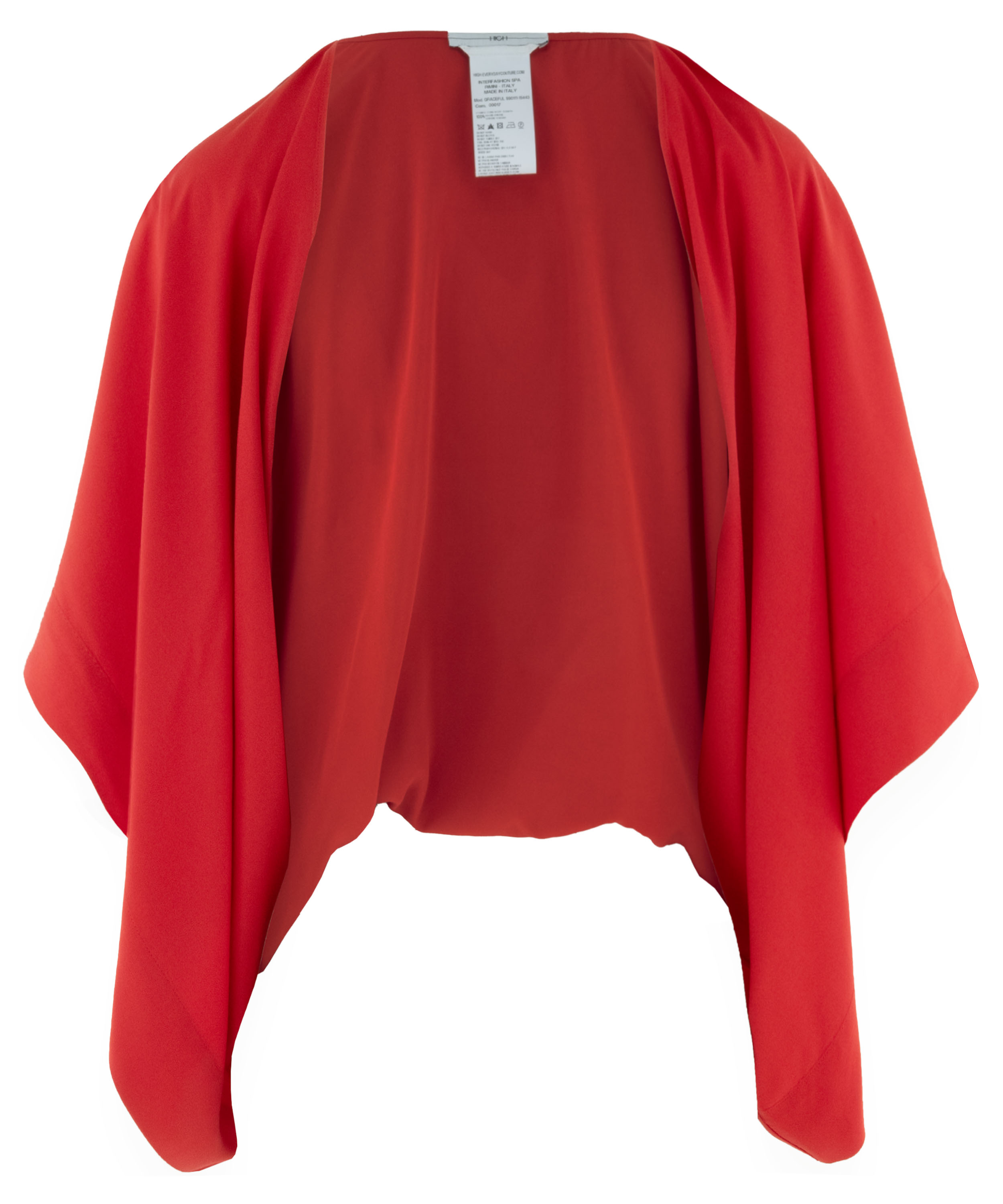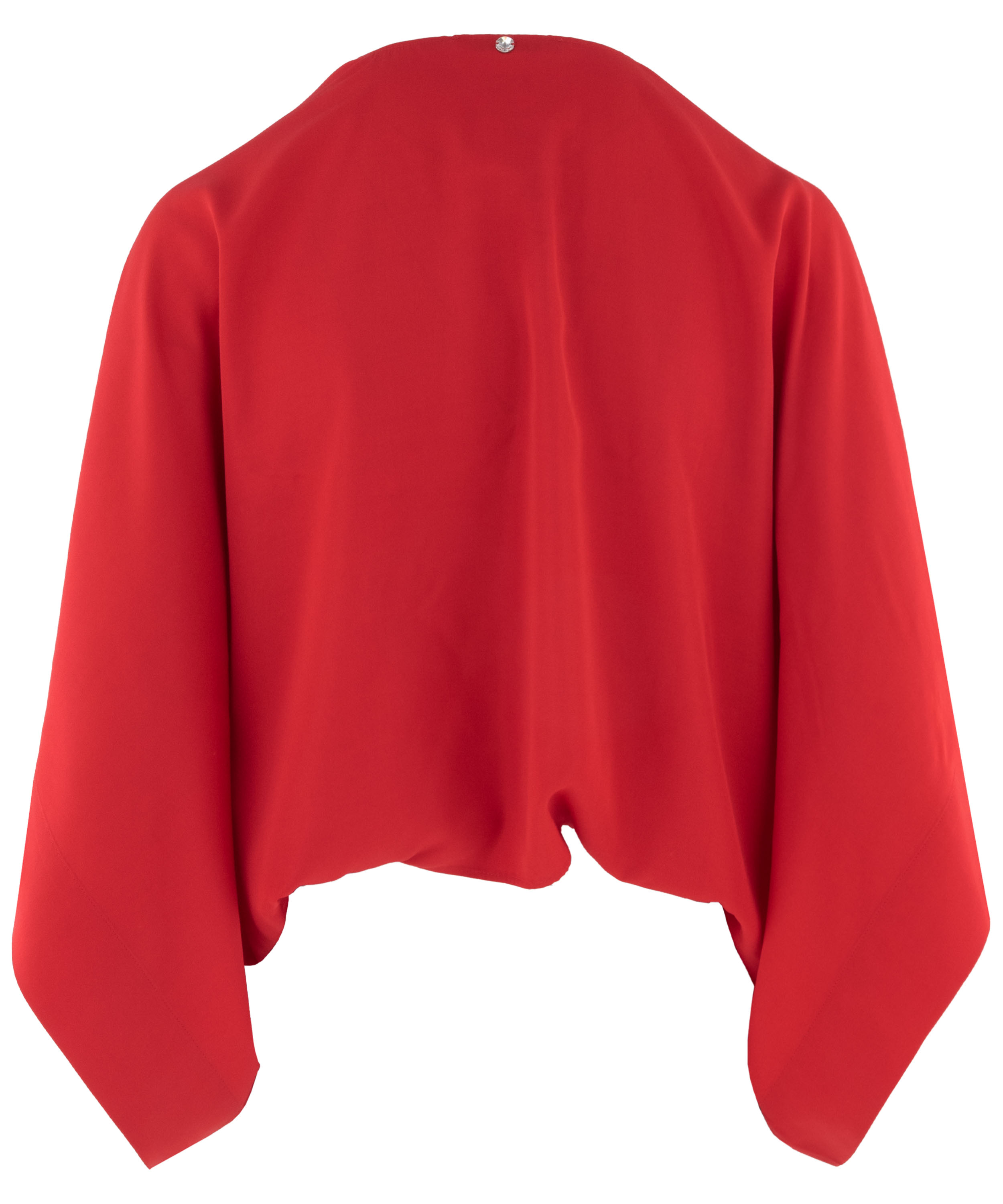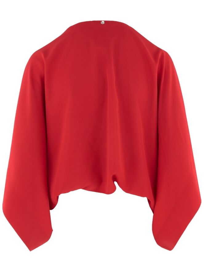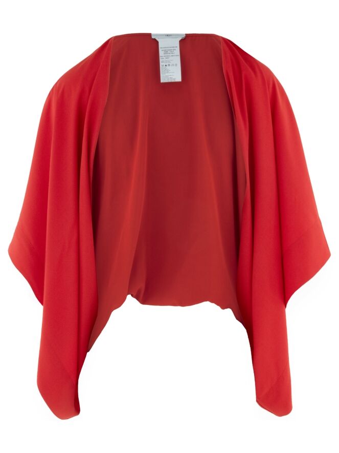 Boléro de High dans une teinte rouge éclatante. Doté de manches chauve-souris, le tissu tombe avec fluidité depuis l’encolure vers les côtés, créant une silhouette élégante et légère. Ce boléro ne doit pas être lavé.
