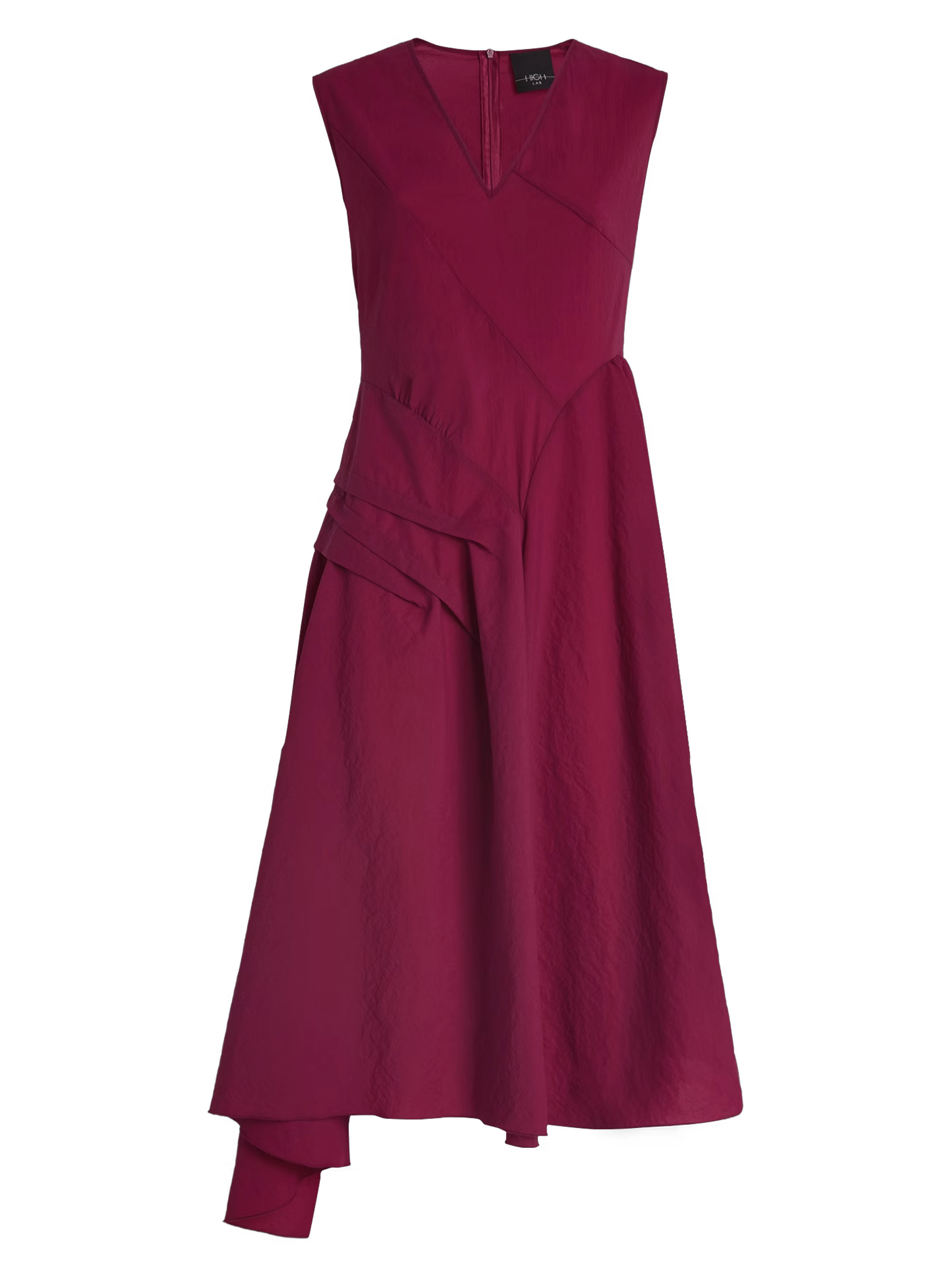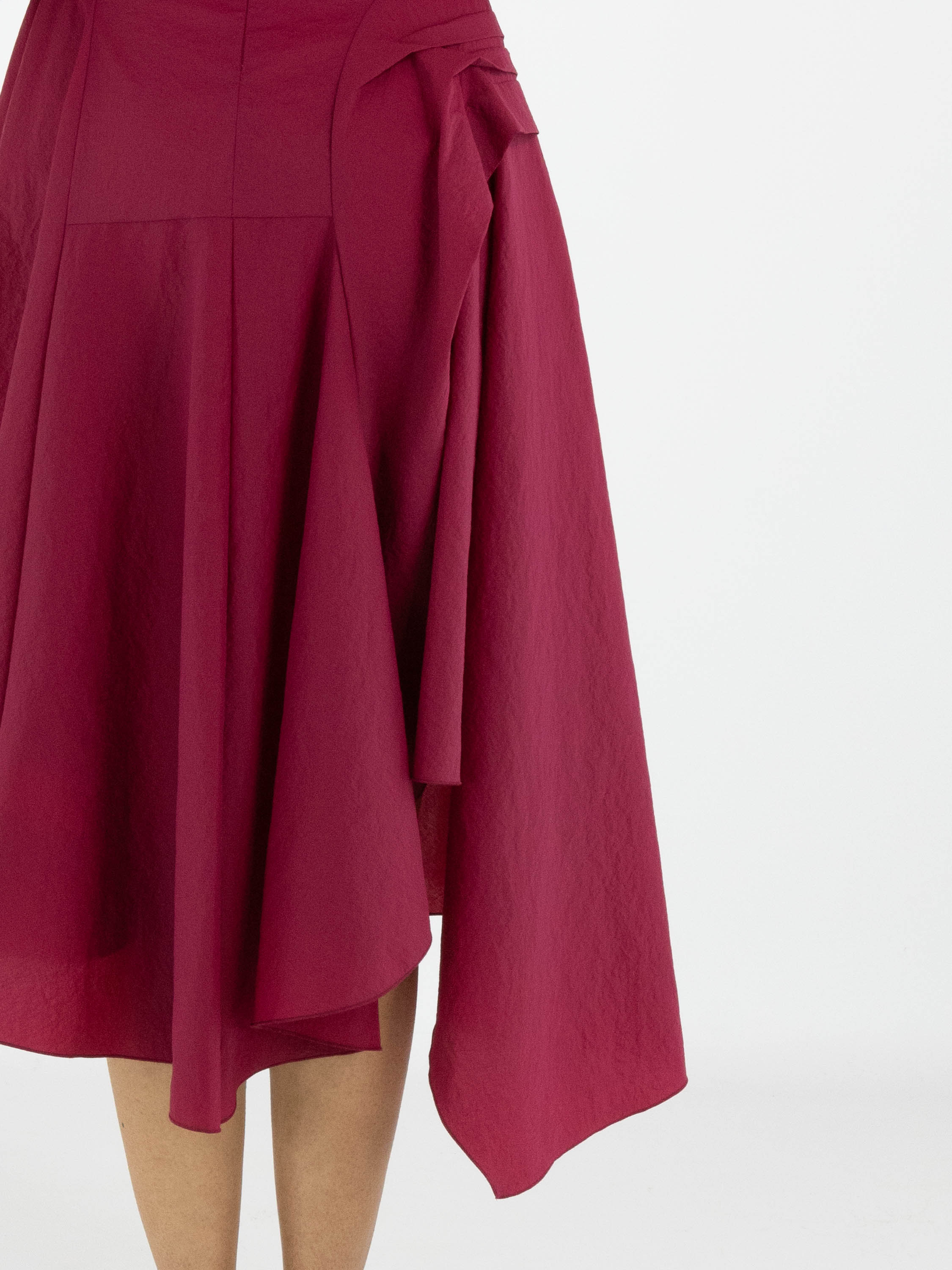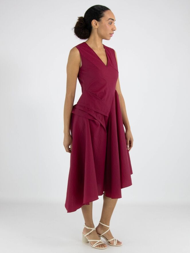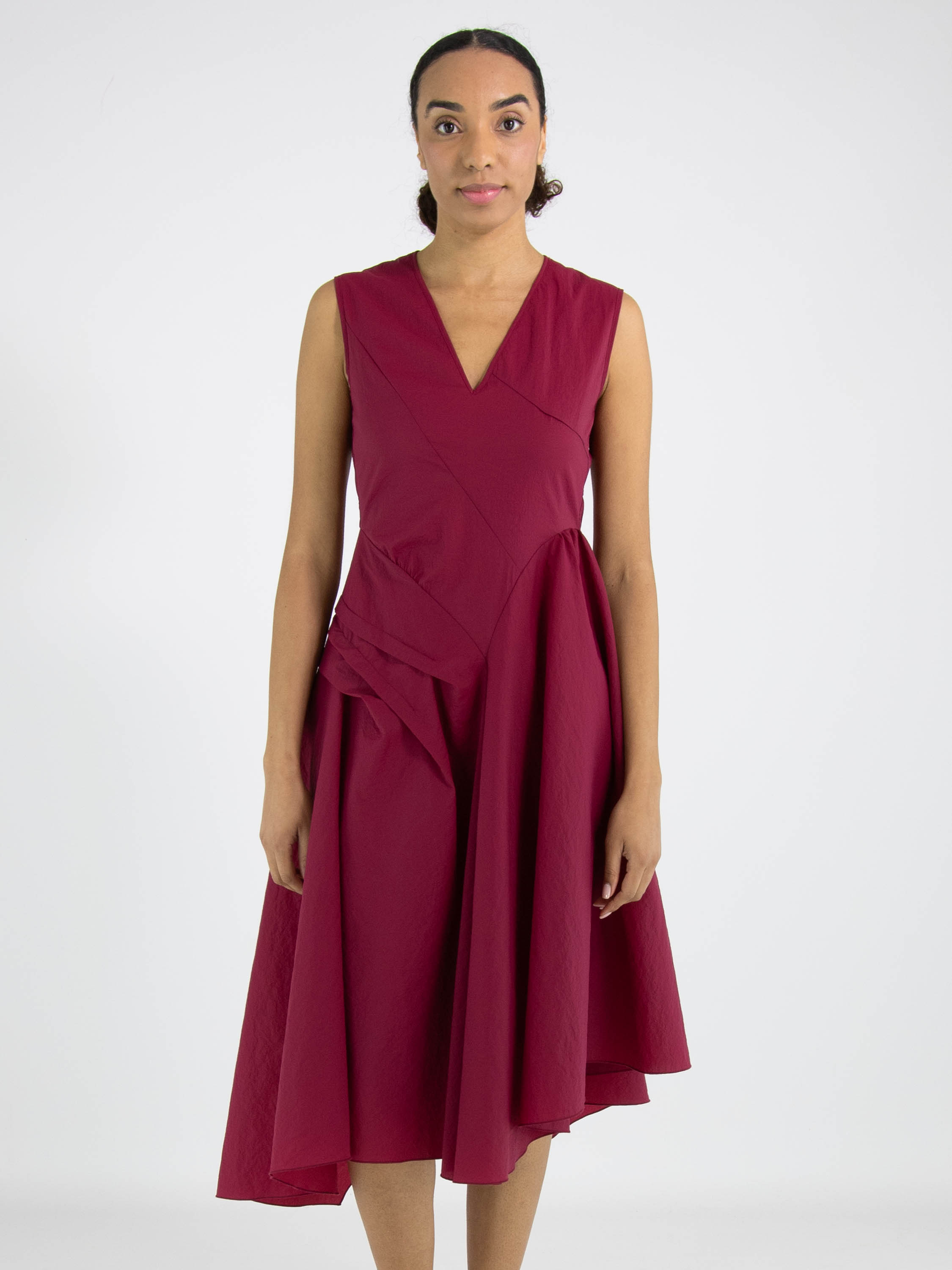 Une robe de High Lab en tissu parachute opaque de couleur framboise. La robe présente un col en V et une couture plissée diagonale partant de l’épaule gauche vers le côté droit de la taille. Sur le côté gauche de la taille, trois plis plissés sont intégrés. À partir de la taille, la robe s’évase. Cette robe peut être lavée à 30 degrés.