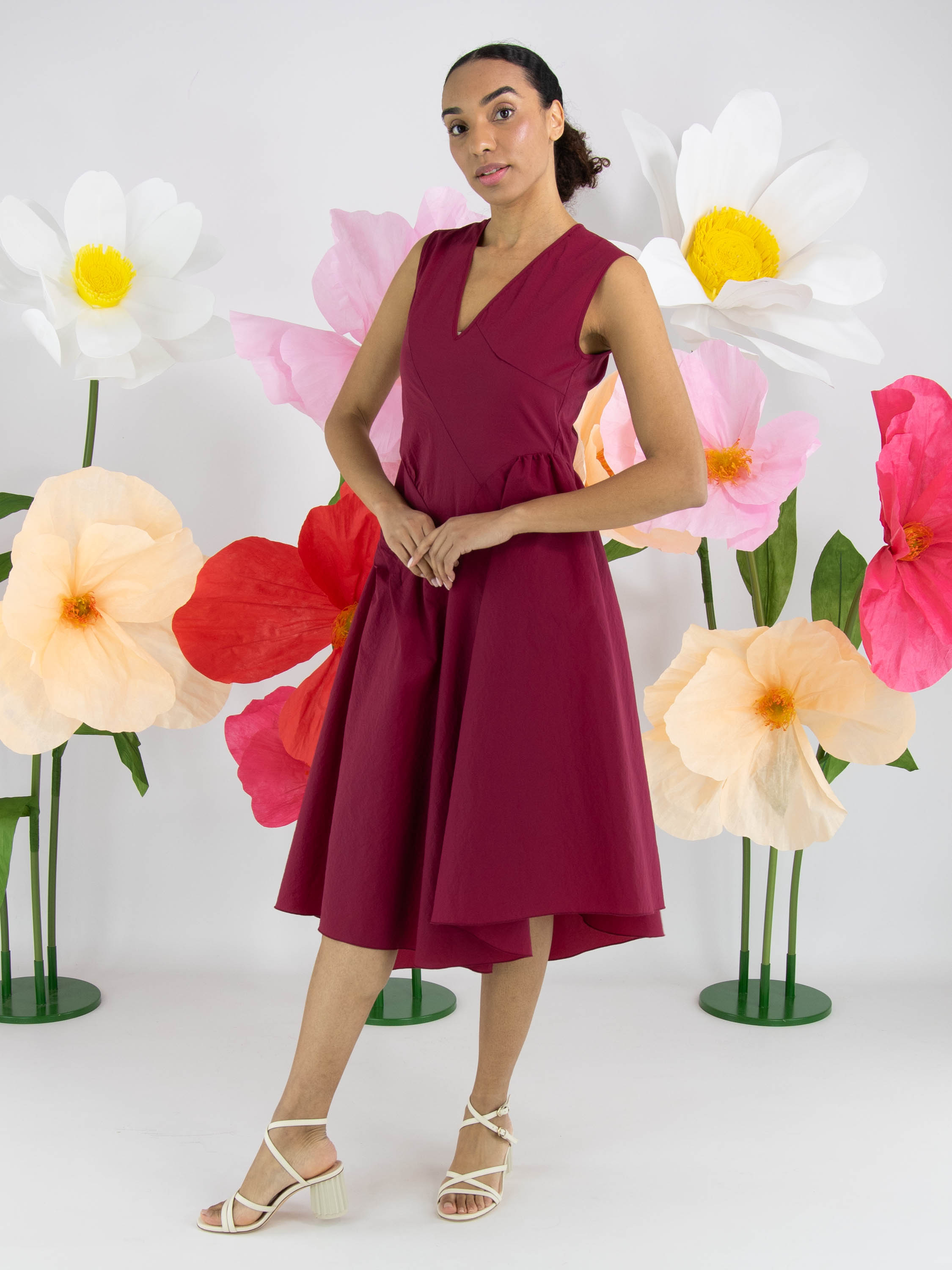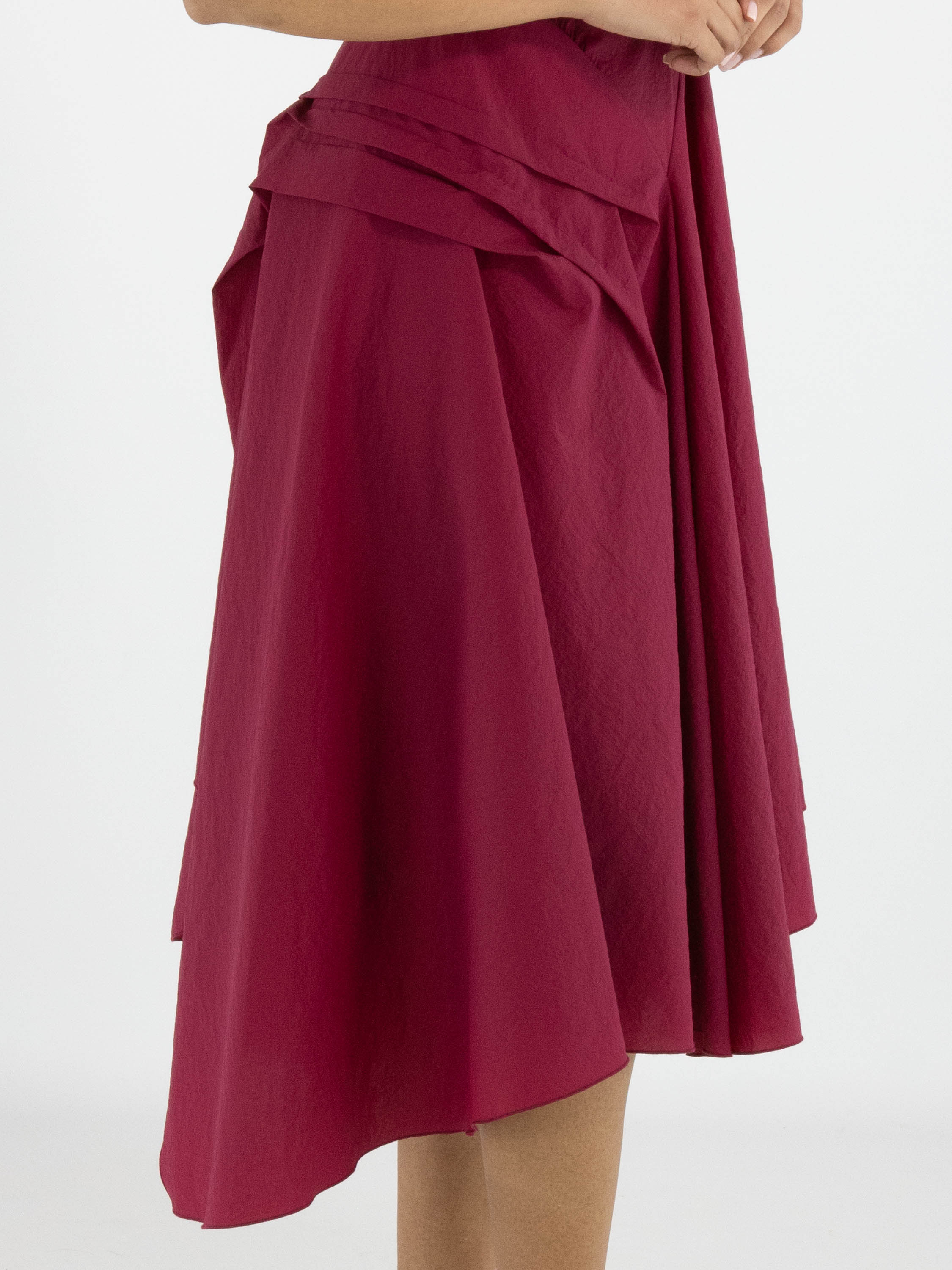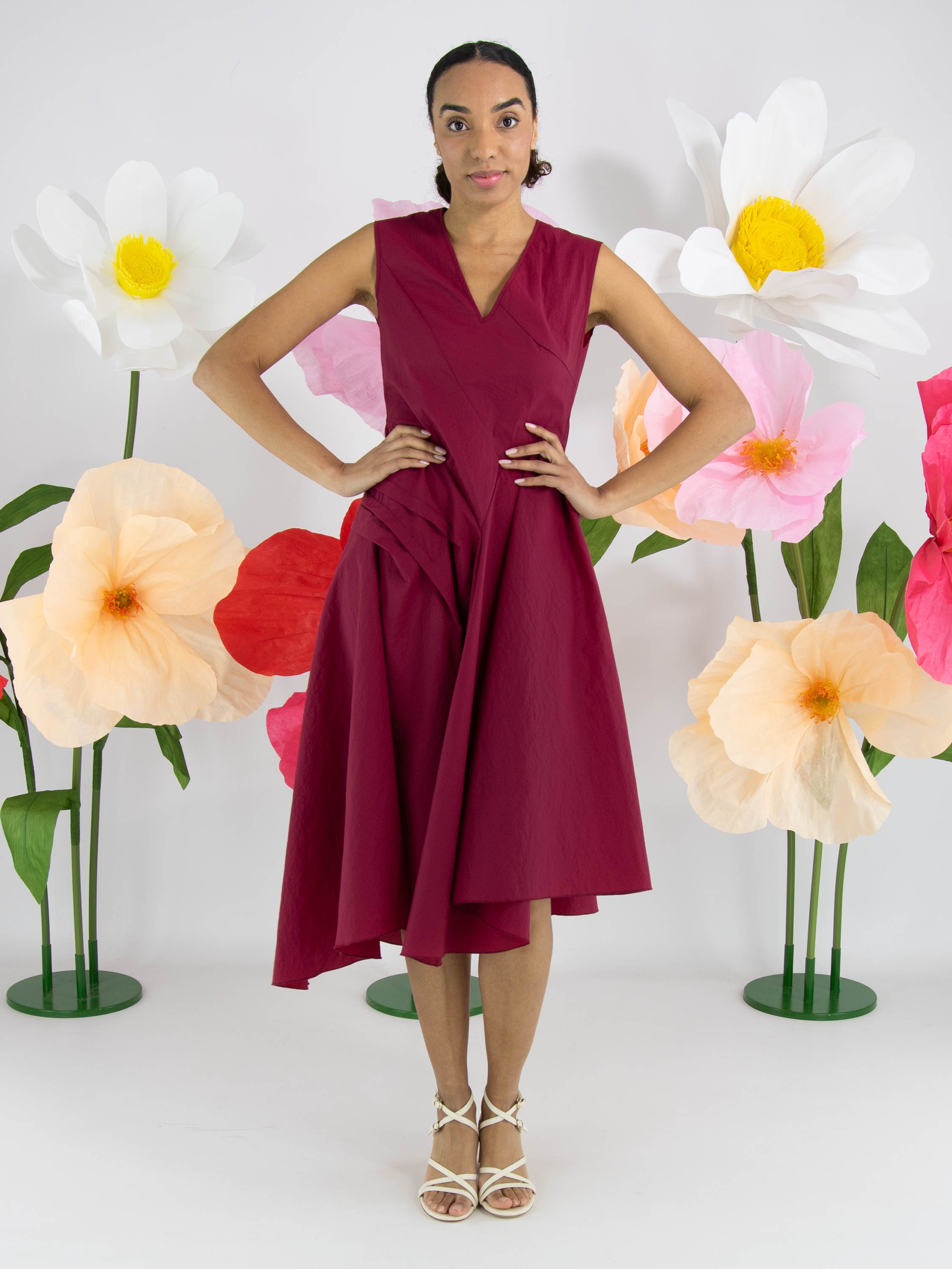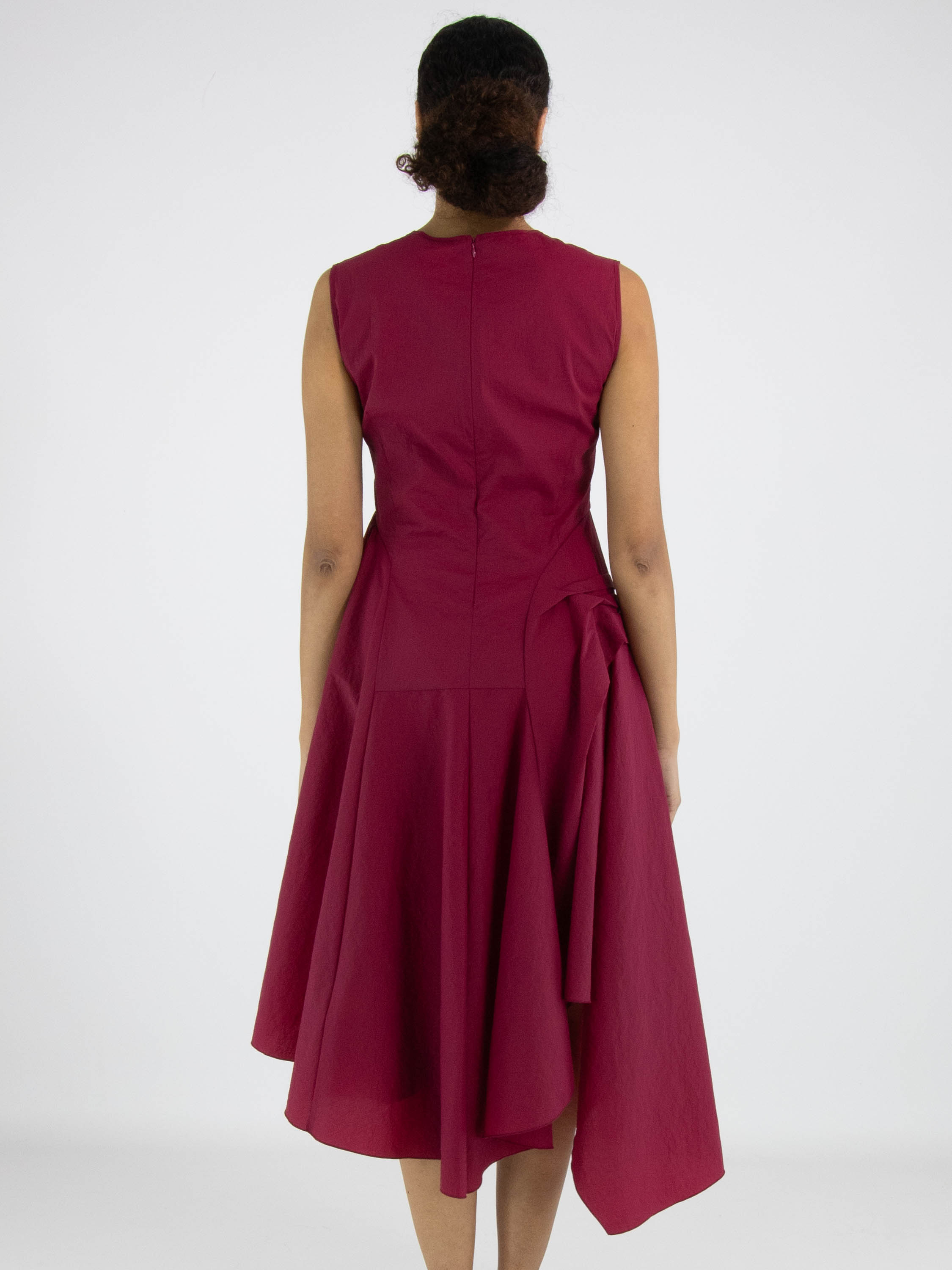 Une robe de High Lab en tissu parachute opaque de couleur framboise. La robe présente un col en V et une couture plissée diagonale partant de l’épaule gauche vers le côté droit de la taille. Sur le côté gauche de la taille, trois plis plissés sont intégrés. À partir de la taille, la robe s’évase. Cette robe peut être lavée à 30 degrés.