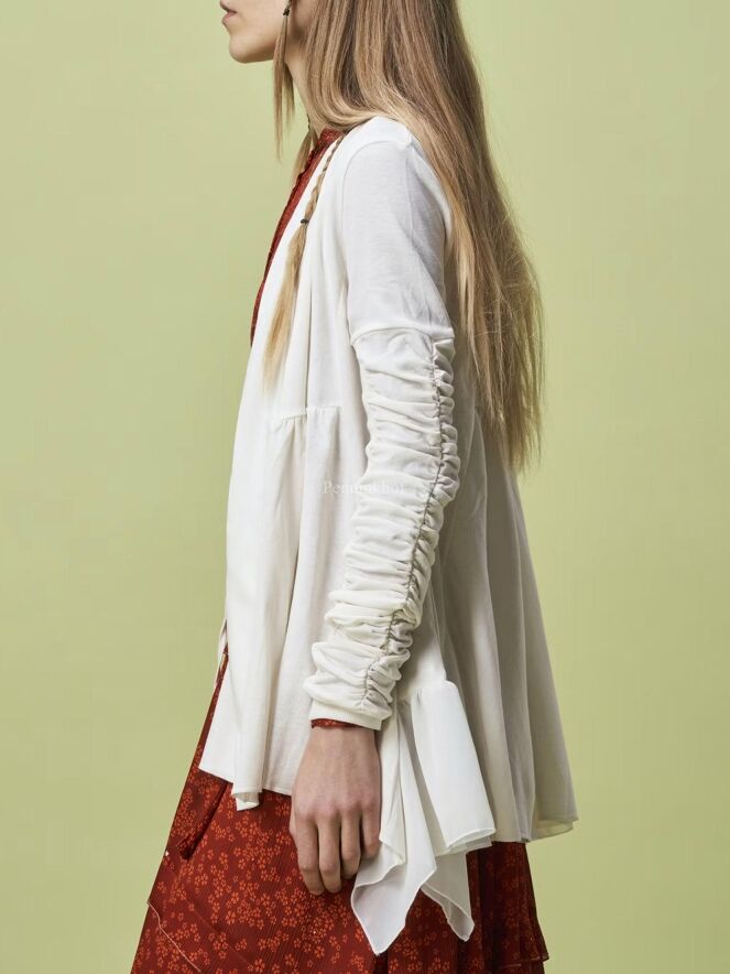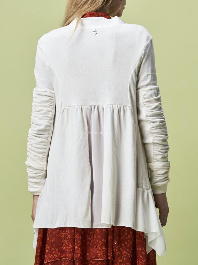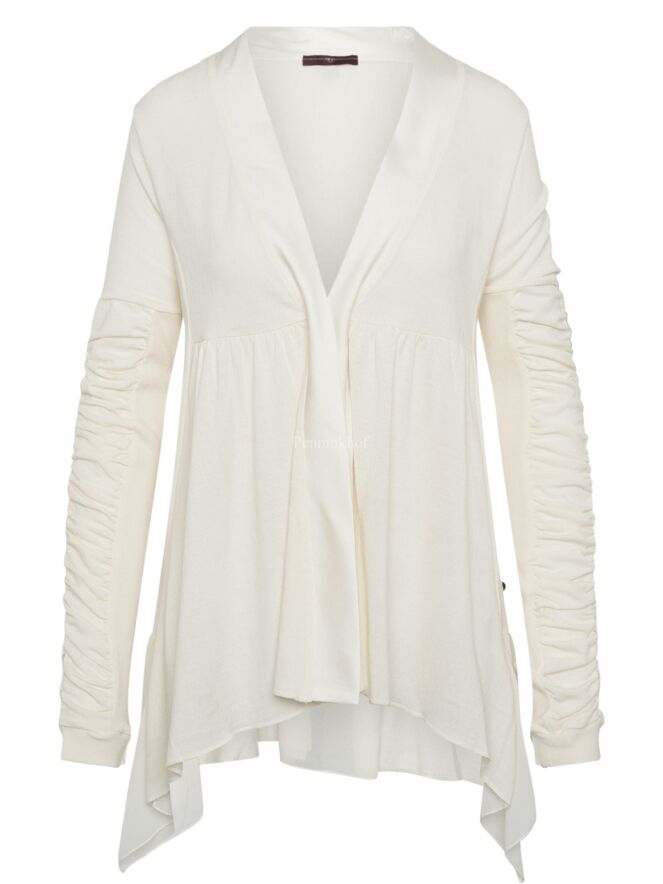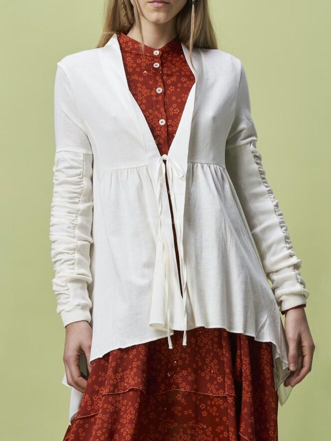 Un cardigan de High dans un coloris blanc crème. Au niveau de la taille se trouve une couture à partir de laquelle le tissu est délicatement plissé. La fermeture se fait par un cordon de serrage. Le haut des manches longues est plissé. Ce cardigan peut être lavé à la main.