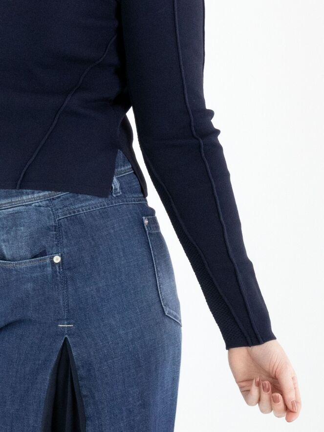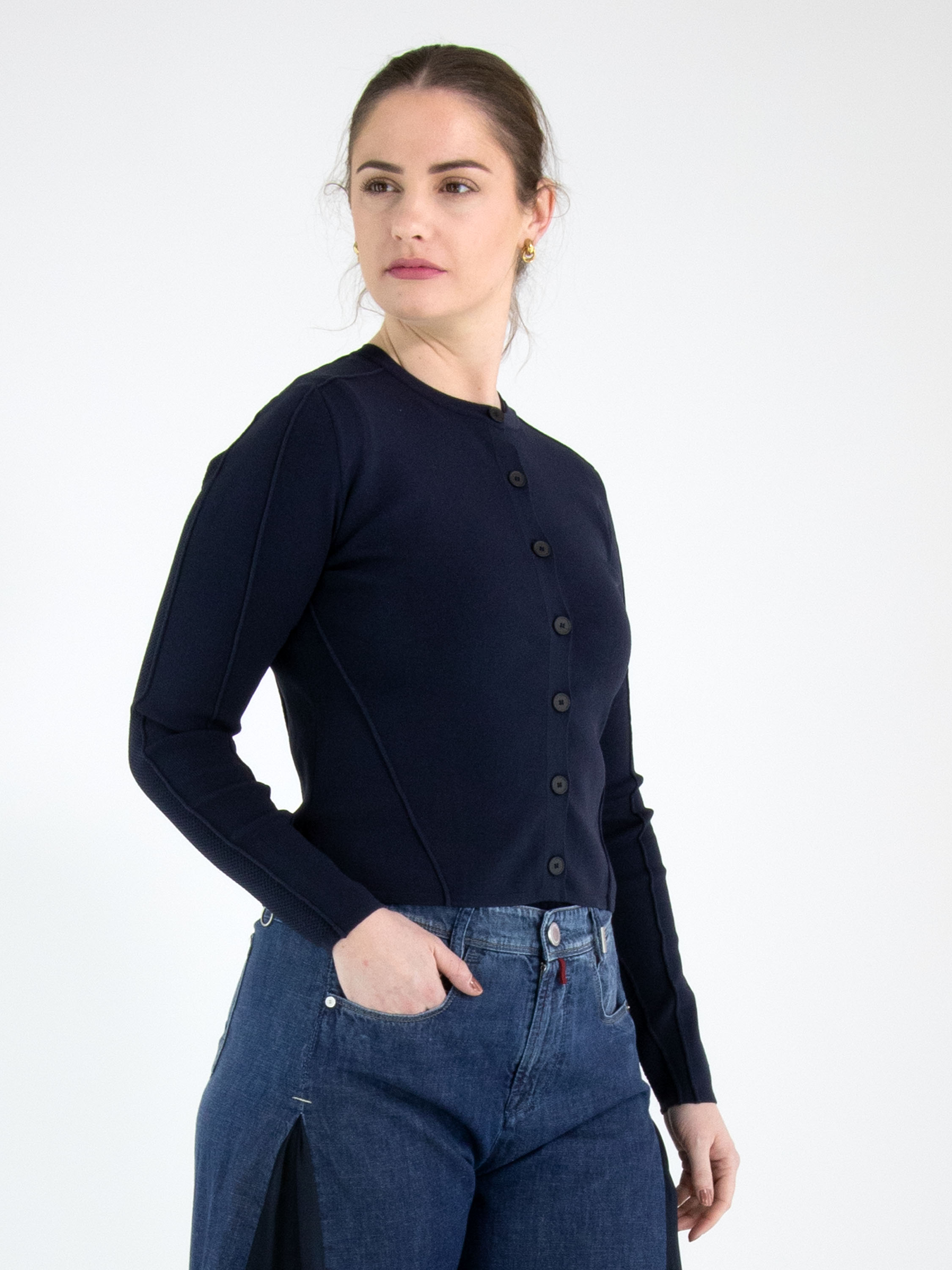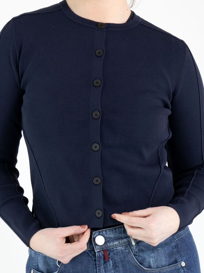 Un cardigan court de High de couleur bleu marine. Le tissu présente une structure finement côtelée. Le cardigan est doté d’une fermeture à boutons avec sept boutons bleu marine. Le bas des manches longues est réalisé dans un tissu perforé. Cette structure se prolonge en une large bande à l’arrière. Ce cardigan peut être lavé à la main.