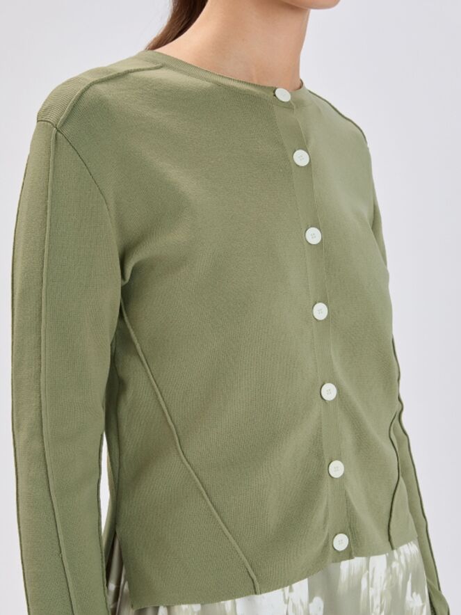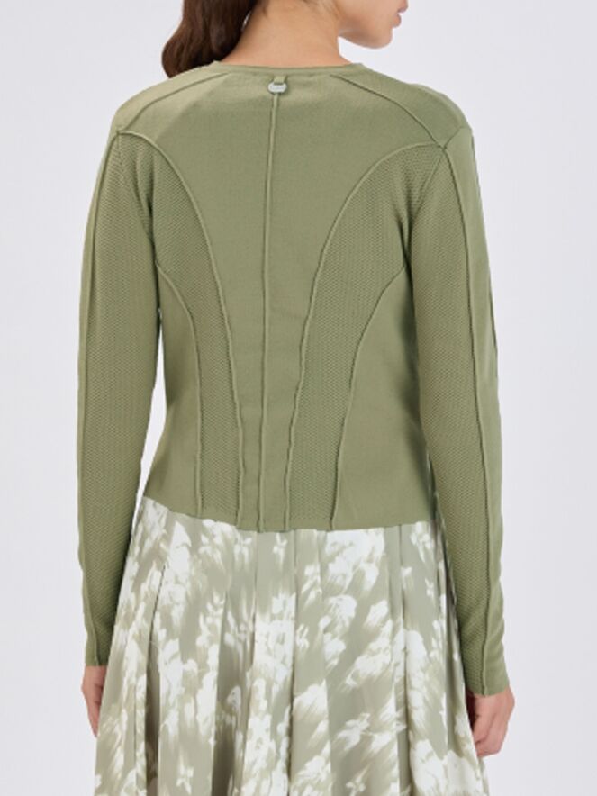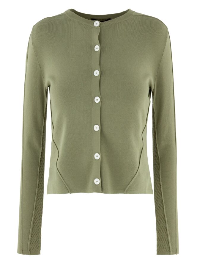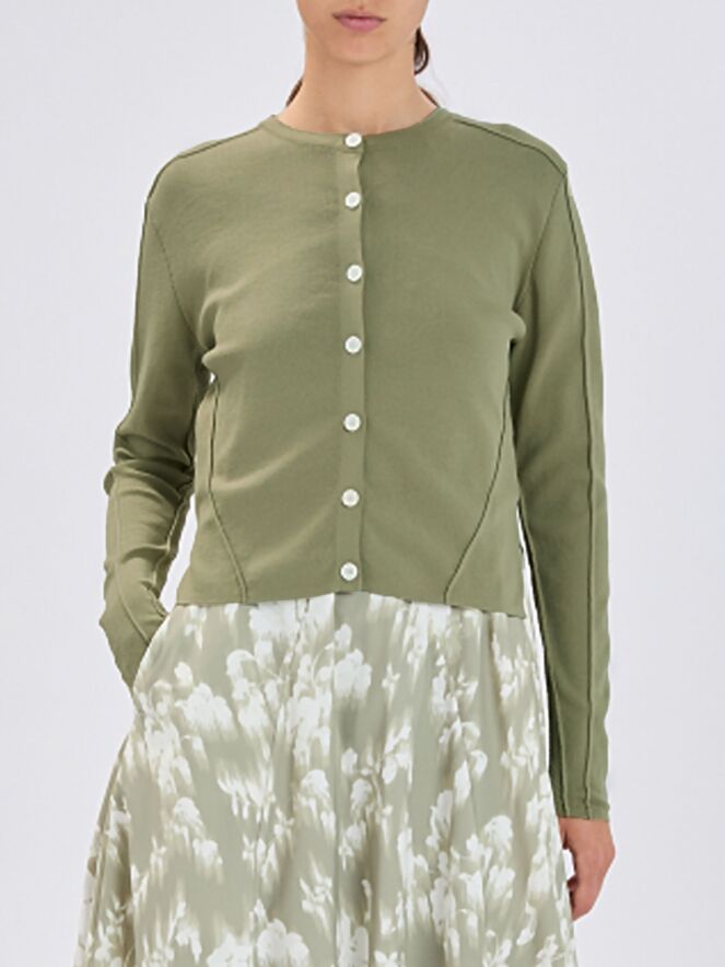 Un cardigan court de High de couleur vert olive. Le tissu présente une structure finement côtelée. Le cardigan est doté d’une fermeture à boutons avec sept boutons écru. Le bas des manches longues est réalisé dans un tissu perforé. Cette structure se prolonge dans une large bande au dos. Ce cardigan peut être lavé à la main.