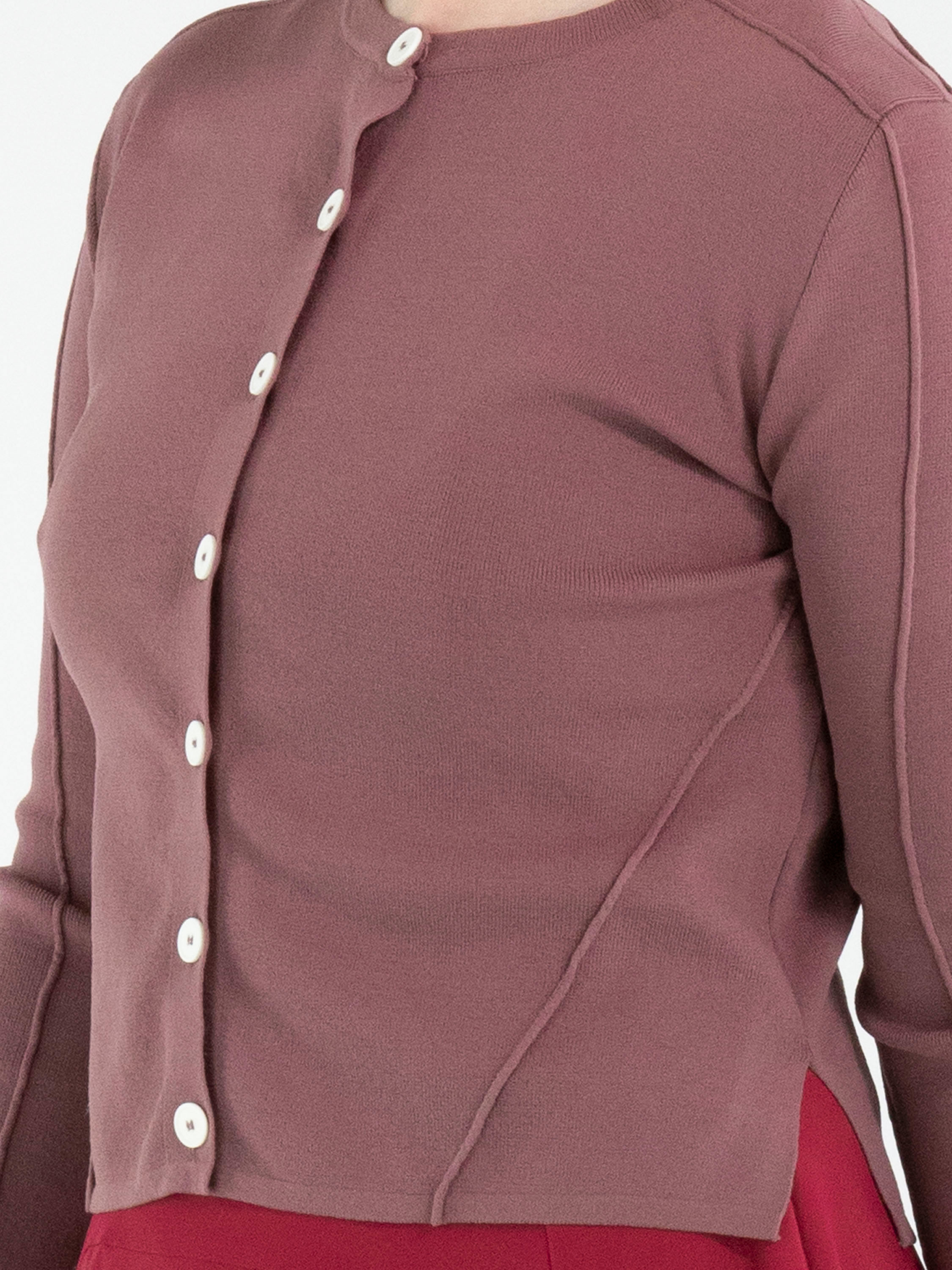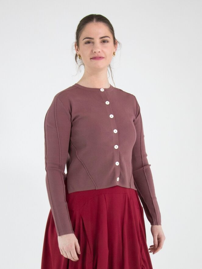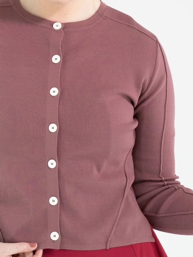 Un cardigan court de High de couleur framboise. Le tissu présente une structure finement côtelée. Le cardigan est doté d’une fermeture à boutons avec sept boutons écru. Le bas des manches longues est réalisé dans un tissu perforé. Cette structure se prolonge en une large bande à l’arrière. Ce cardigan peut être lavé à la main.