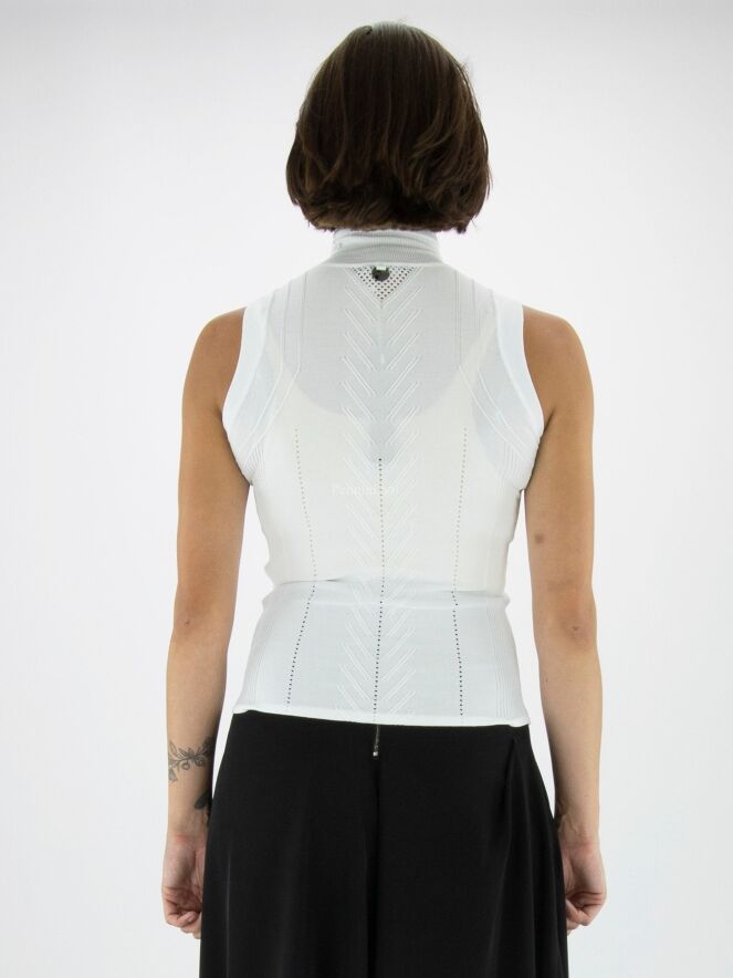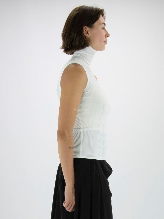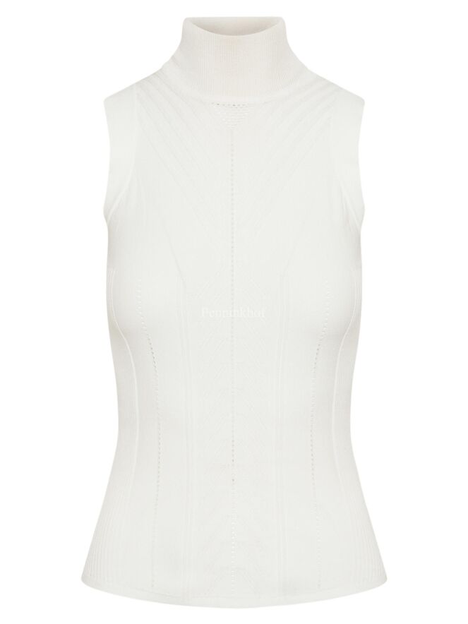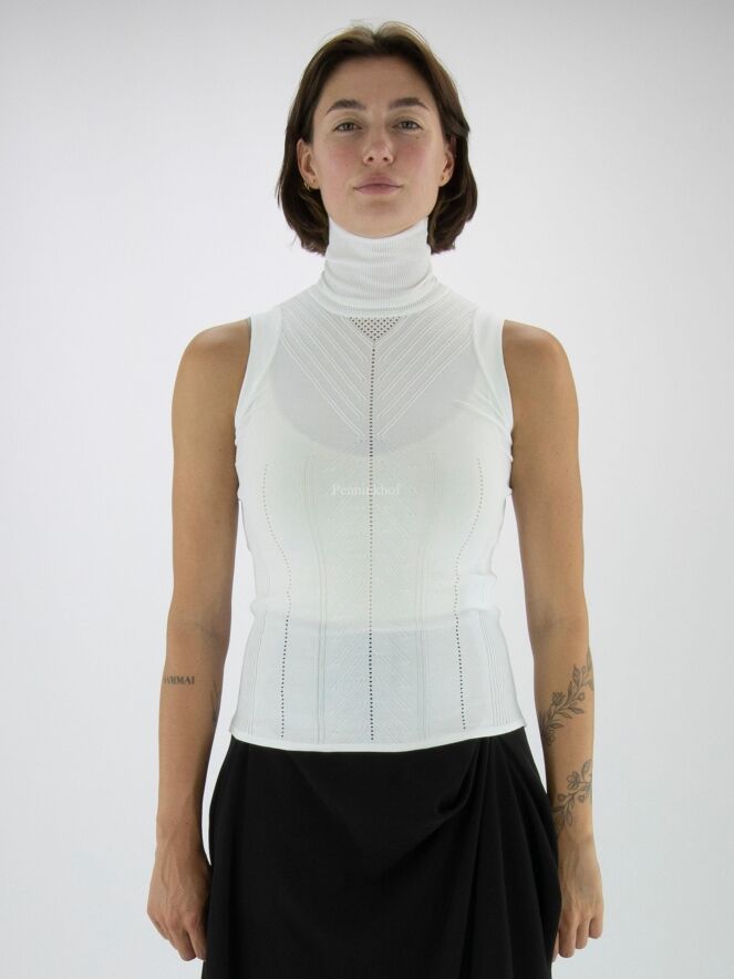 Un haut de la marque High dans une couleur blanc crème. Le top présente de multiples textures en forme de V et quelques perforations ajourées verticales. Sur les côtés, le tissu est côtelé. Le top a un col roulé et peut être lavé à la main.