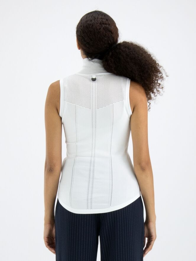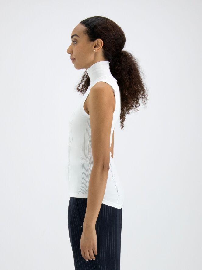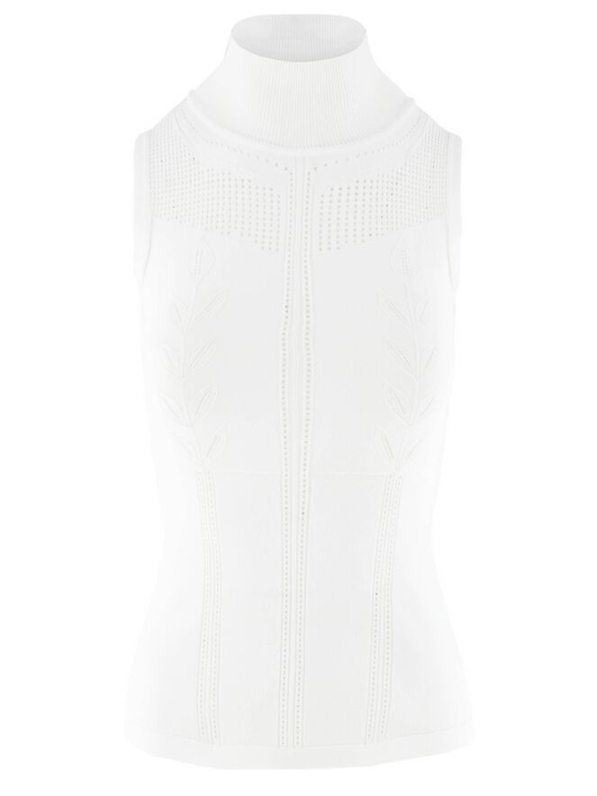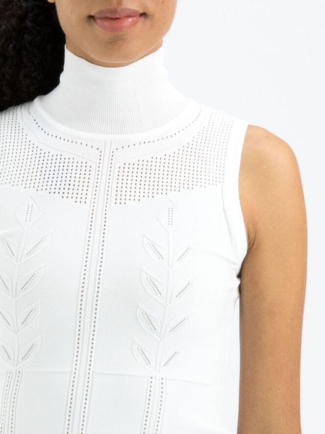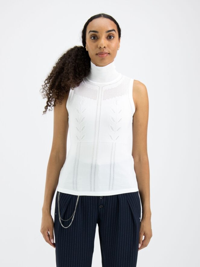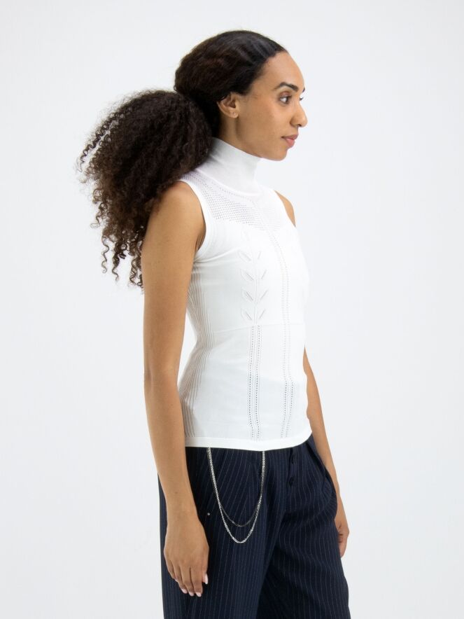 Un top de High en blanc crème. Le top présente un col roulé avec un bord en tricot finement côtelé. Du cou à la poitrine, le tissu est perforé. De la poitrine à la taille, le tissu présente un motif de feuilles avec des lignes ajourées diagonales. À partir de la taille, il y a quelques lignes ajourées verticales dans le tissu. À l'arrière, les lignes ajourées verticales commencent directement à partir du tissu perforé. Ce top peut être lavé à la main.