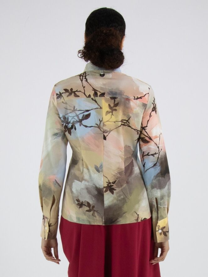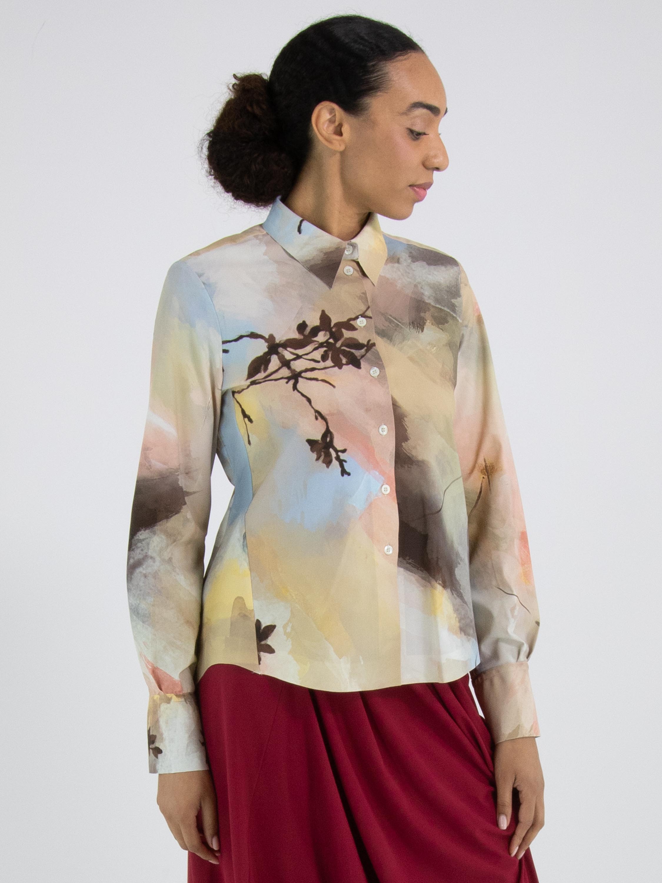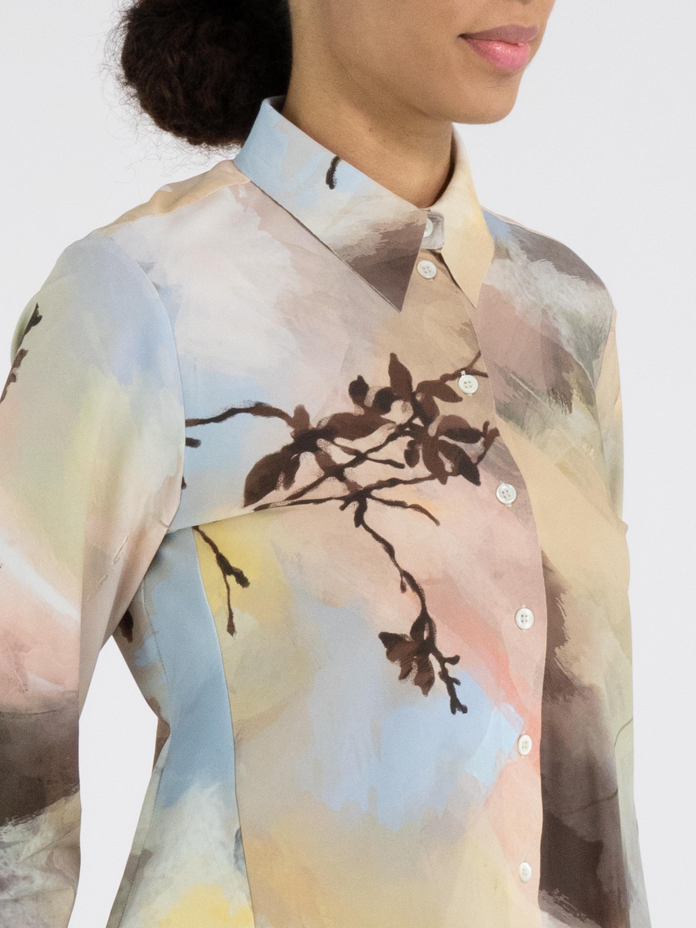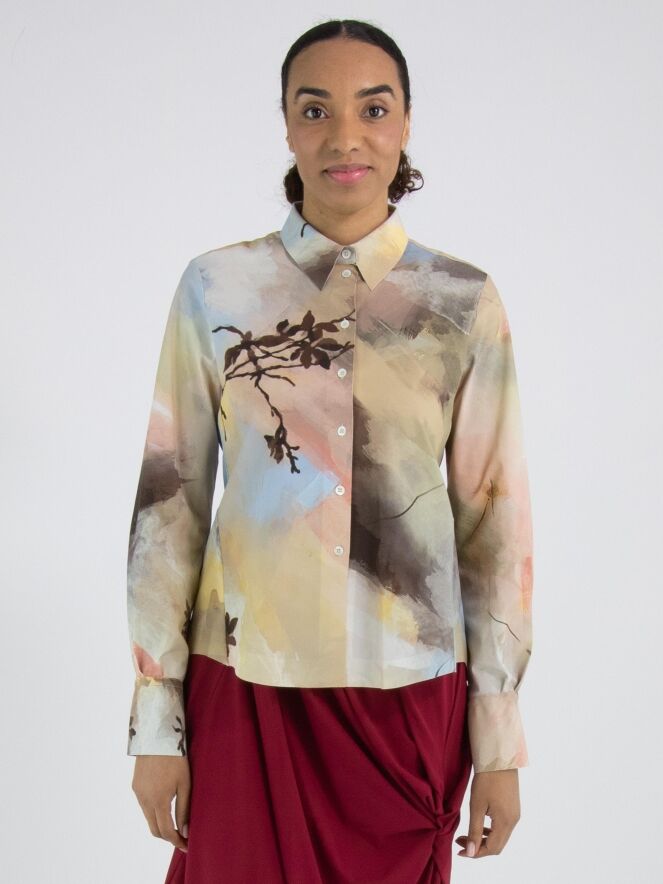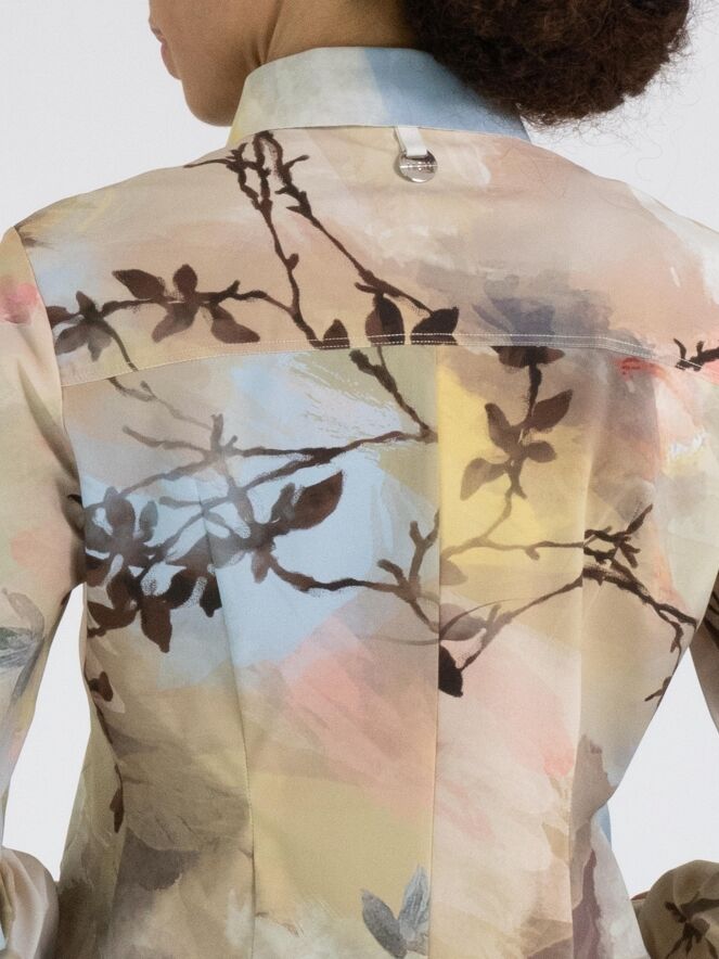 Une blouse de High Tech avec un imprimé aquarelle graphique multicolore, dominé par plusieurs nuances de taupe, de bleu pastel et de saumon. Le long du bord des poignets, le tissu est plissé à certains endroits. Cette blouse peut être lavée à la main.