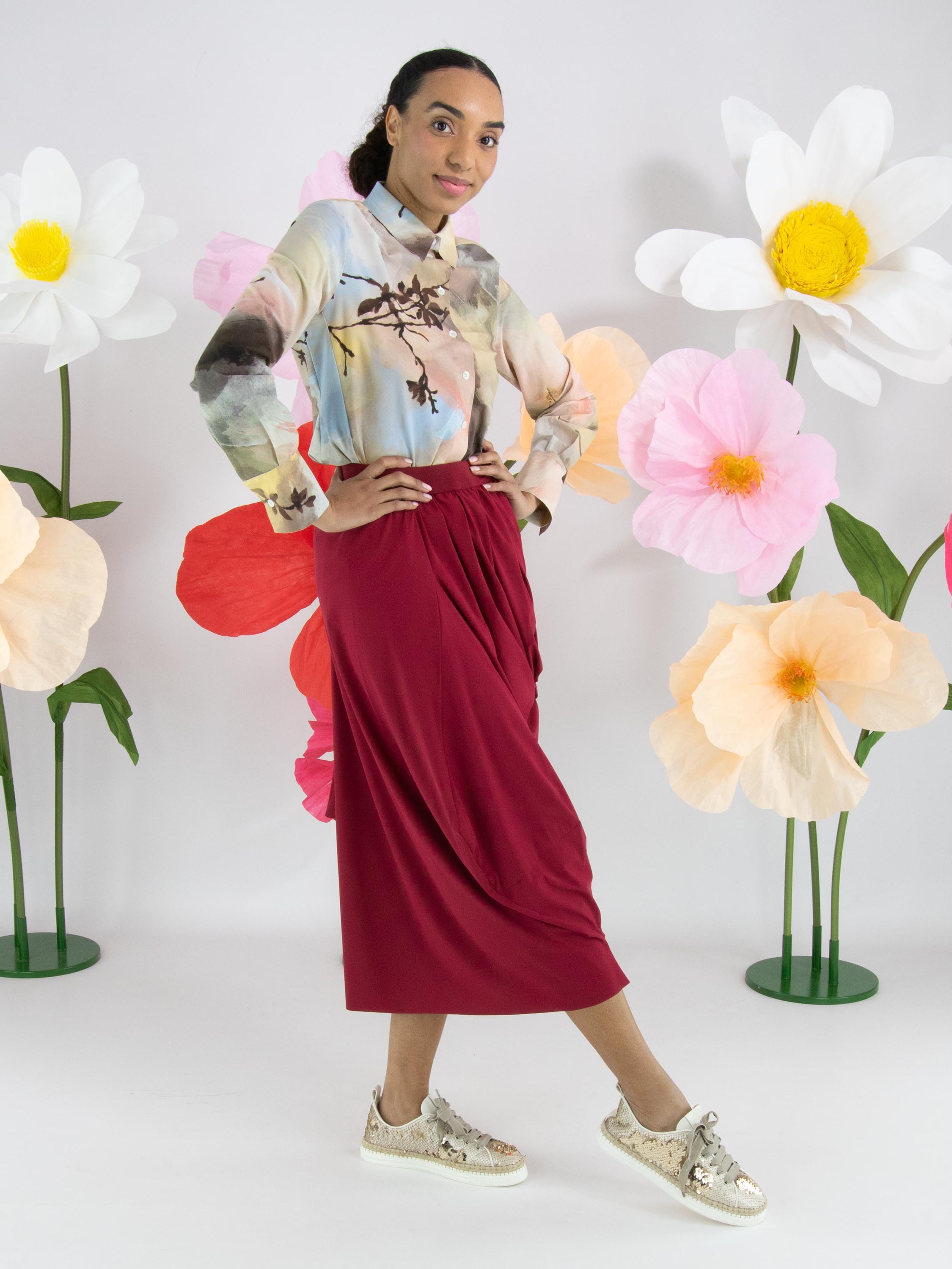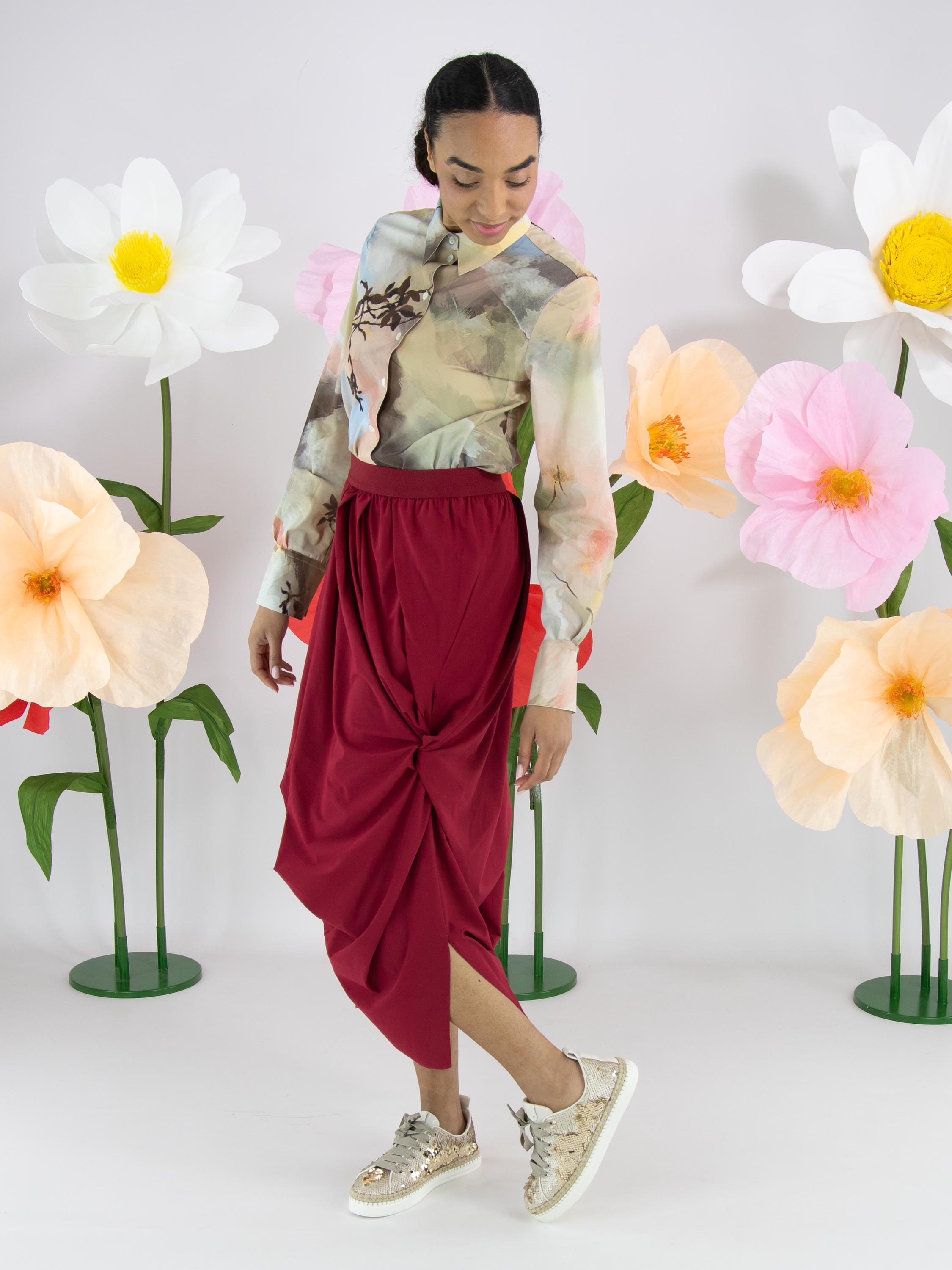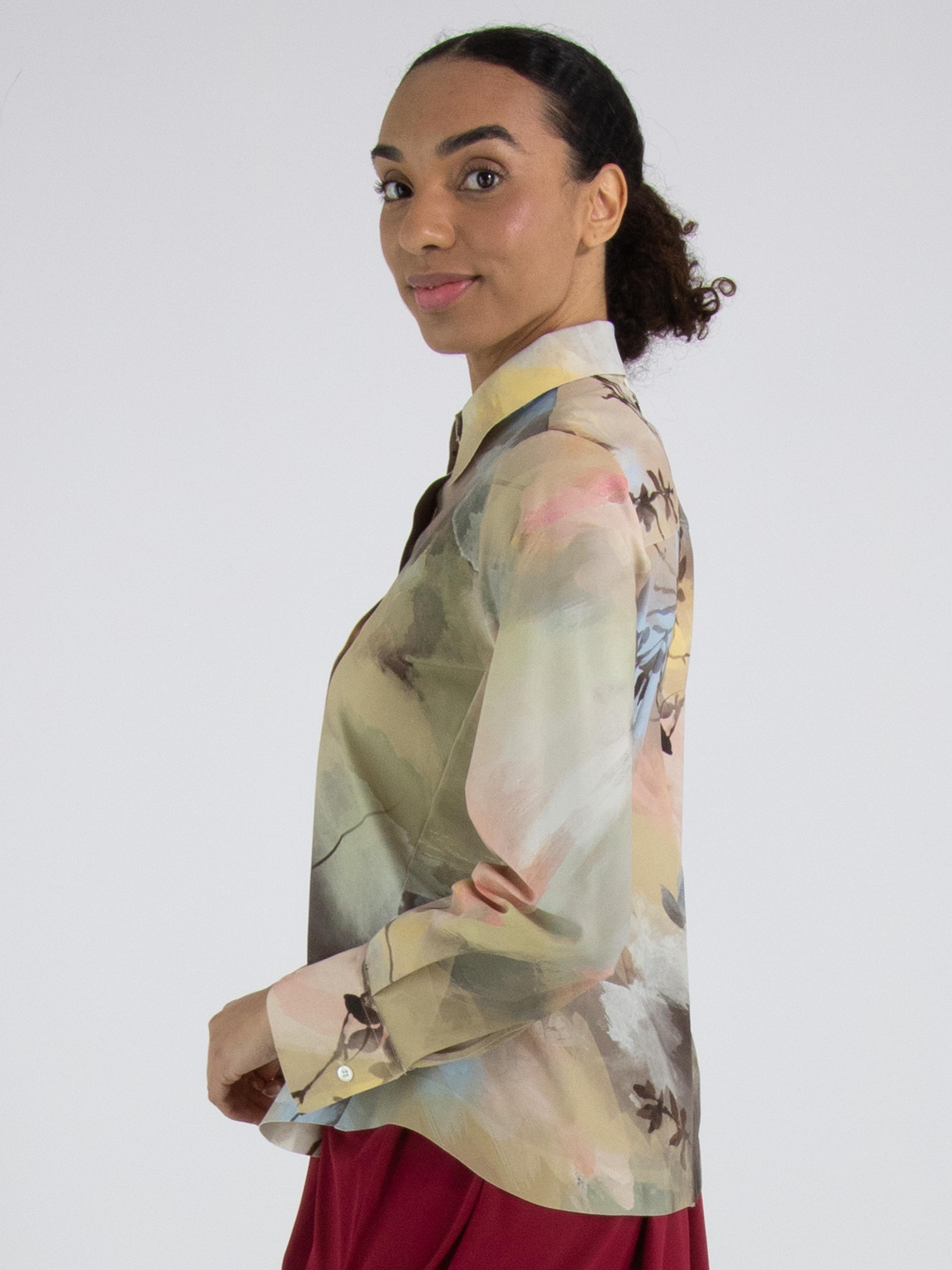 Une blouse de High Tech avec un imprimé aquarelle graphique multicolore, dominé par plusieurs nuances de taupe, de bleu pastel et de saumon. Le long du bord des poignets, le tissu est plissé à certains endroits. Cette blouse peut être lavée à la main.