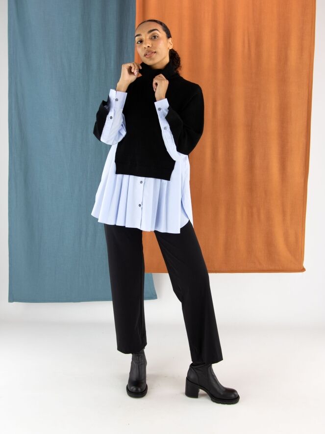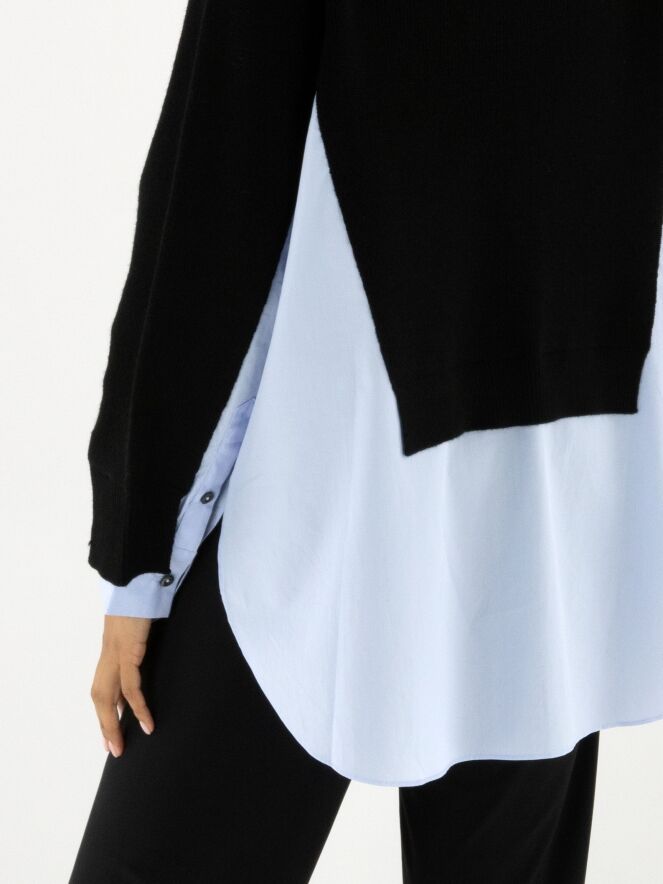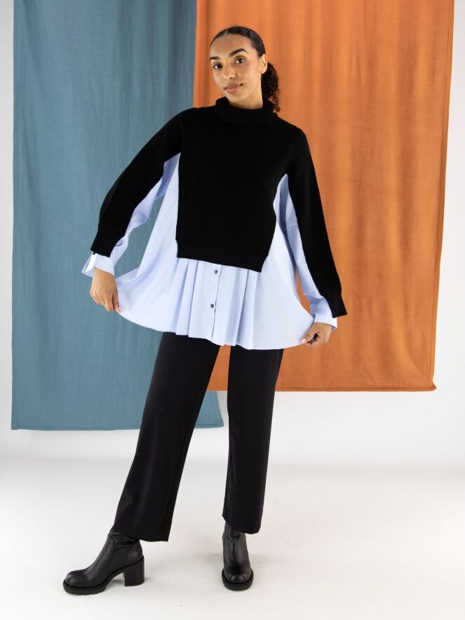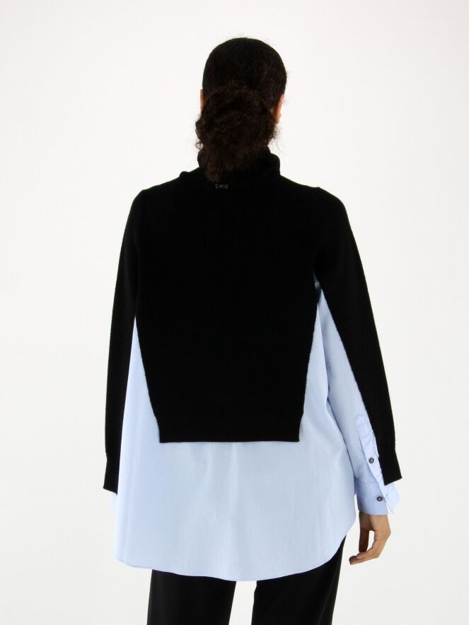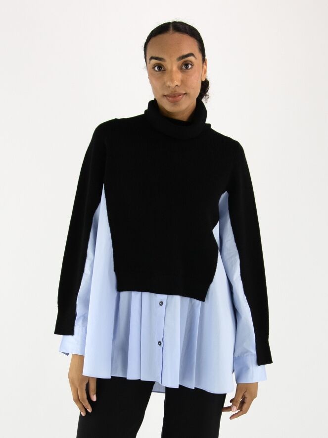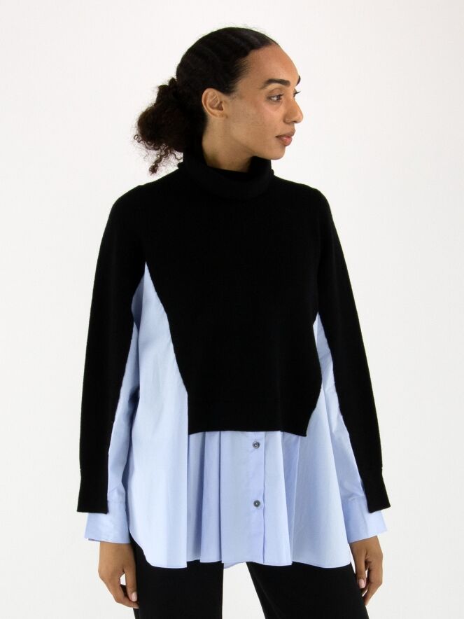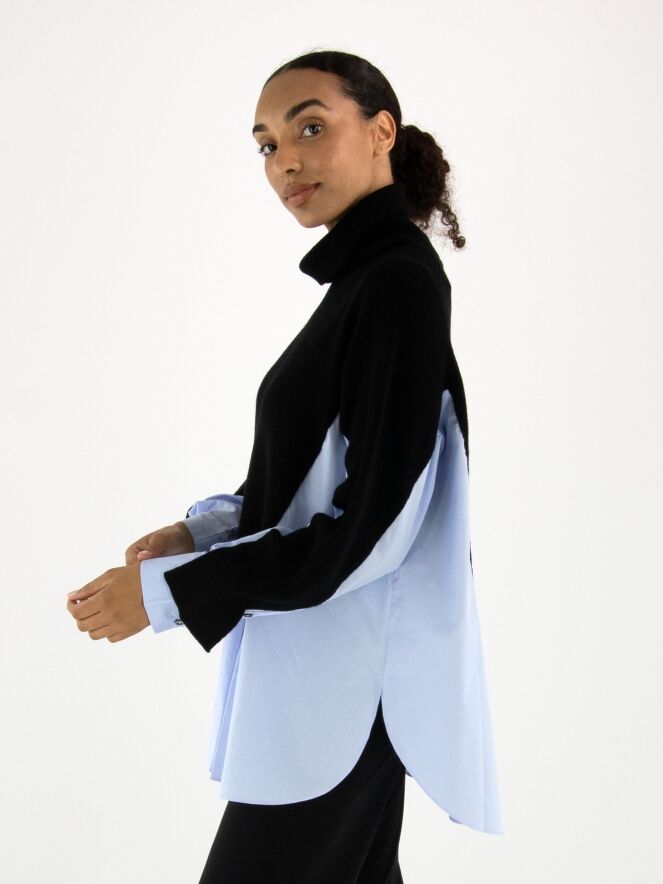 Pull de la marque High en bleu marine avec un effet chemise sur les côtés à partir de la taille et au bas des manches. La partie chemise est confectionnée dans un tissu bleu clair 100 % coton. Ce pull possède un col roulé et doit être lavé à la main.