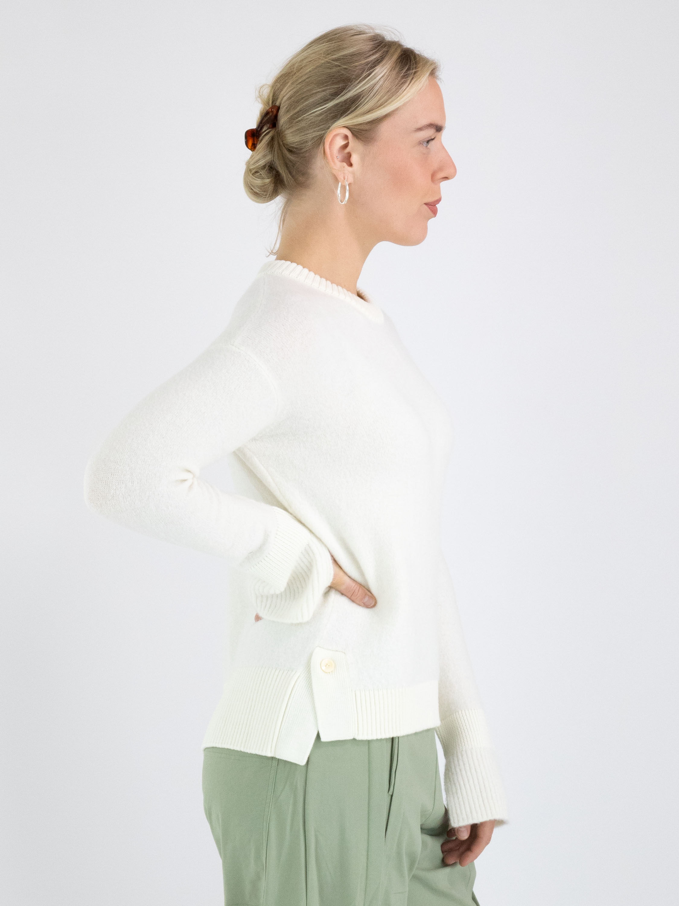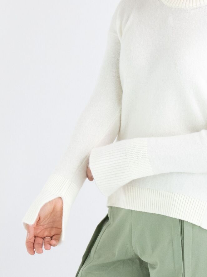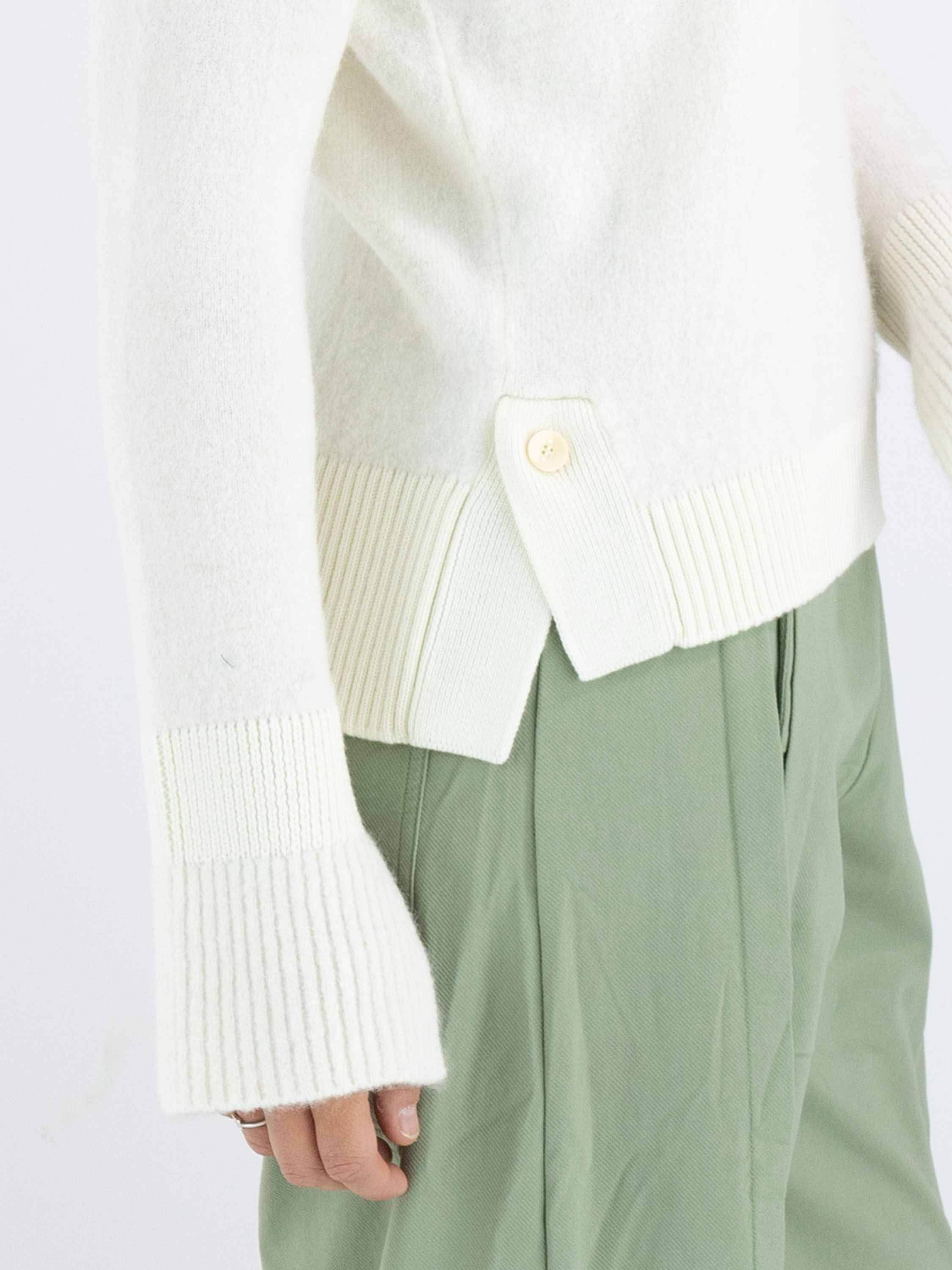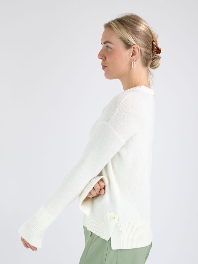Un pull de High de couleur blanc crème. Le pull a un col rond haut et des manches longues. En bas, il y a une bordure en tricot côtelé avec des fentes latérales et une fermeture à boutons. Ce pull peut être lavé à la main.