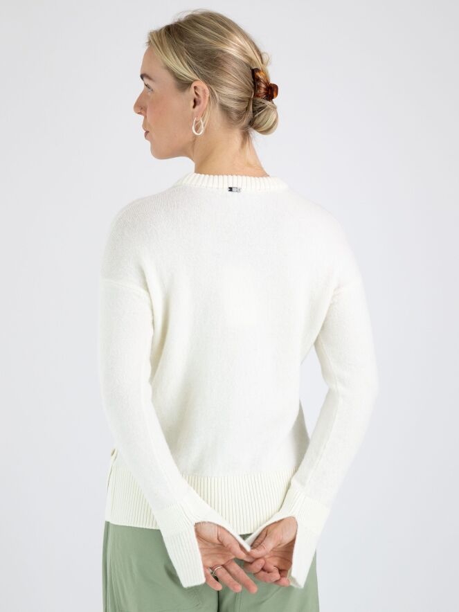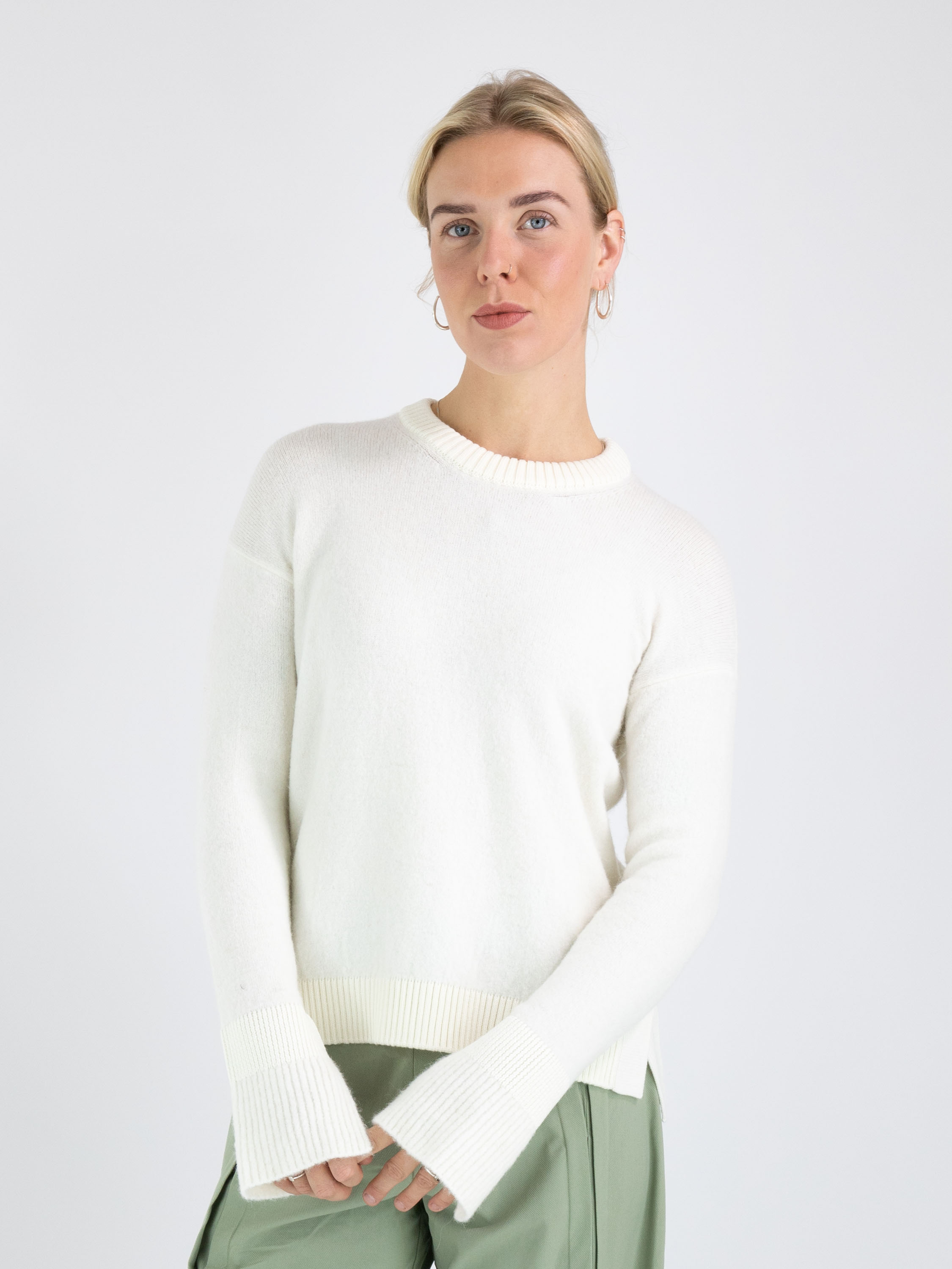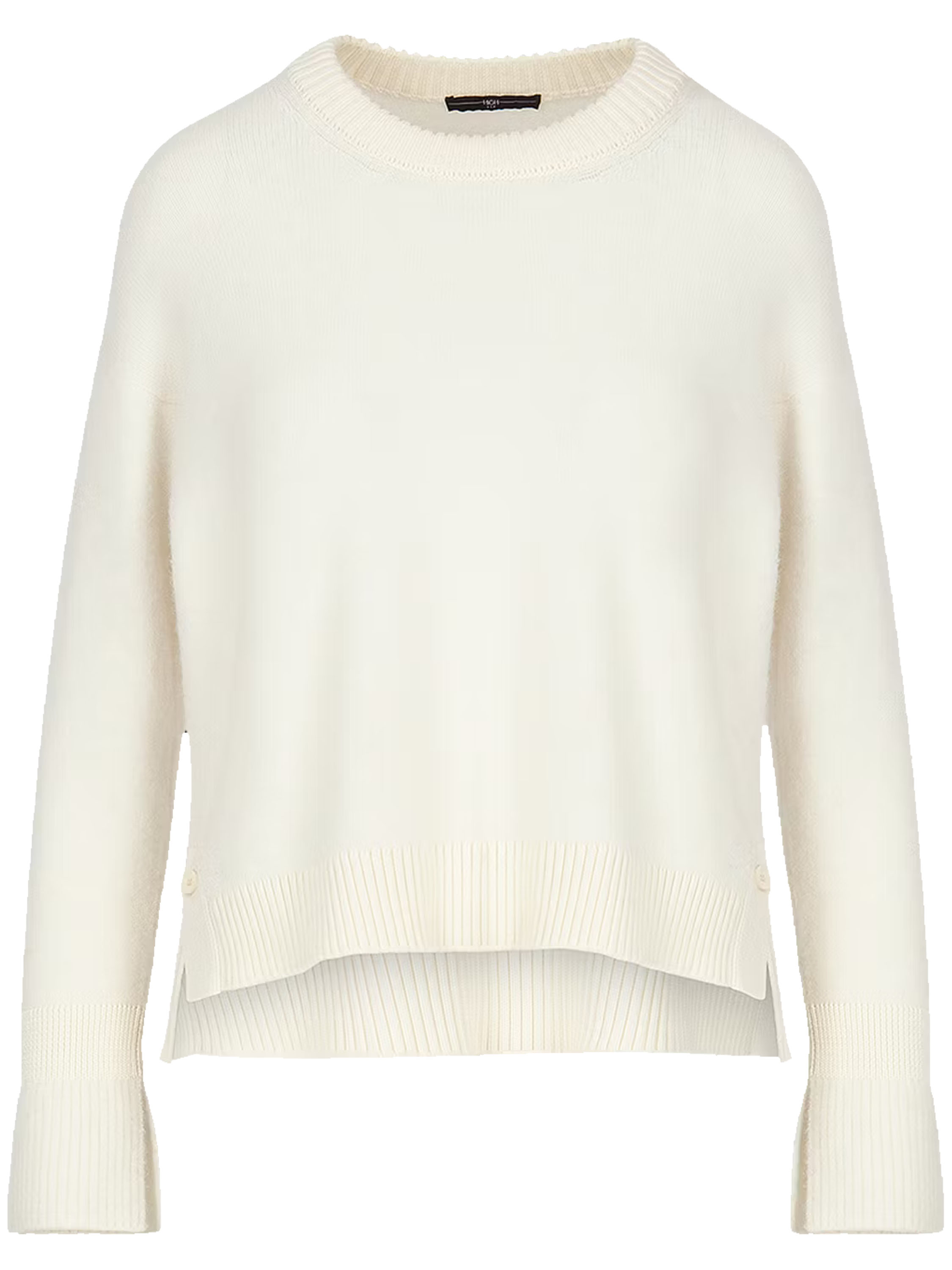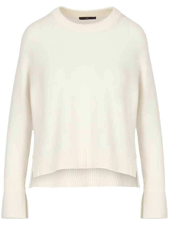 Un pull de High de couleur blanc crème. Le pull a un col rond haut et des manches longues. En bas, il y a une bordure en tricot côtelé avec des fentes latérales et une fermeture à boutons. Ce pull peut être lavé à la main.