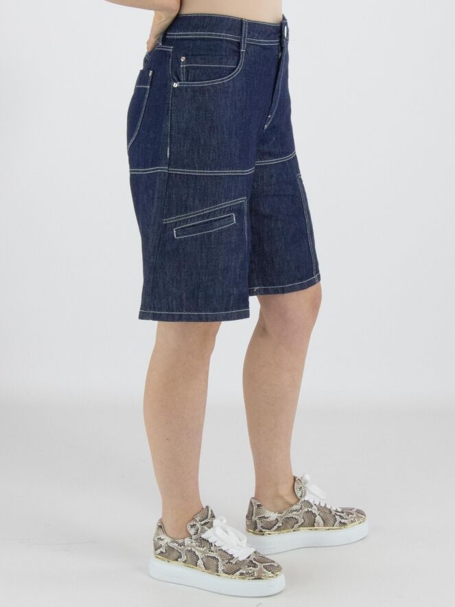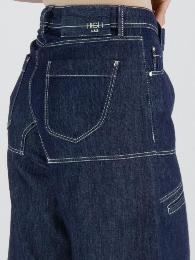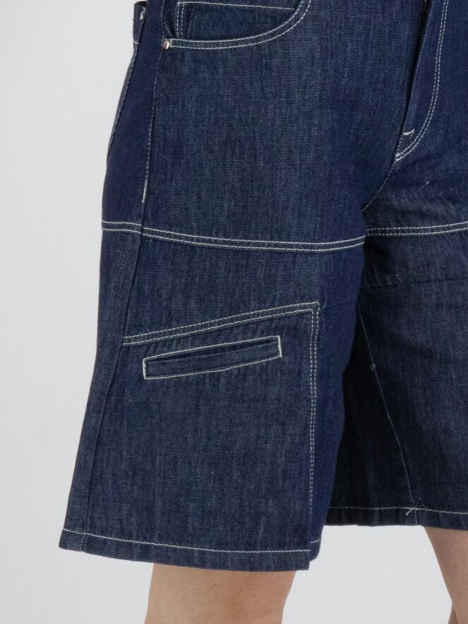 Un bermuda de High Lab en denim foncé. Le bermuda est réalisé en modèle 5 poches et présente de petites poches fendues sur les jambes à hauteur de la cuisse. Ce bermuda en jean peut être lavé à 30 degrés.