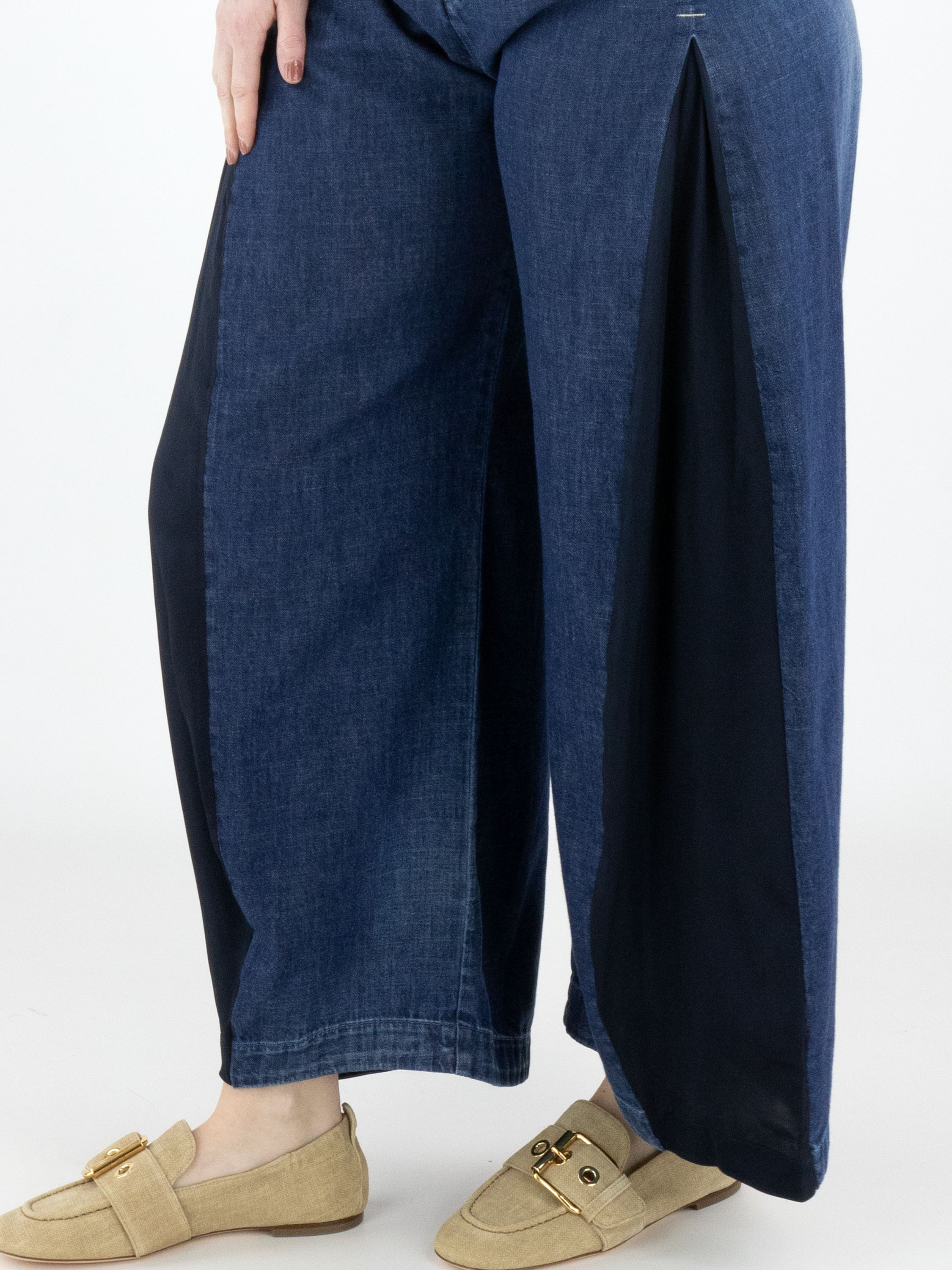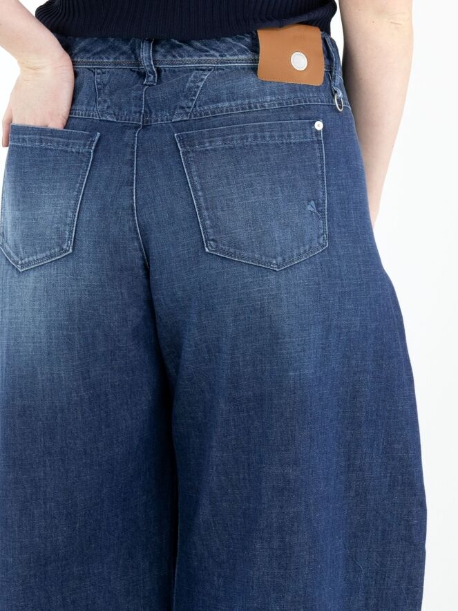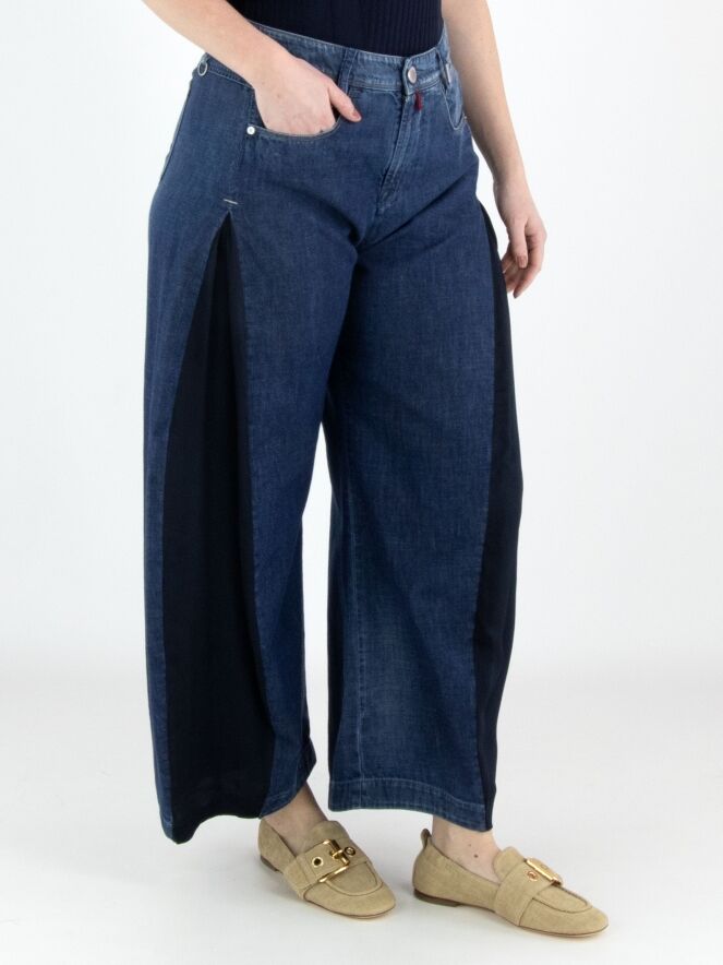 Un jean large de High en coton doux dans une couleur denim basique. Le jean est réalisé dans un modèle à cinq poches. Sur les côtés, à partir de la hanche, une fente évasée est intégrée avec un tissu satiné mat de couleur bleu marine. Ce jean peut être lavé à la main.