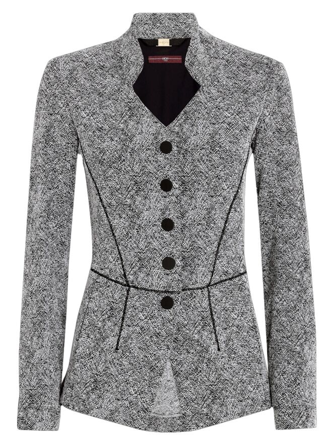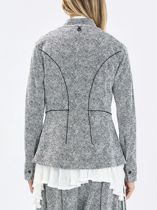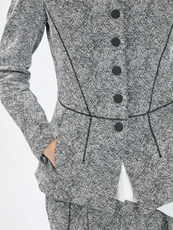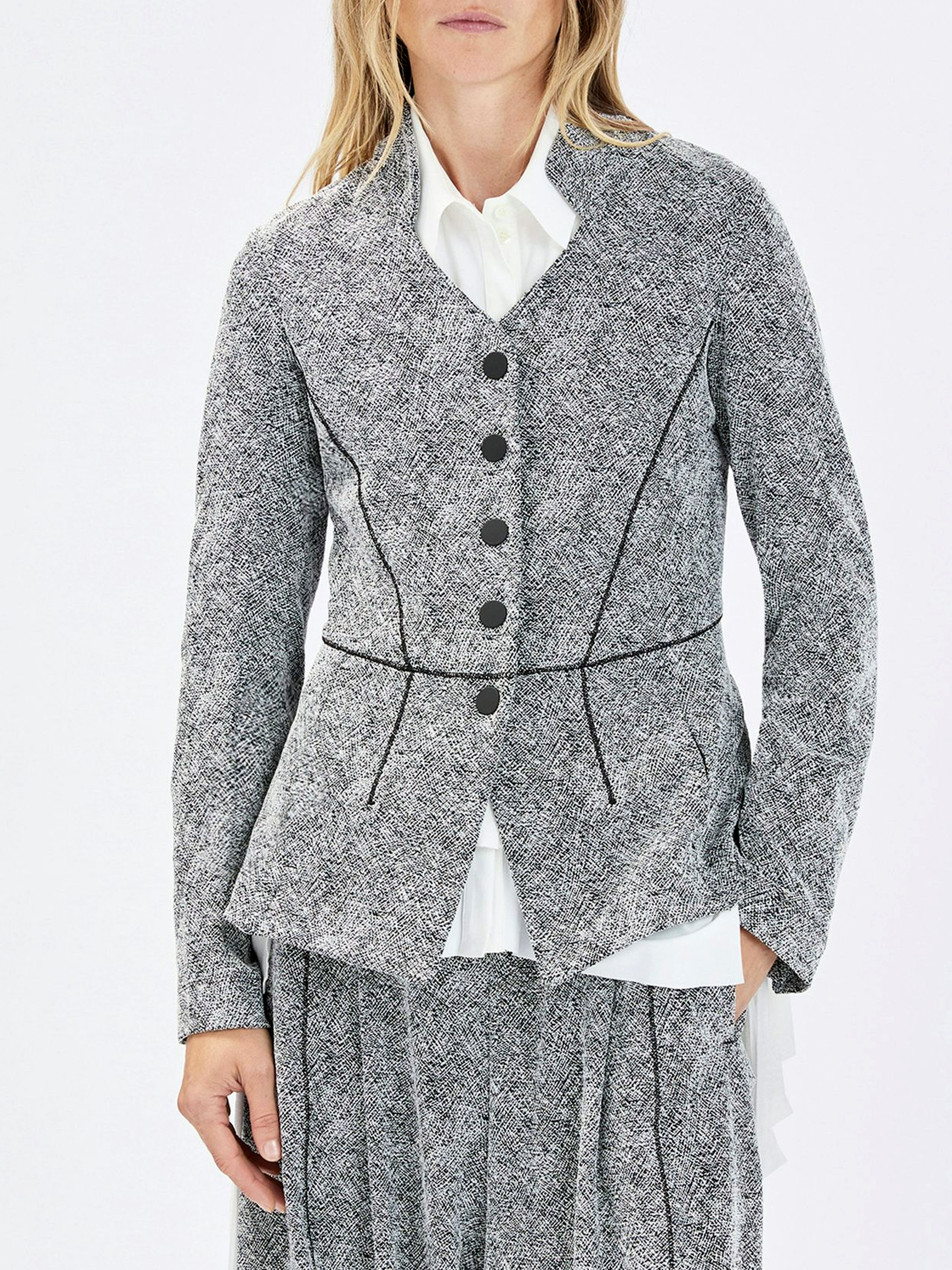 Un blazer légèrement cintré de High dans un tissu chiné noir et blanc. Le blazer est doté d’une fermeture à cinq boutons-pression noirs. Le blazer n’est pas doublé et peut être lavé à la main.