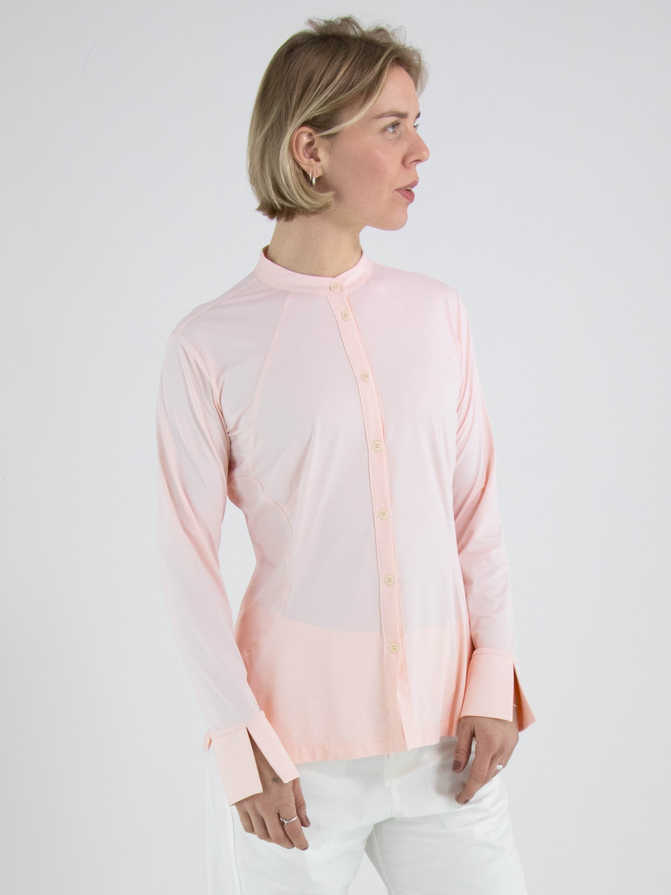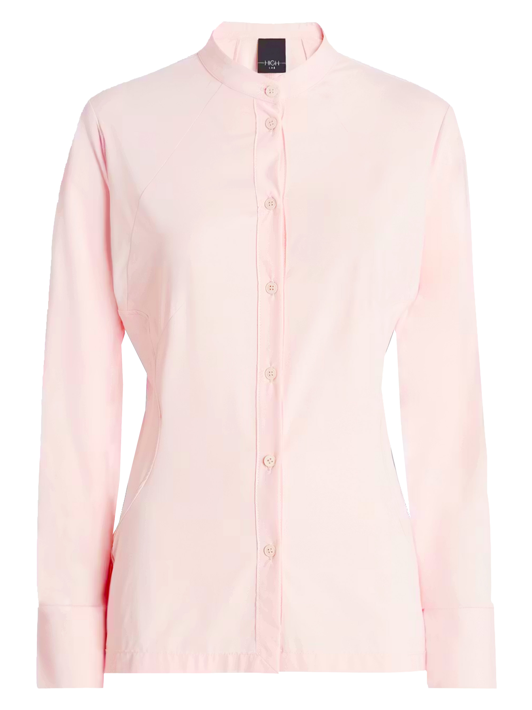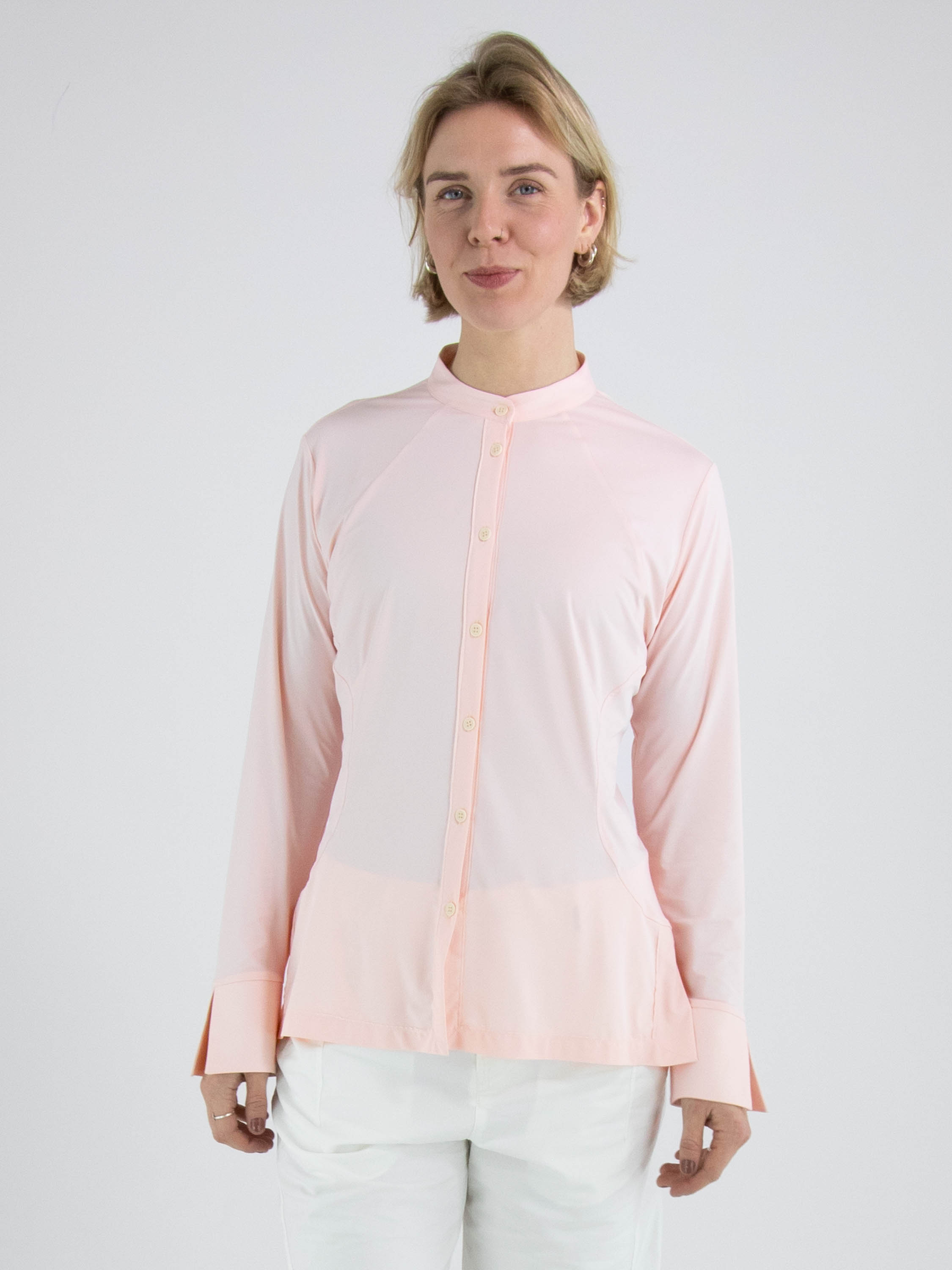 Une blouse de High Lab de couleur rose pastel. La blouse est légèrement cintrée et ne possède pas de col. En bas, une petite fente est présente de chaque côté. Cette blouse peut être lavée à la main.