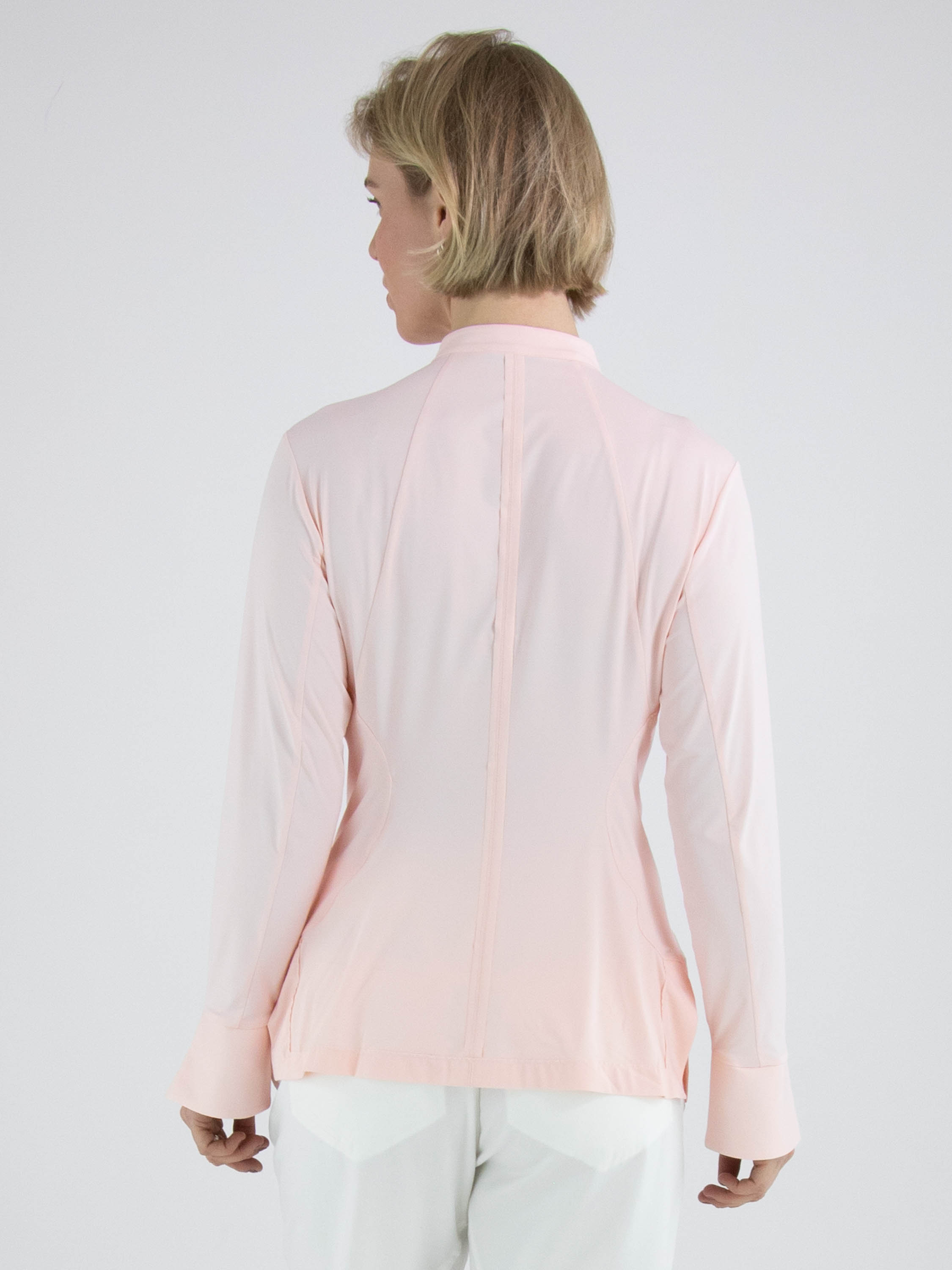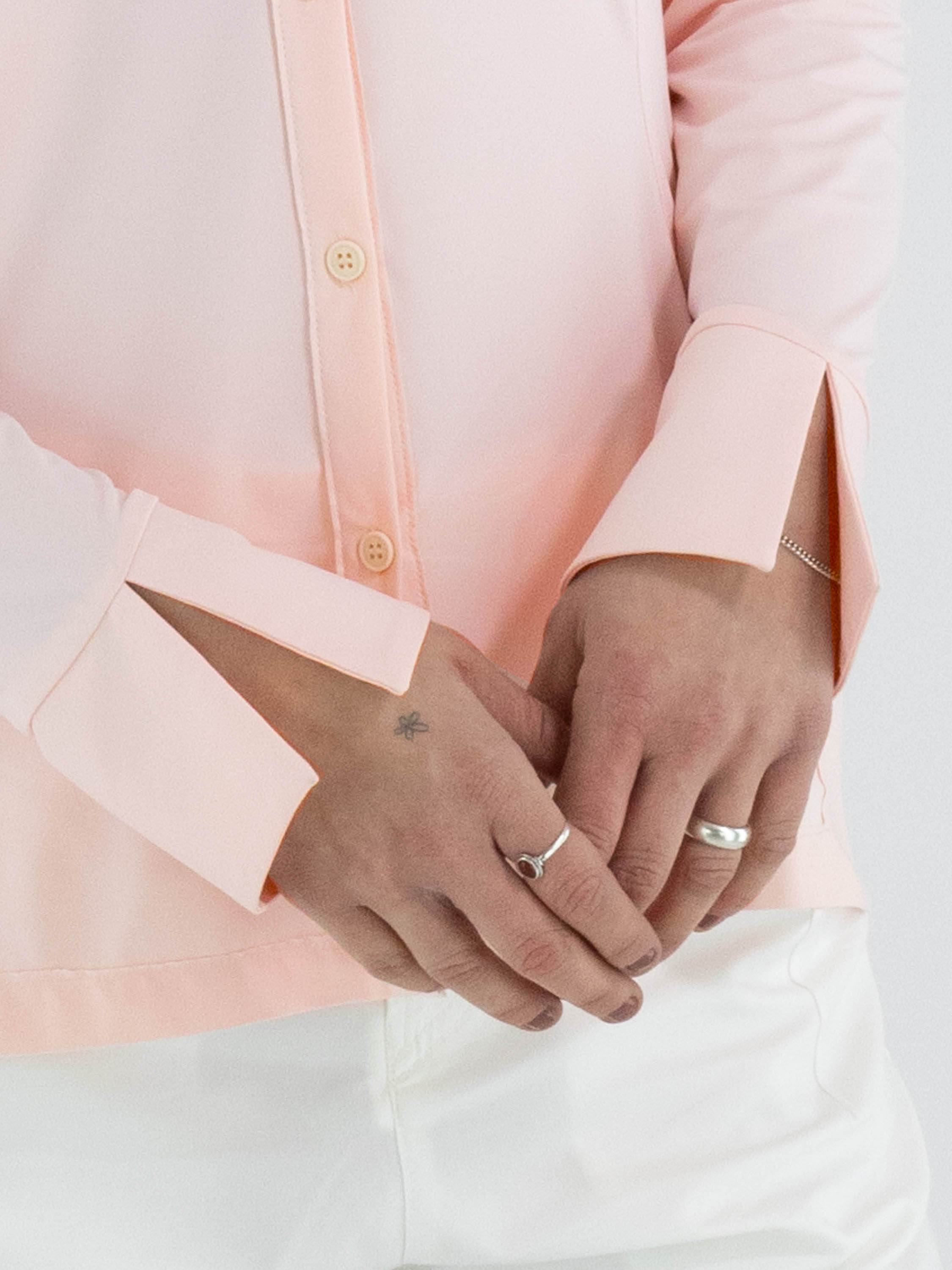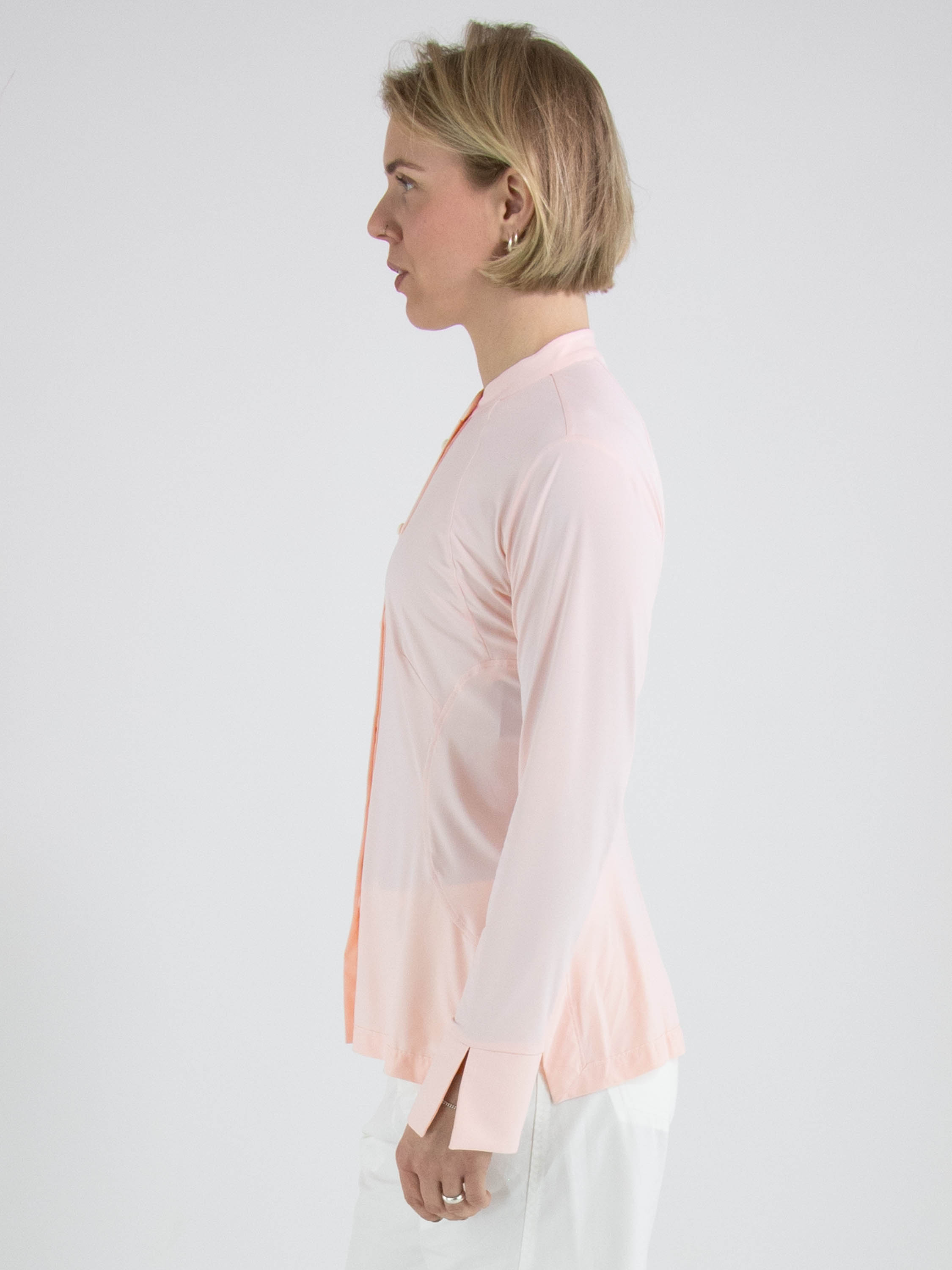 Une blouse de High Lab de couleur rose pastel. La blouse est légèrement cintrée et ne possède pas de col. En bas, une petite fente est présente de chaque côté. Cette blouse peut être lavée à la main.