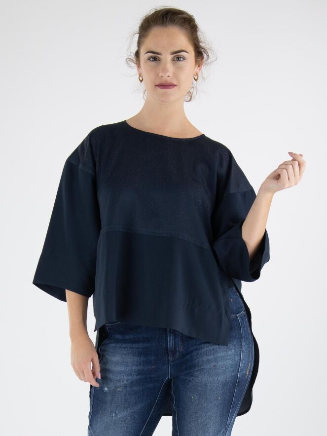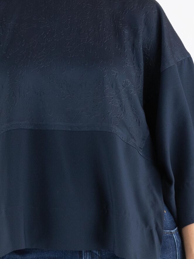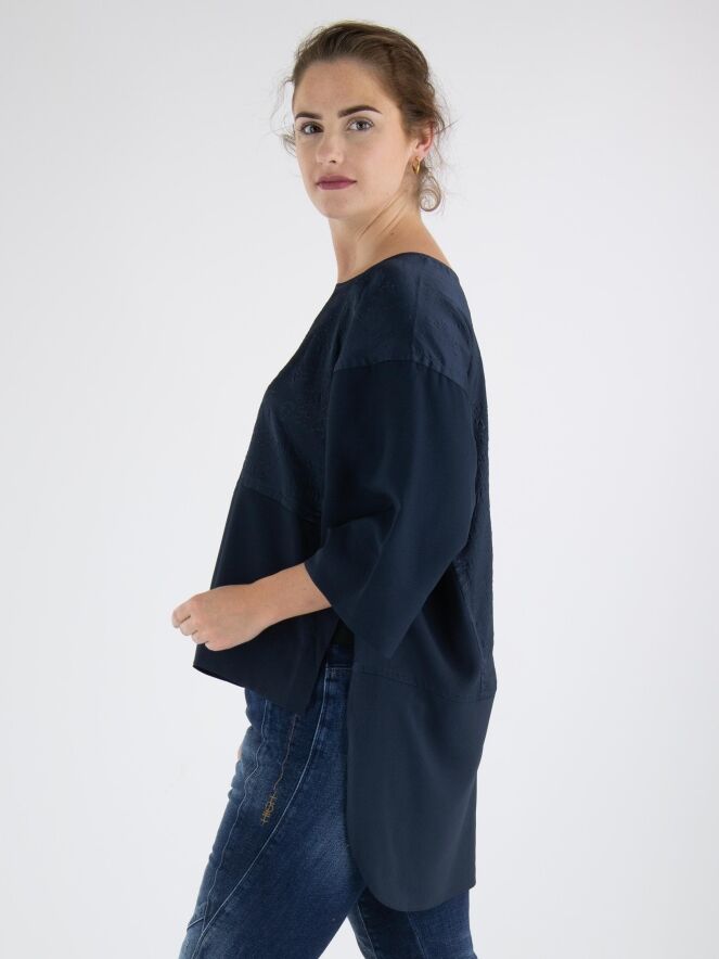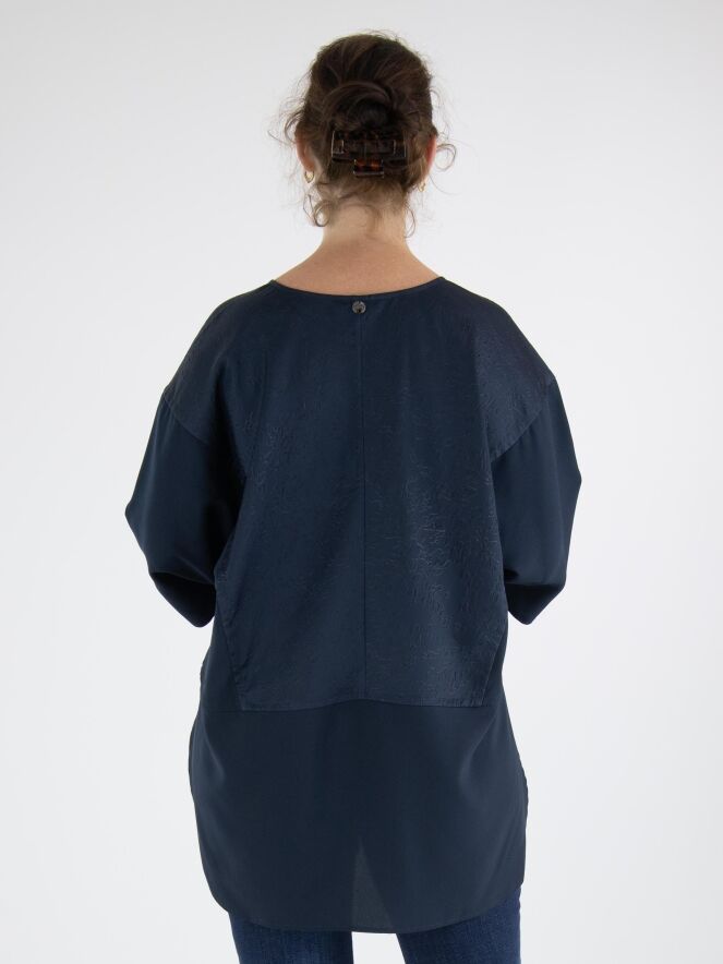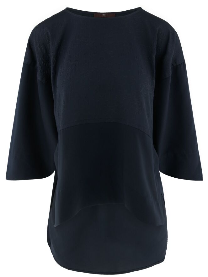 Un shirt large de High en bleu marine. Jusqu'à la taille, le shirt présente un tissu avec une impression en relief graphique, en dessous duquel le tissu est uni et lisse. À partir de la taille, les côtés sont ouverts. Ce shirt peut être lavé à 30 degrés.