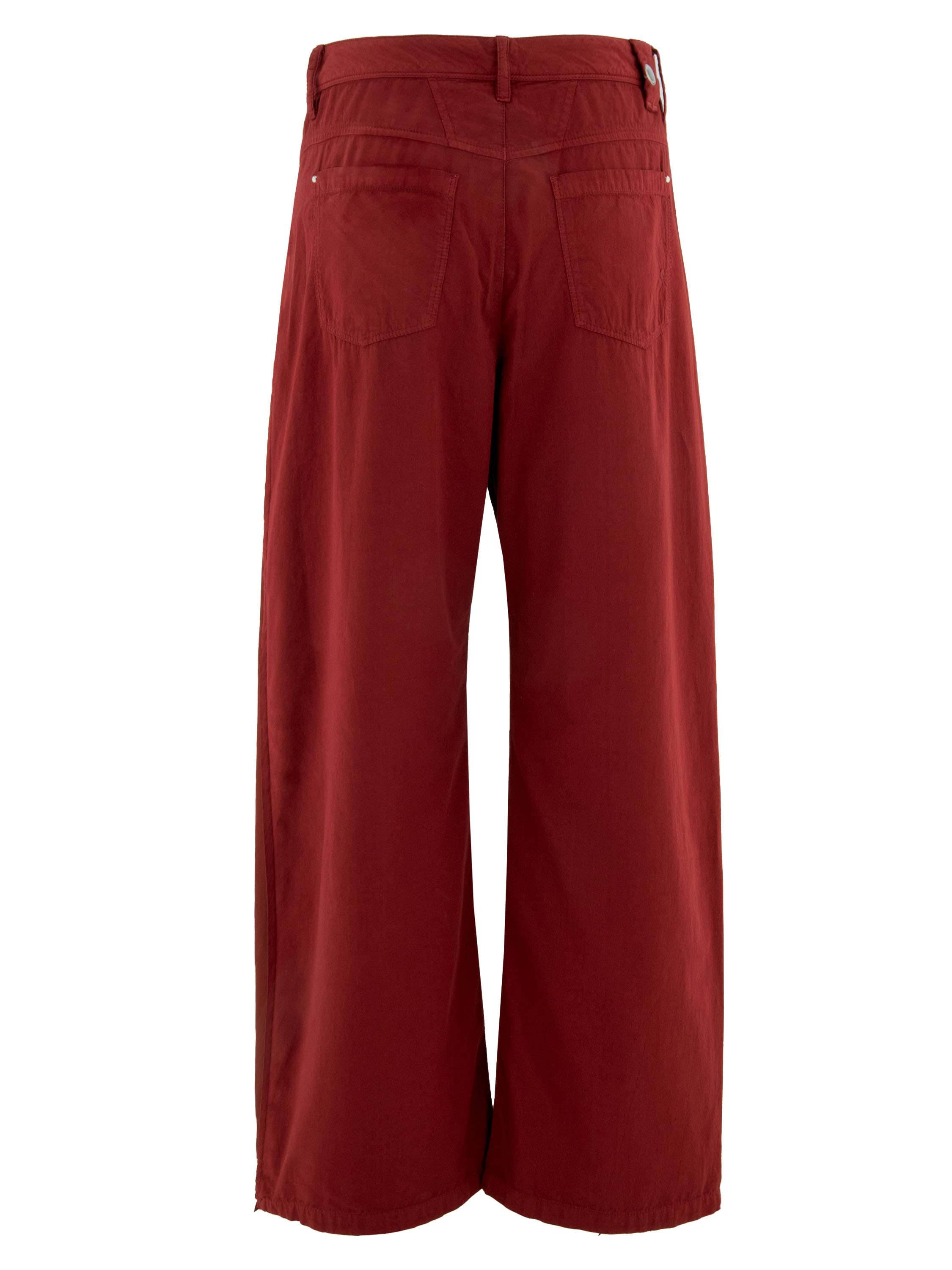 Pantalon de High dans une teinte rouge intense. Le long des côtés, de la hanche jusqu’à l’ourlet, un empiècement en satin mat est intégré, se révélant subtilement au mouvement et créant un contraste raffiné. Ce pantalon de créateur exclusif doit être lavé à la main.