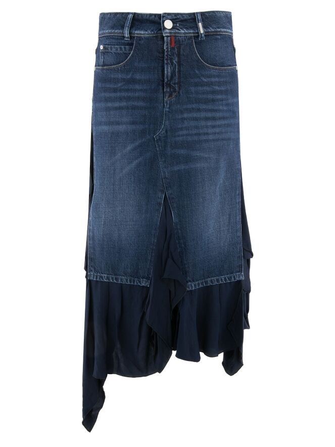 Jupe en denim de High dans une teinte denim foncé. La taille est conçue dans un style classique à 5 poches. À partir des hanches, des empiècements en tissu bleu marine au fini mat légèrement brillant sont insérés sur les côtés et finement plissés. À l’avant comme à l’arrière, ce détail se prolonge au centre à partir du niveau des genoux, créant un effet dynamique et contemporain. Cette jupe doit être lavée à la main.