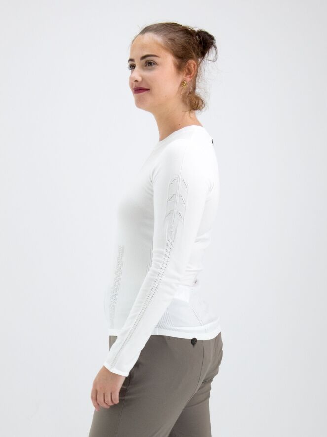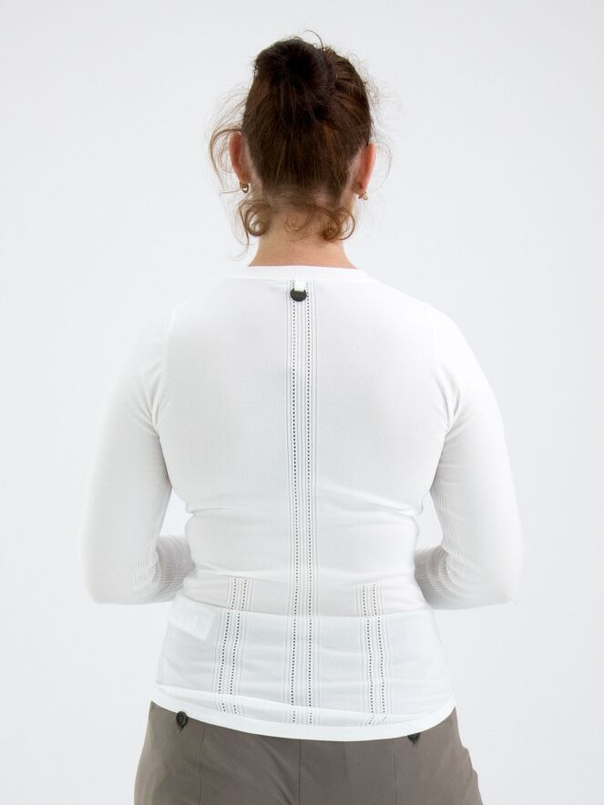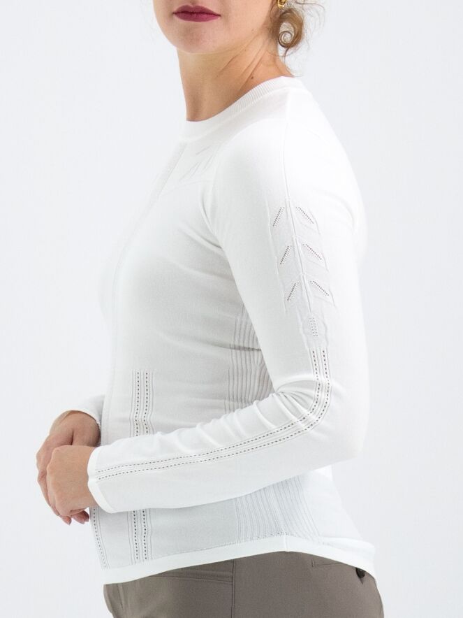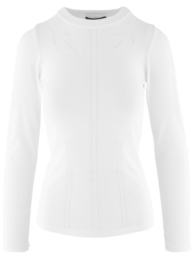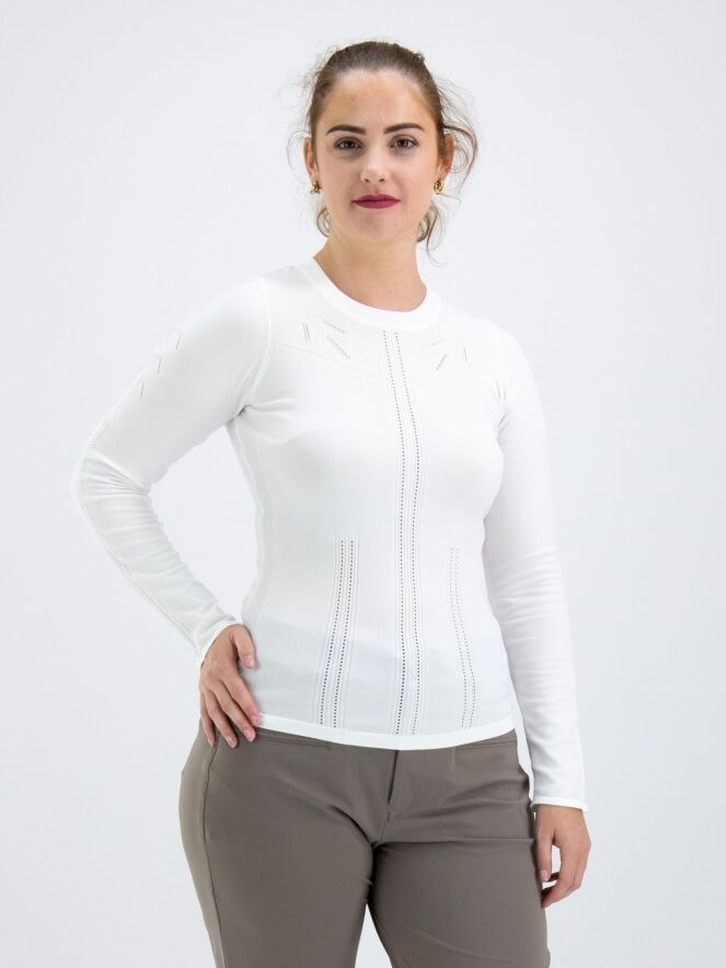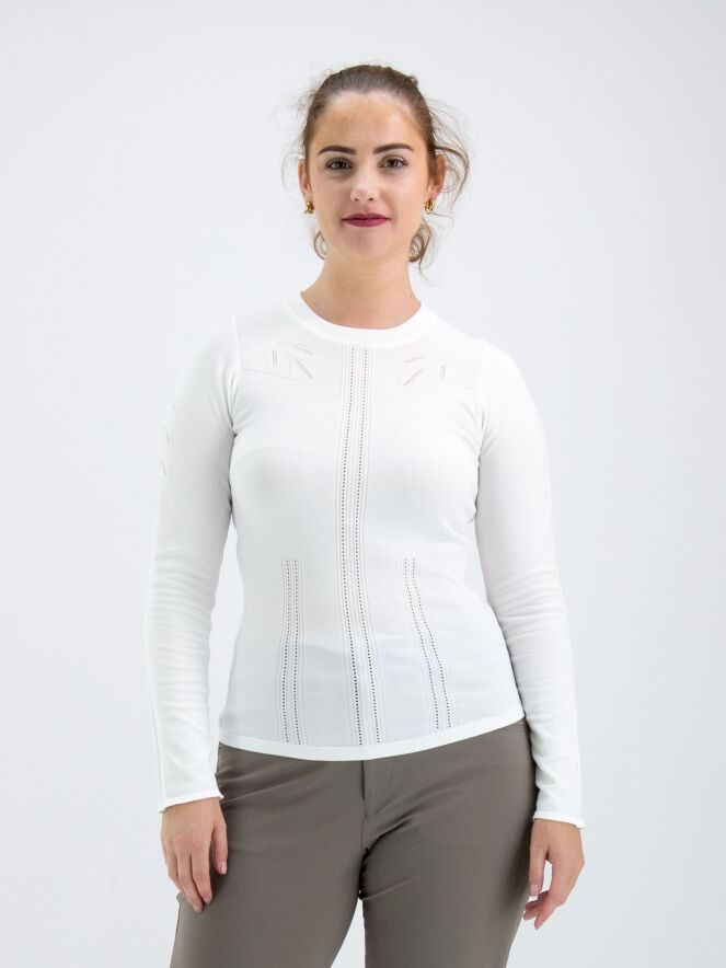 Un chemisier de High en blanc crème. Le long du bord du col rond haut, il y a un bord en tricot finement côtelé. Au-dessus de la poitrine, un motif de feuilles est tissé avec des lignes ajourées dans les feuilles. Depuis le col, au centre, il y a une double ligne ajourée accompagnée d'un tissu finement côtelé. Ce chemisier peut être lavé à la main.