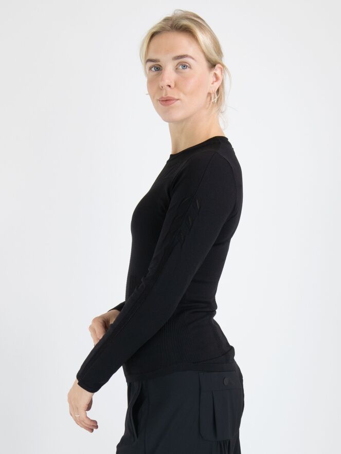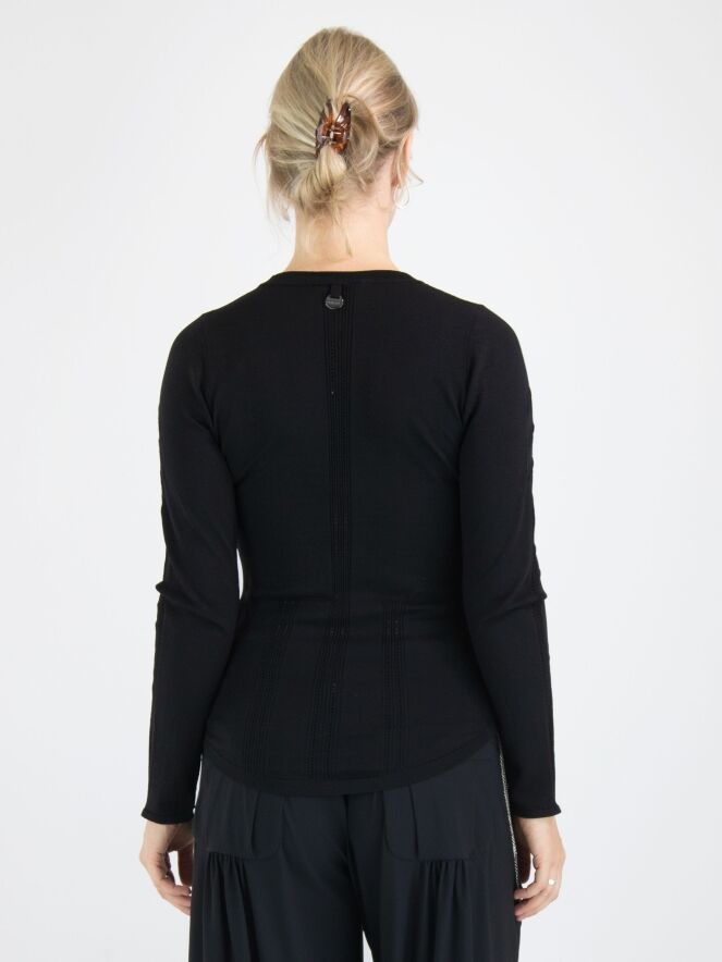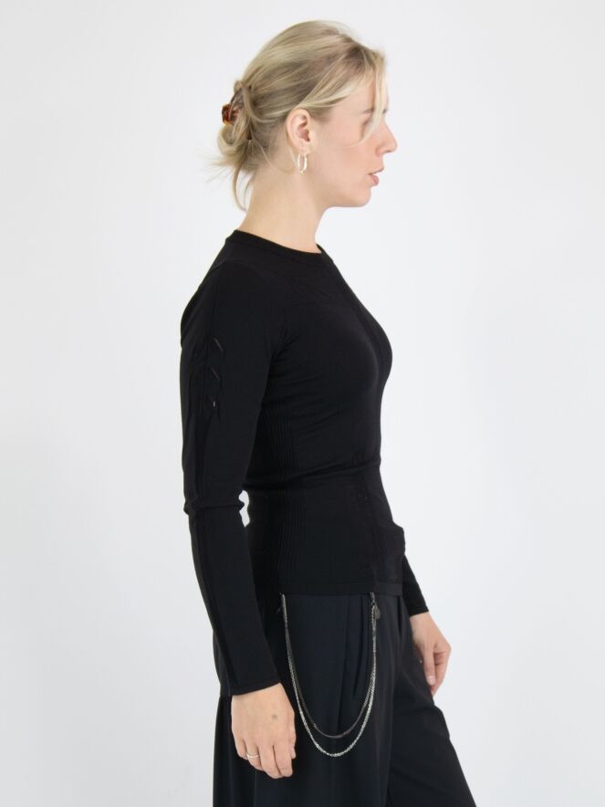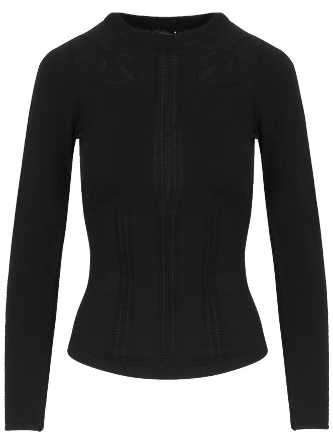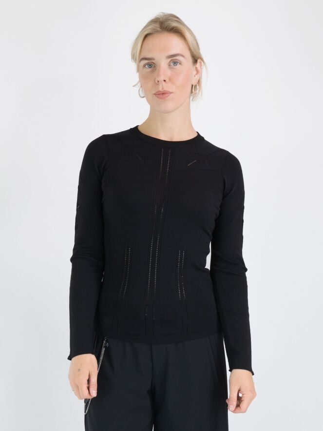 Un chemisier de High en noir. Le long du bord du col rond et haut, il y a un bord en tricot finement côtelé. Au-dessus de la poitrine, un motif de feuilles est tissé avec des lignes ajourées dans les feuilles. Depuis le col, il y a une double ligne ajourée au centre, accompagnée de tissu finement côtelé. Ce chemisier peut être lavé à la main.