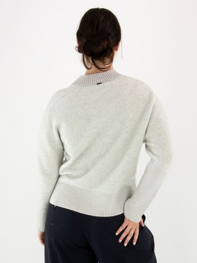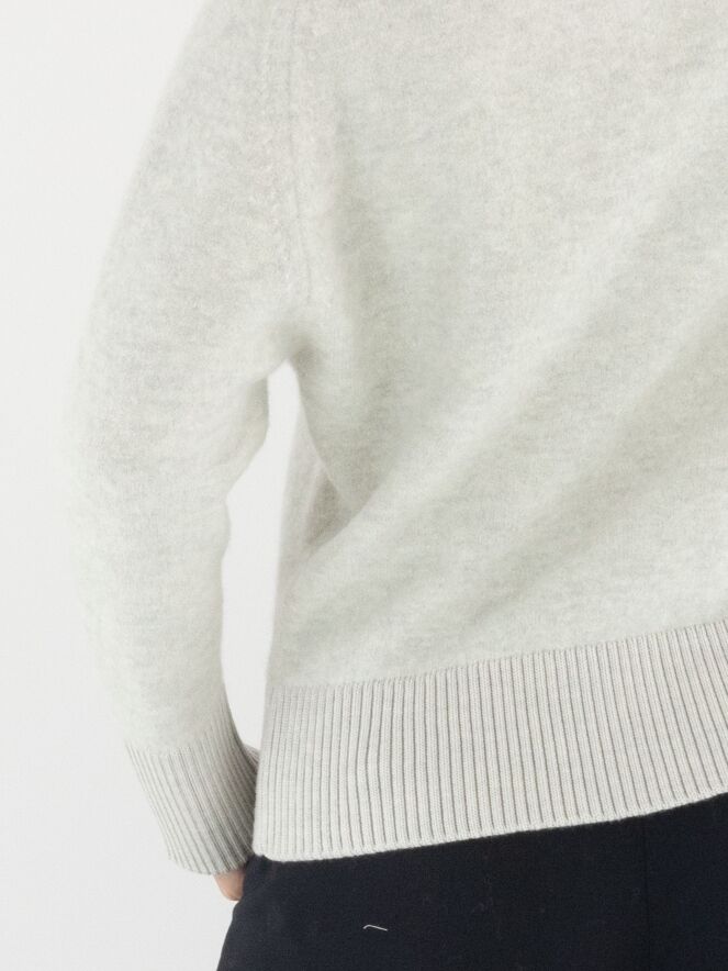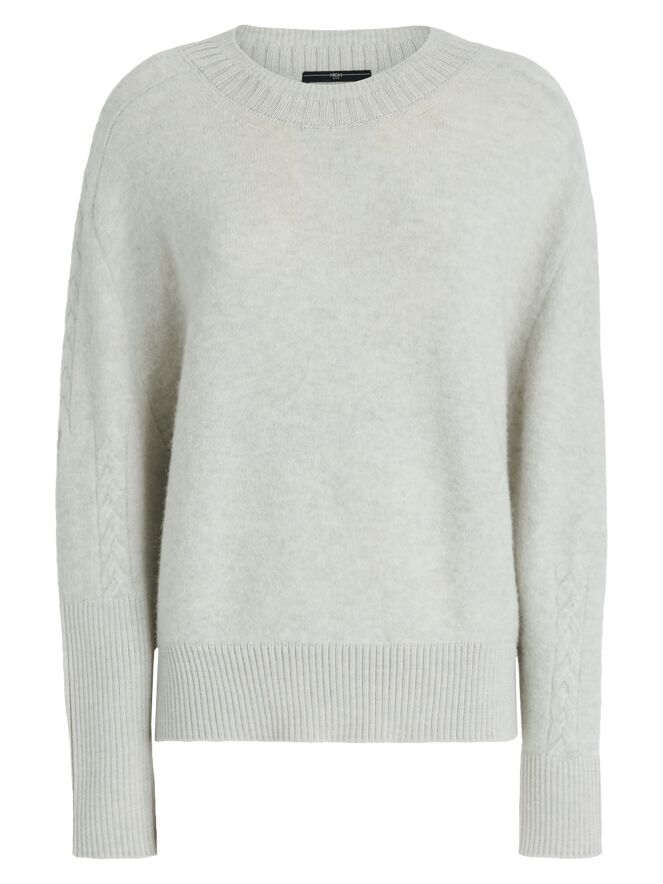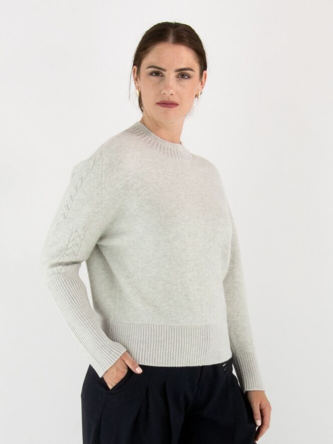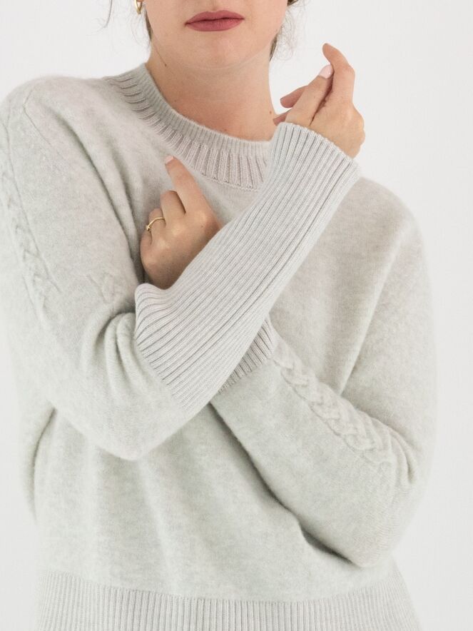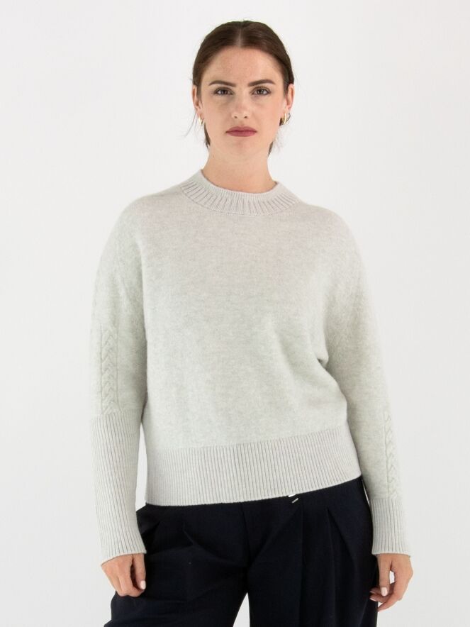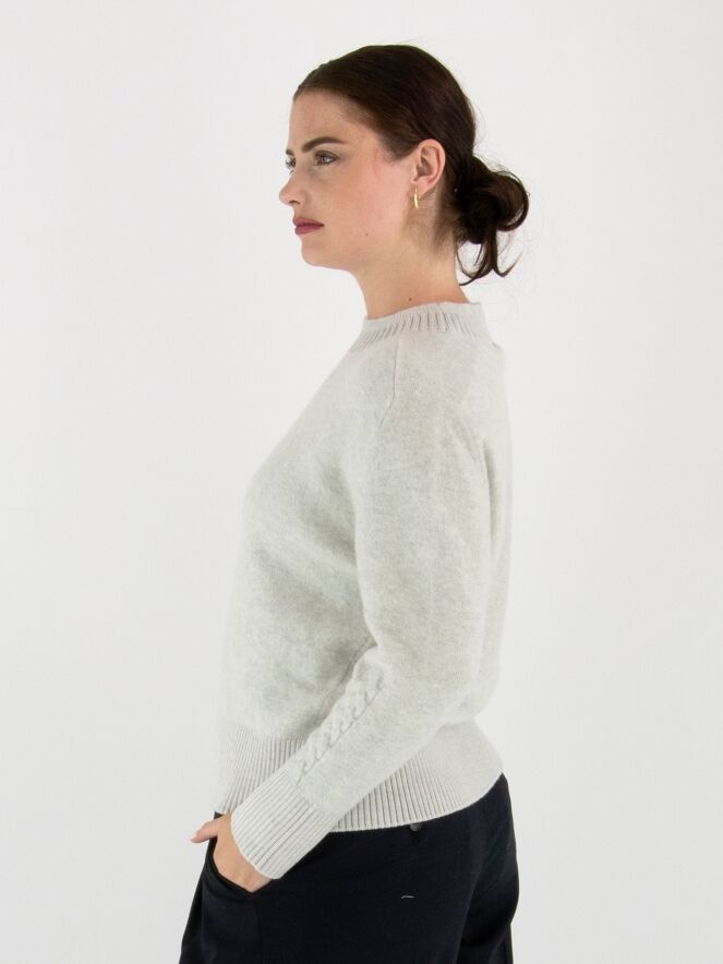 Un pull chiné de la marque High en gris clair. L’encolure ronde est bordée d’un fin bord-côte. Les poignets et le bas du pull présentent une finition en maille côtelée. Un motif torsadé part des épaules et se prolonge partiellement sur les manches. Ce pull doit être lavé à la main.