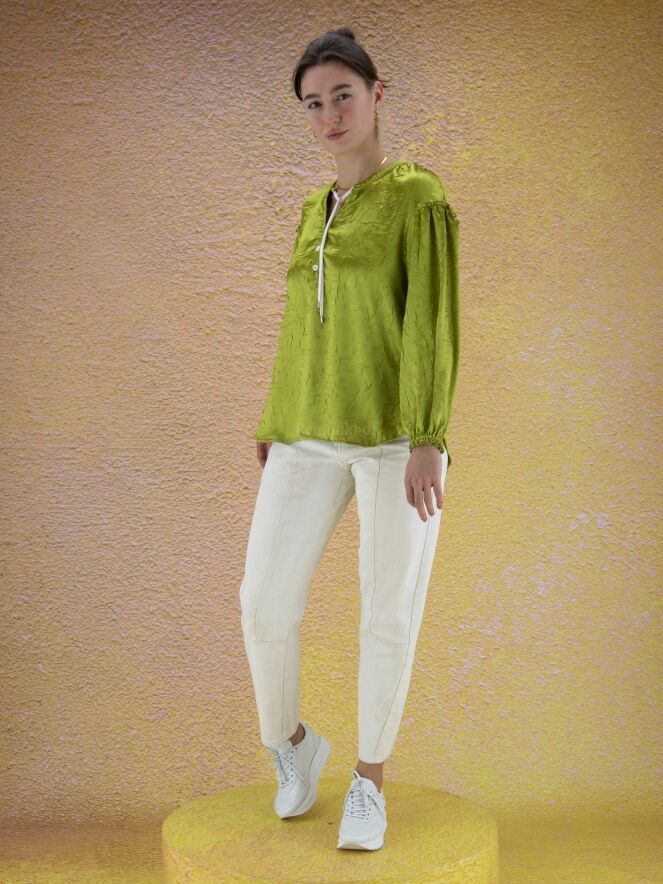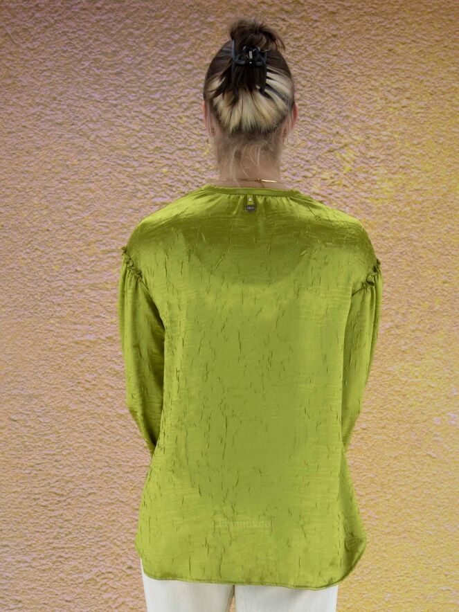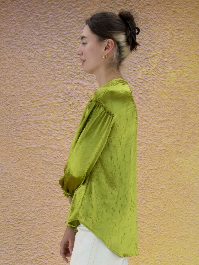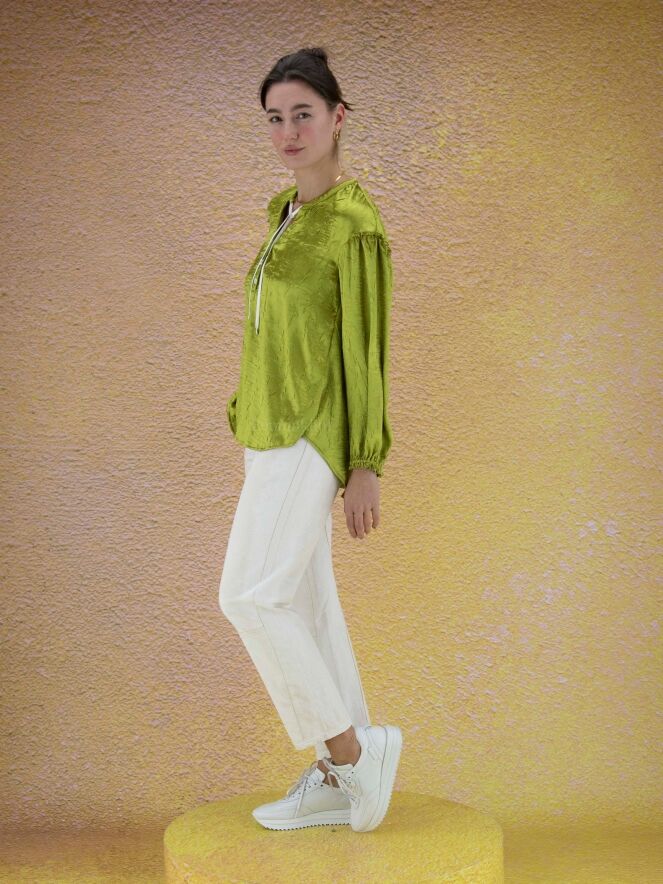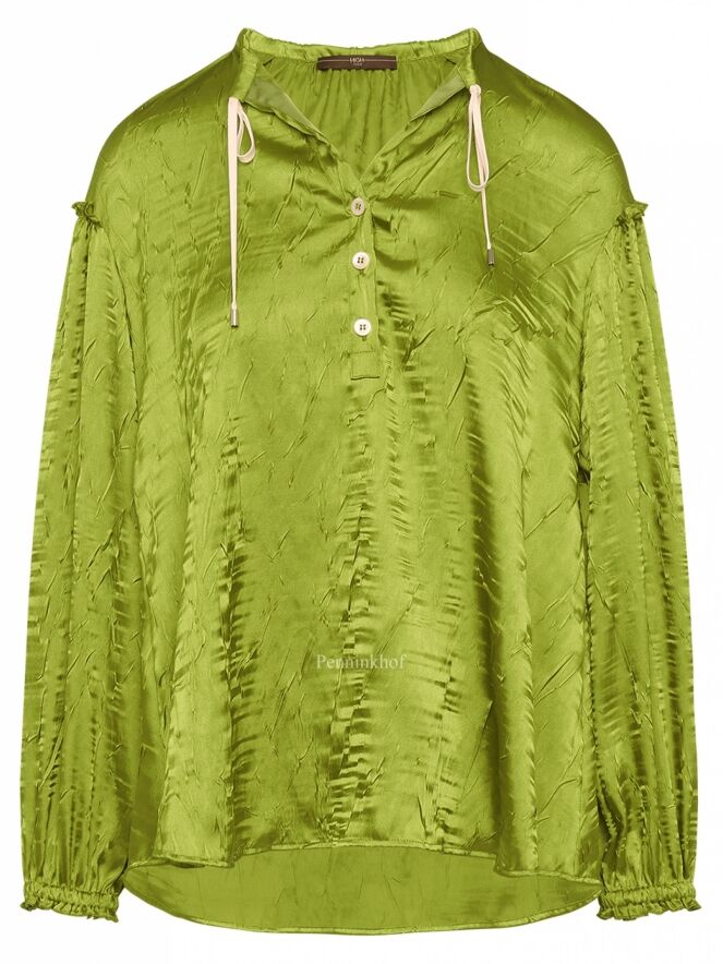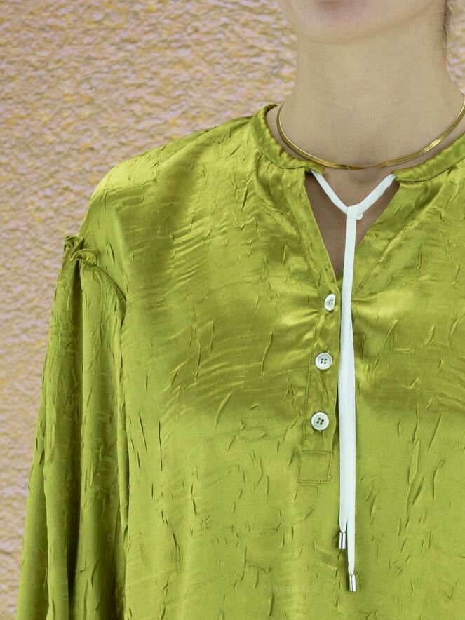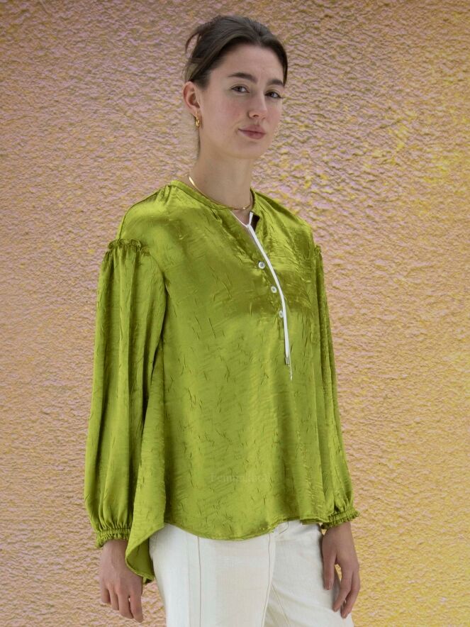 Chemisier ample de la marque High, en satin froncé à ondulation de couleur verte. Le chemisier présente un large col avec un cordon blanc de réglage. Une bordure élastique finement plissée ferme les poignets. Lavage à la main.