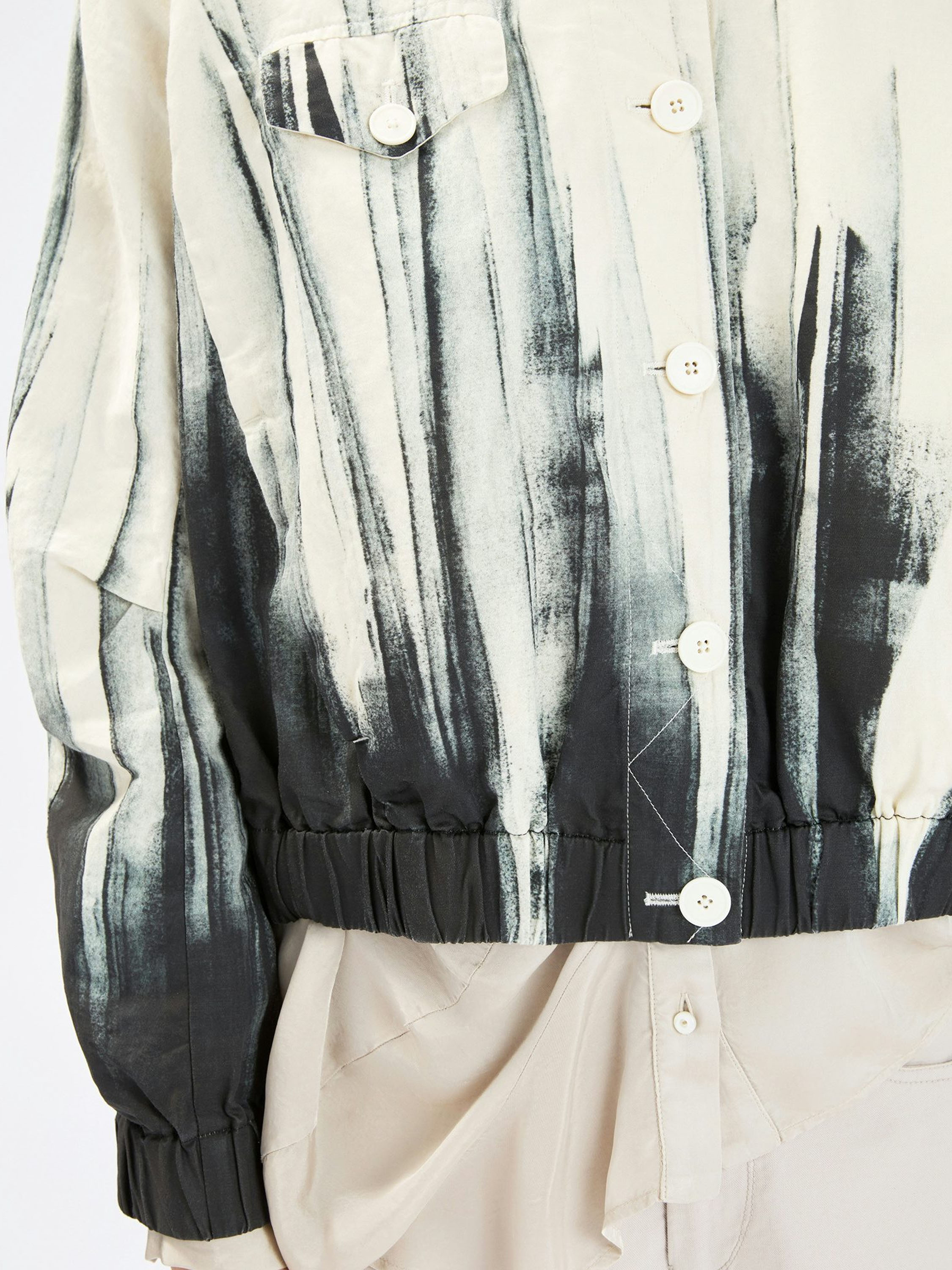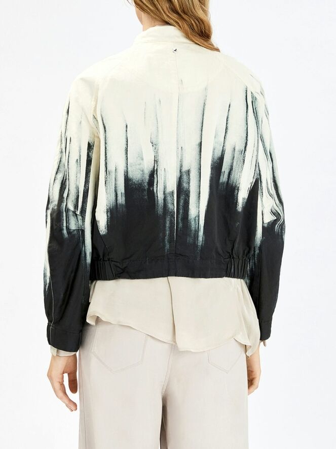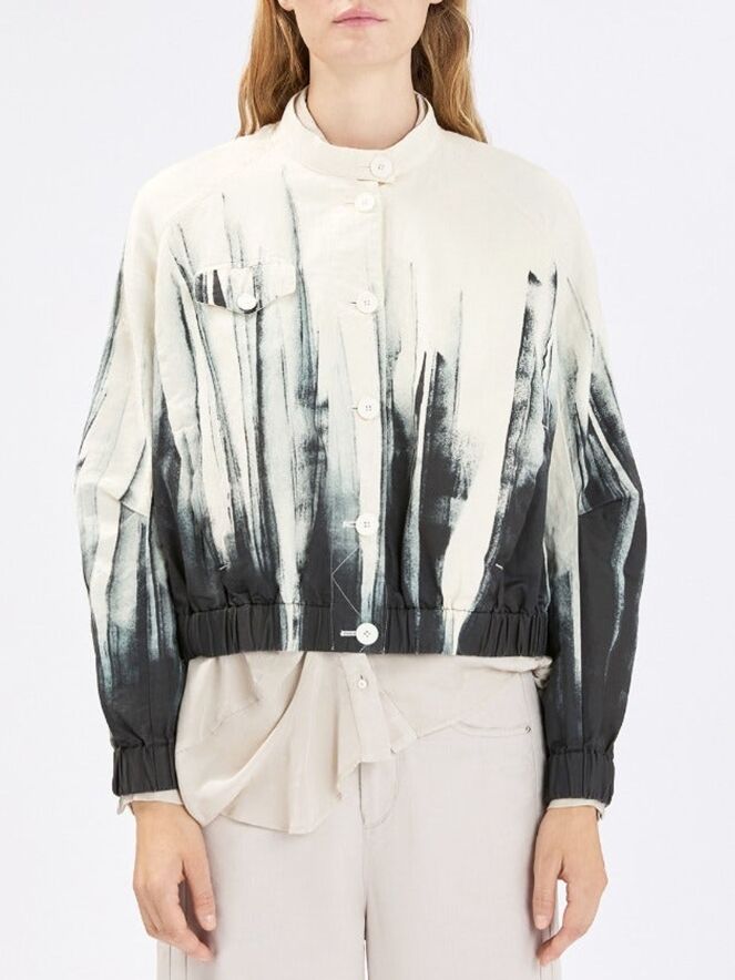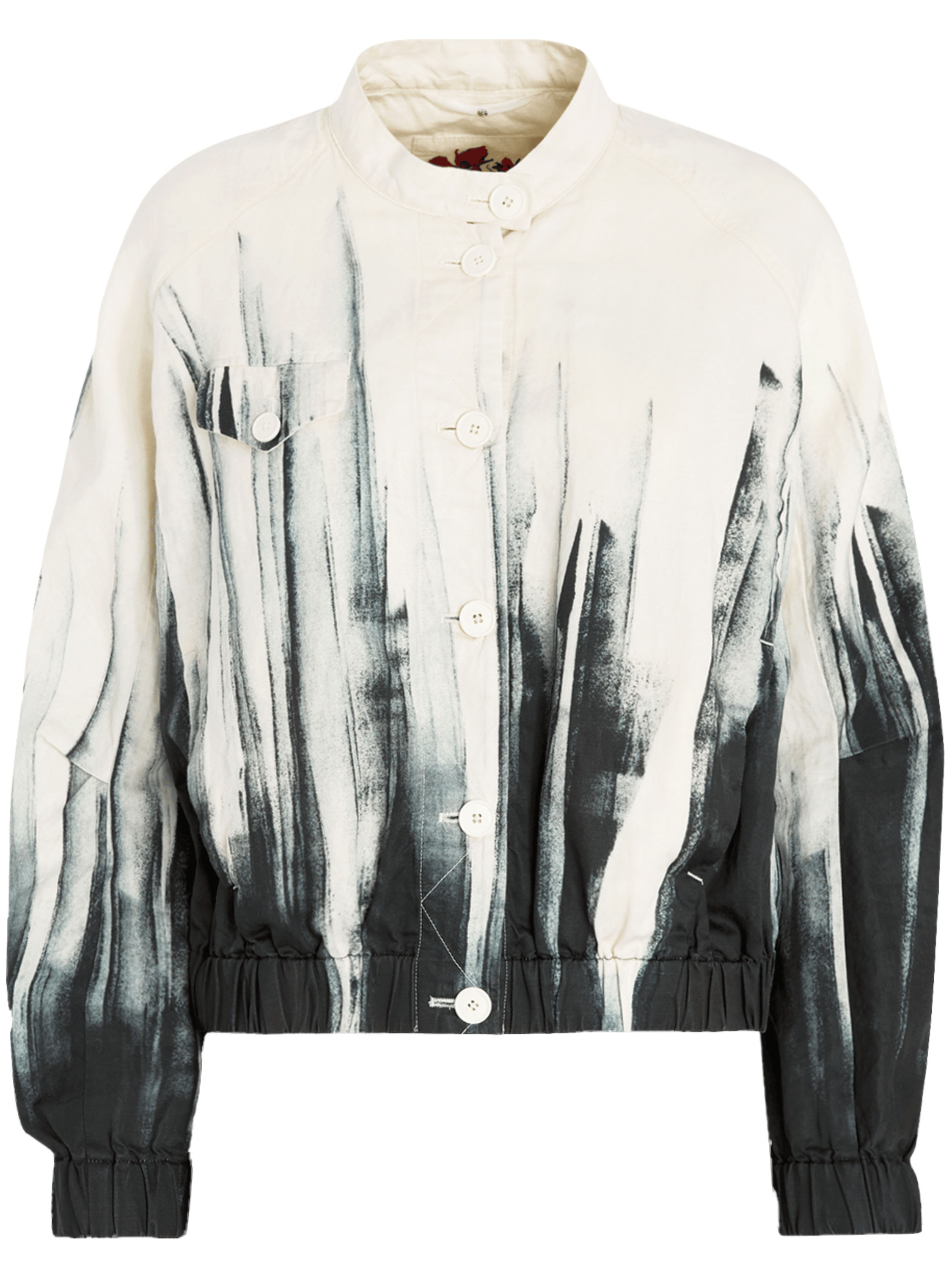 Blazer court de High avec un imprimé artistique effet peinture en blanc crème et noir. L’effet noir s’élève depuis le bas vers le haut, apportant un caractère audacieux et contemporain au modèle. Fermé par six boutons et doté de poches à hauteur de taille, il est terminé par un ourlet élastique finement plissé pour une touche moderne. Ce blazer de créateur exclusif ne doit pas être lavé.