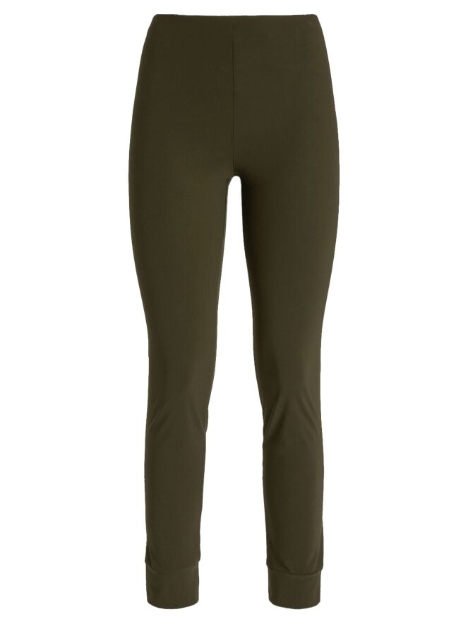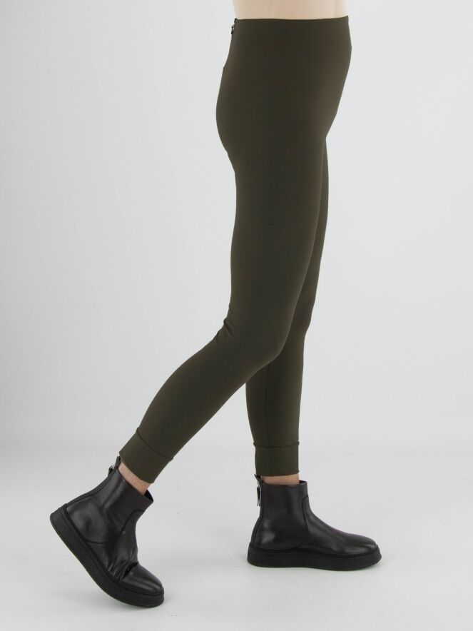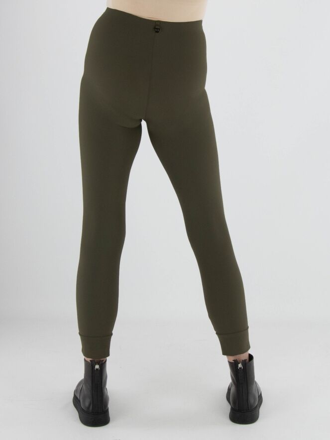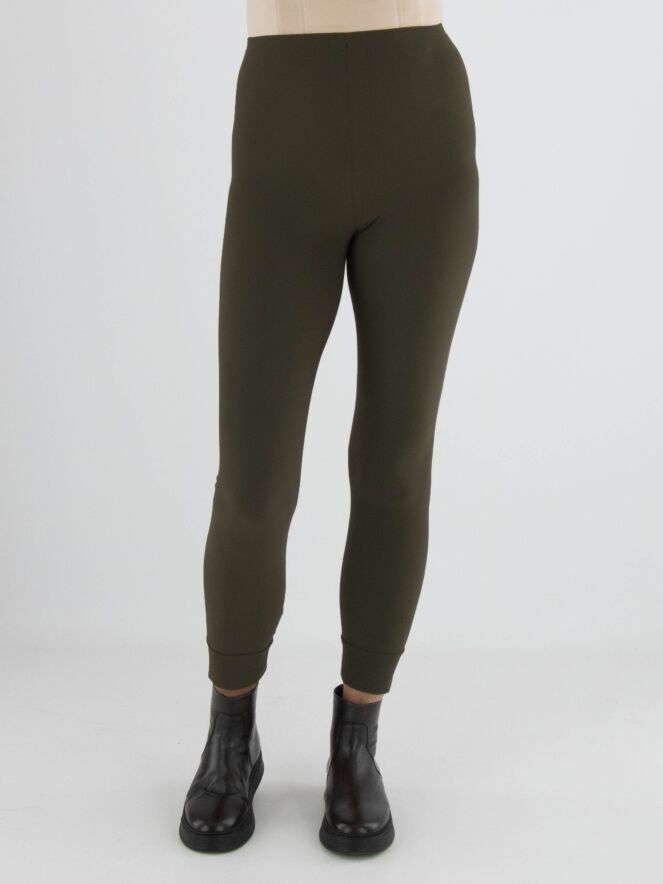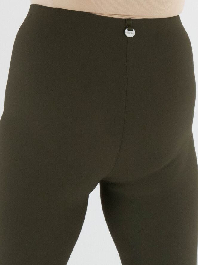 Un legging de la marque High en vert olive. La taille est élastiquée. En bas, une large bande avec une couture décorative. Ce legging peut être lavé à 30 degrés.