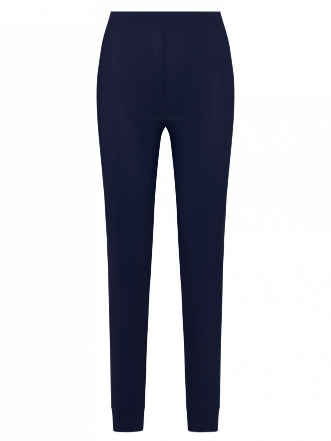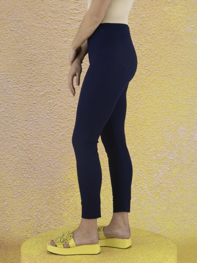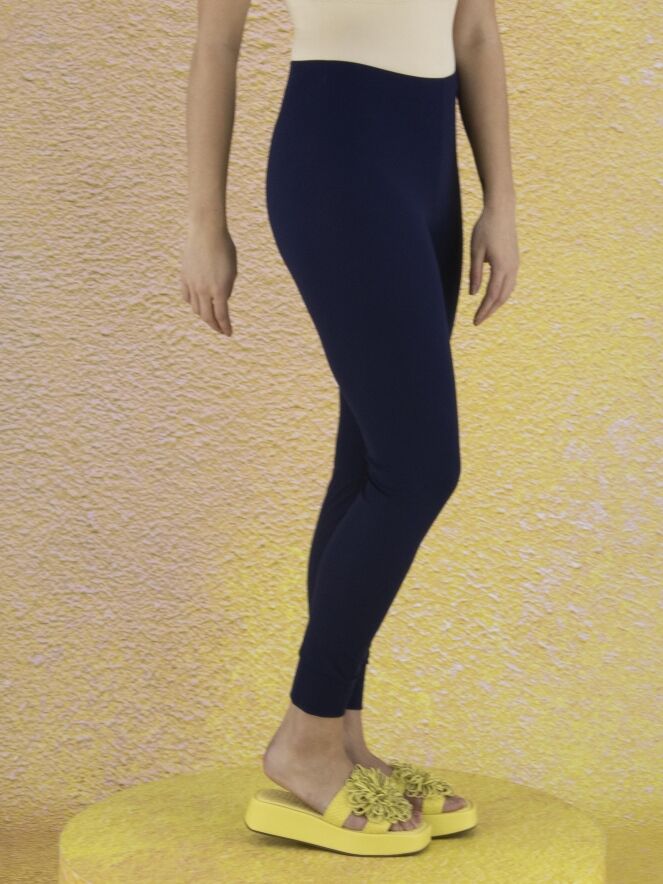 Leggings de la marque High, de couleur bleu marine. Une bande élastique équipe la taille. Une large planche est présente au bas des jambes. Lavage à 30 degrés.