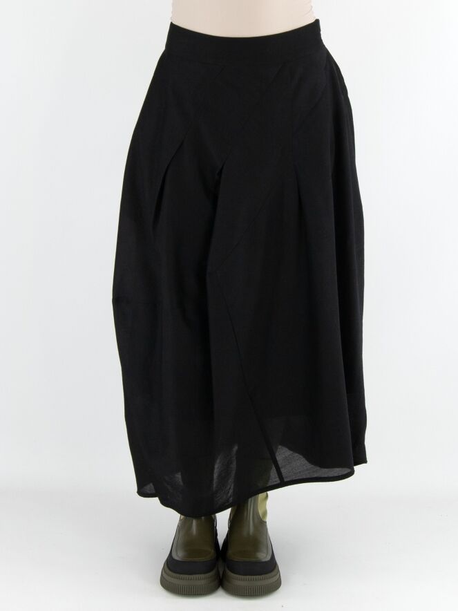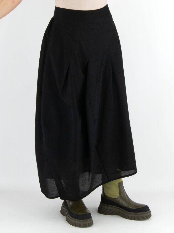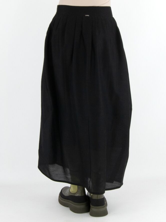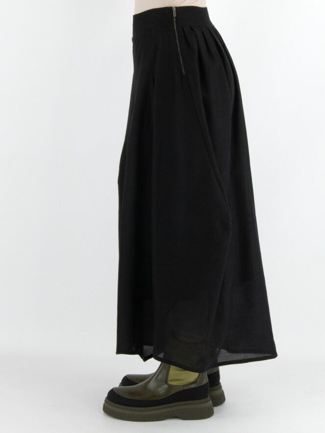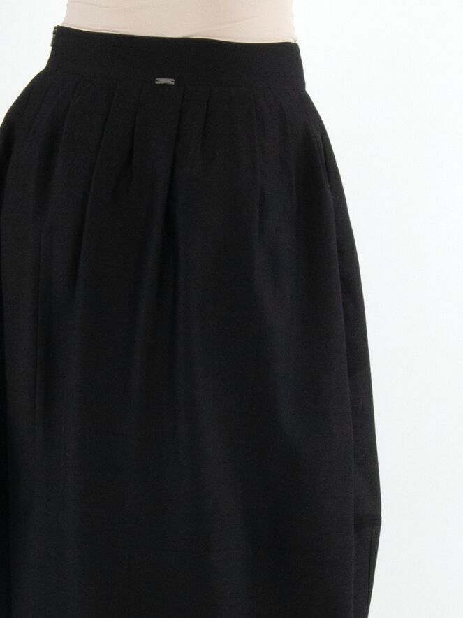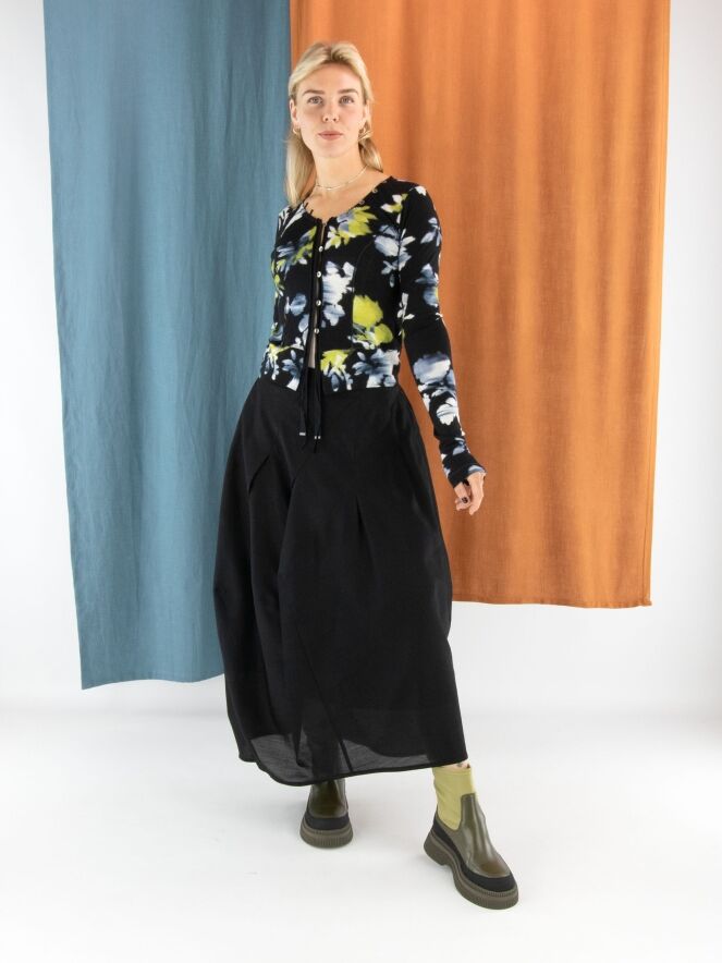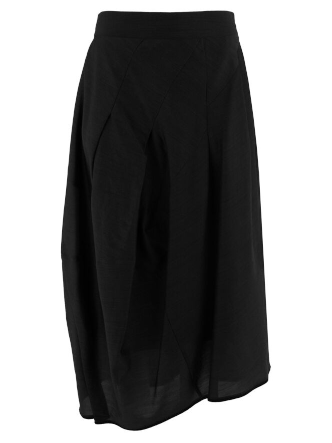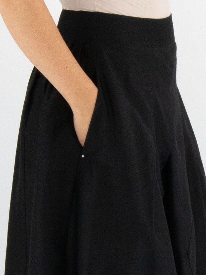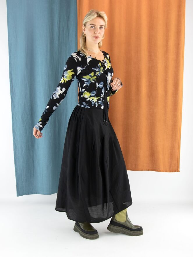 Jupe en satin mat de la marque High dans deux nuances de noir. Sous la ceinture, plusieurs coutures diagonales sont agrémentées de quelques plis. La jupe a une coupe évasée en A et une poche sur le côté droit, juste sous la taille. Cette jupe ne doit pas être lavée.