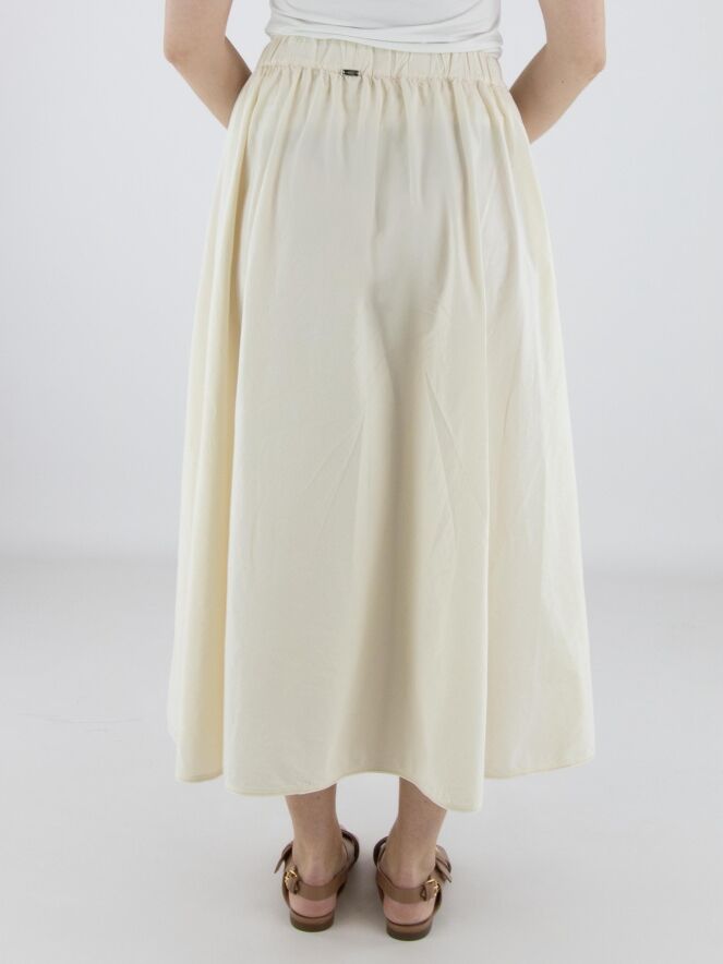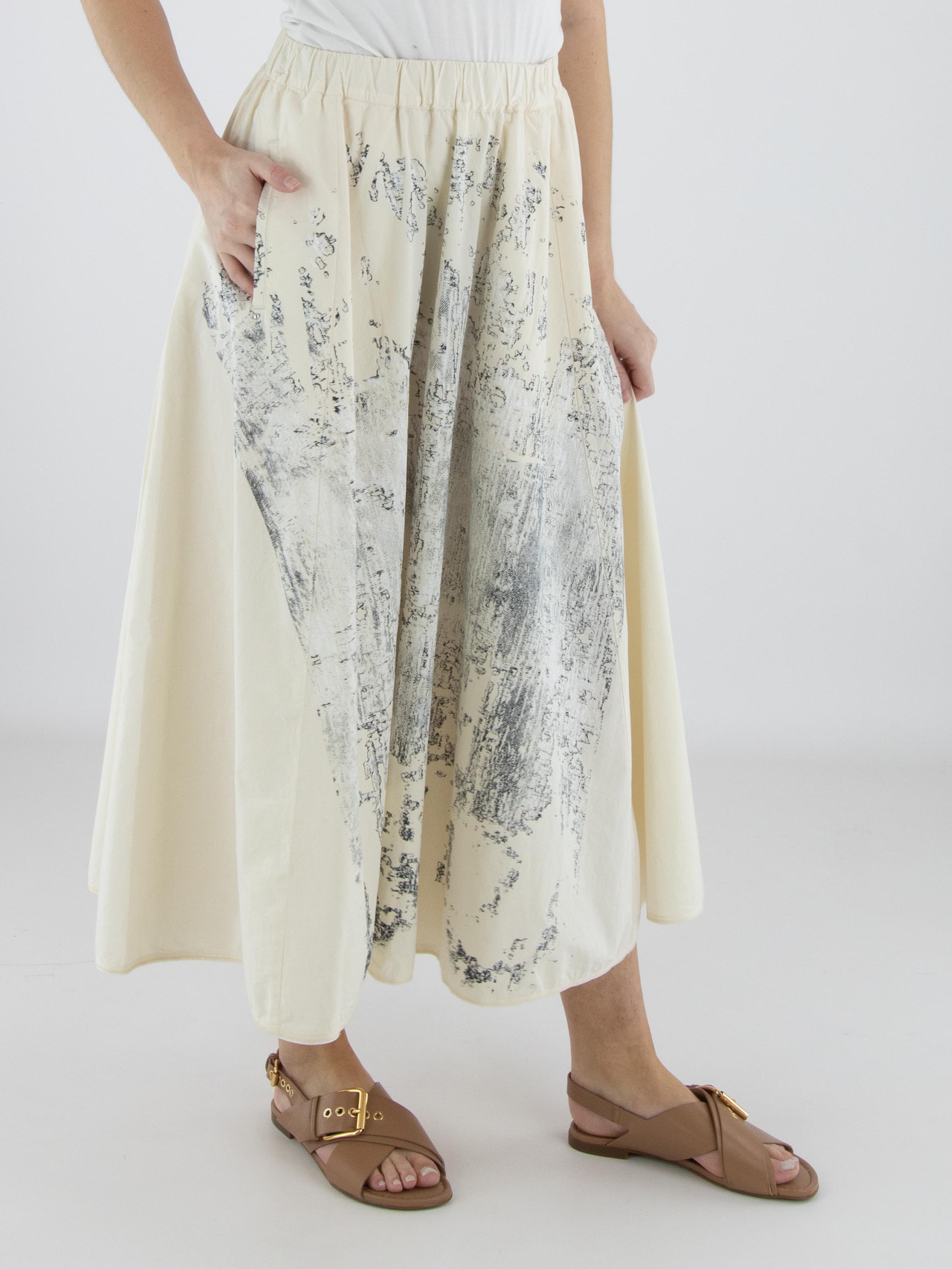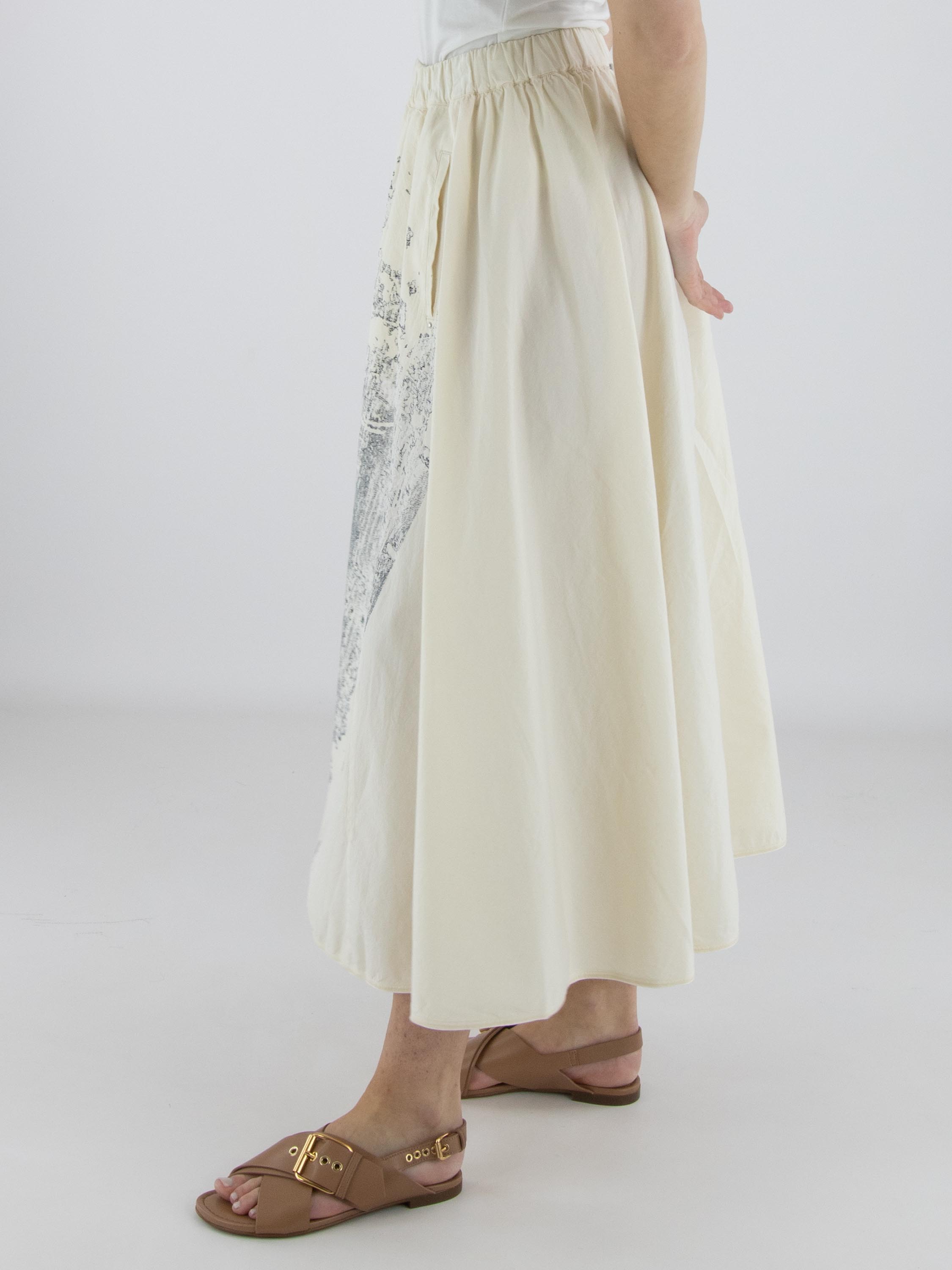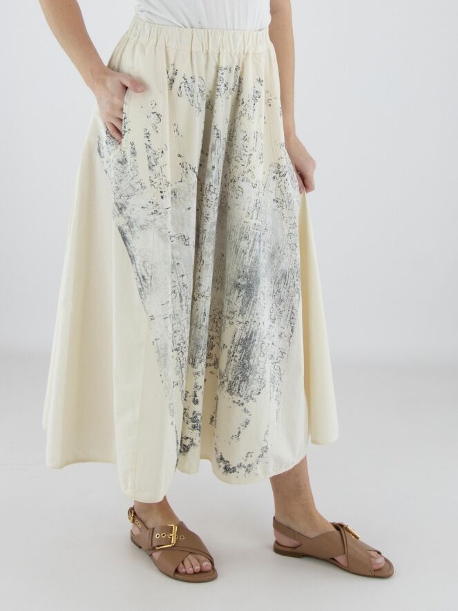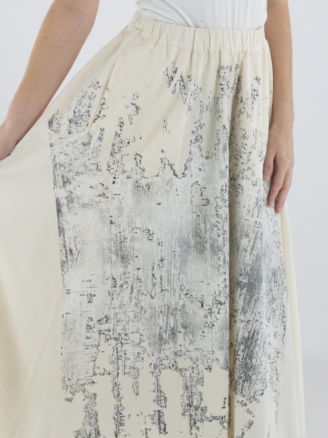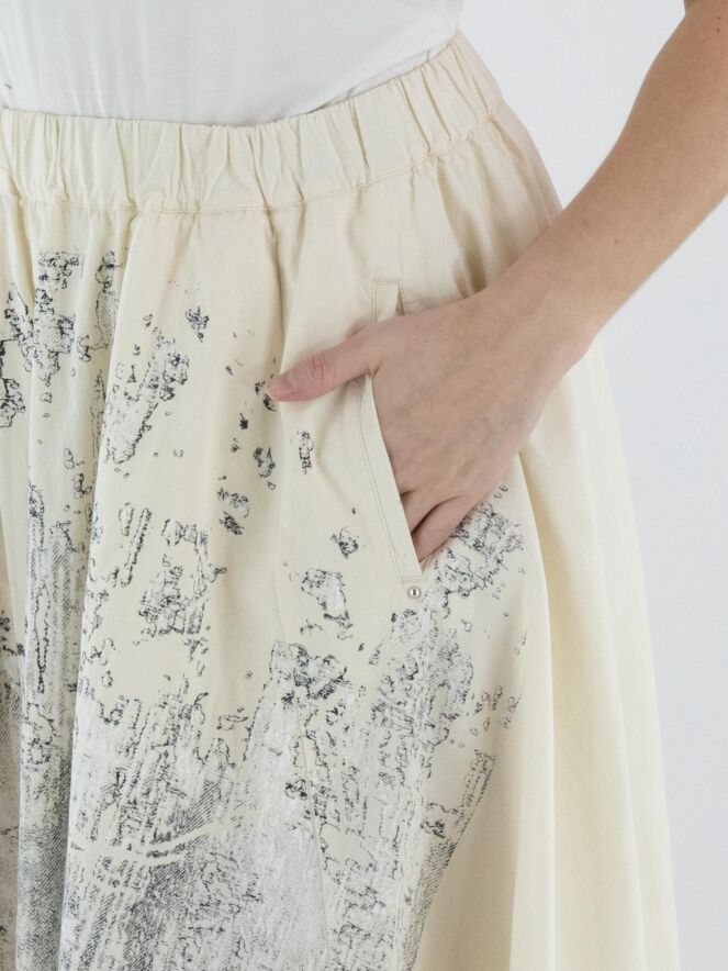 Jupe de High avec un imprimé graphique à l’avant dans plusieurs nuances de blanc et de noir sur fond blanc crème. L’arrière est réalisé dans un tissu uni blanc crème, créant un contraste élégant. La taille est dotée d’une ceinture élastique finement plissée pour un confort optimal. La jupe possède des poches latérales, n’est pas doublée et doit être lavée à la main.